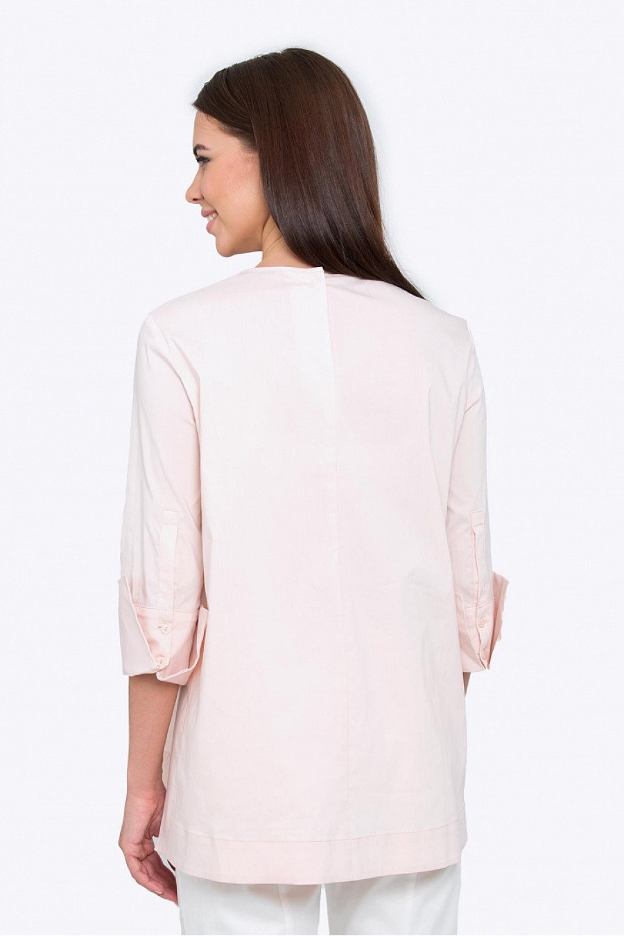 Блузка свободного кроя с разрезами по бокам и асимметричным низом. Рукава 3/4 с широкими манжетами. Модель не сковывает движения и позволит создать стильный образ.