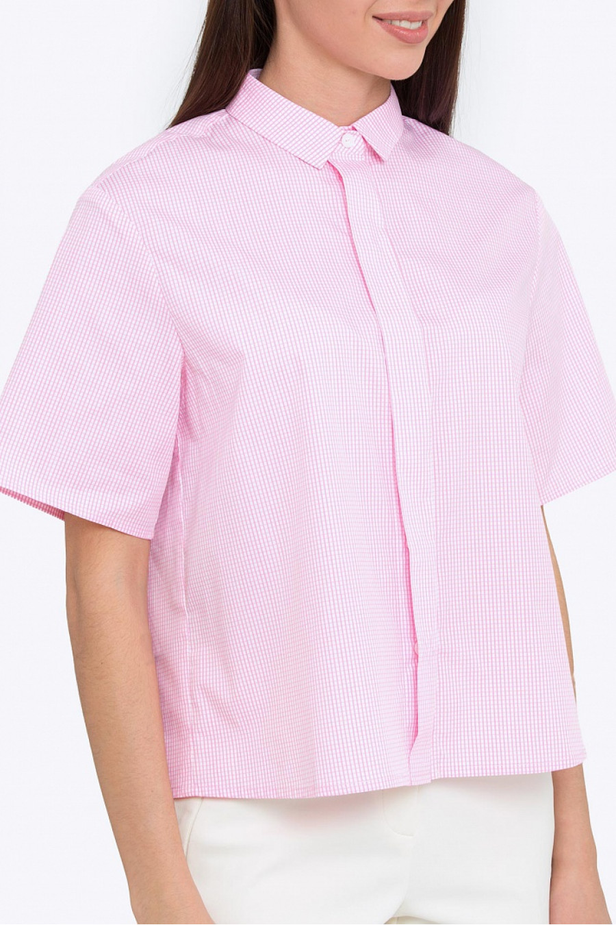 Женская рубашка свободного кроя, с короткими рукавами. Модель выполнена из хлопкового текстиля. Застежка-планка на пуговицах. Универсальная рубашка хорошо сочетается, как к классическим юбкам и брюкам, так и с джинами.