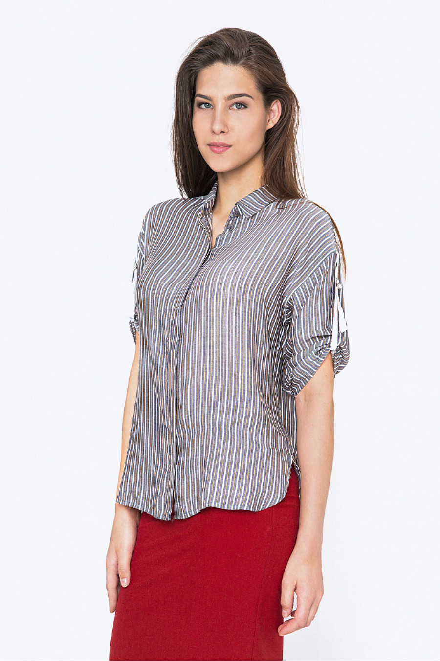 Стильная женская рубашка в полоску, из вискозы. Модель соответствует модным тенденциям этого сезона. Очень стильная и комфортная рубашка. Благодаря свободному крою рубашка хорошо сидит по фигуре, не сковывает движения. Рост фотомодели 175см.