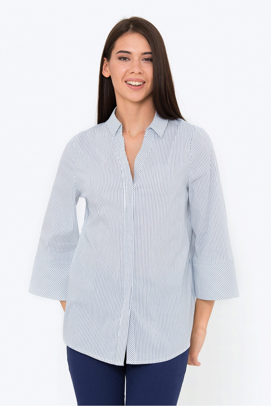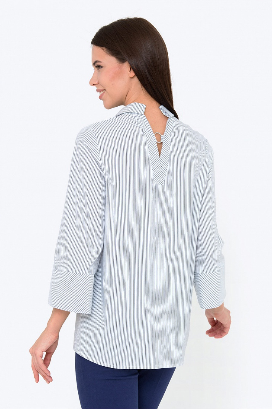 Женская рубашка свободного кроя с V-образным вырезом спереди и сзади. На спинке декоративная отделка. Модель из хлопкового текстиля в тонкую полоску. Рукава 3/4, с широкими манжетами. Рубашка в стиле Casual отличный выбор на каждый день. Рост фотомодели 172см.