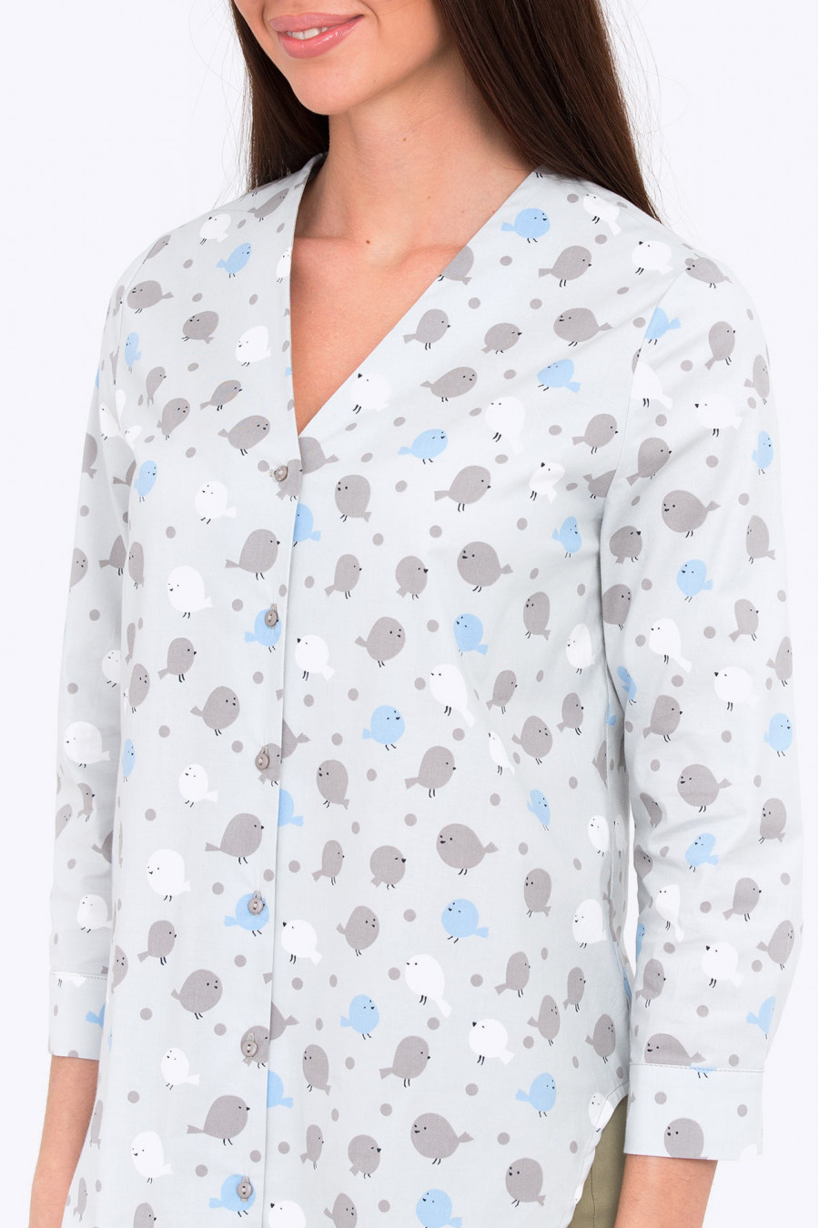 Стильная женская рубашка в стиле Casual. Модель из хлопкового текстиля с приятным по цветовому сочетанию принтом, в виде стилизованных птиц. Рубашка хорошо сидит, комфортная в носке. Отличная модель на каждый день, позволит сделать ваш образ стильным, а за счет пастельных оттенков, вам не составит труда подобрать обувь и аксессуары.