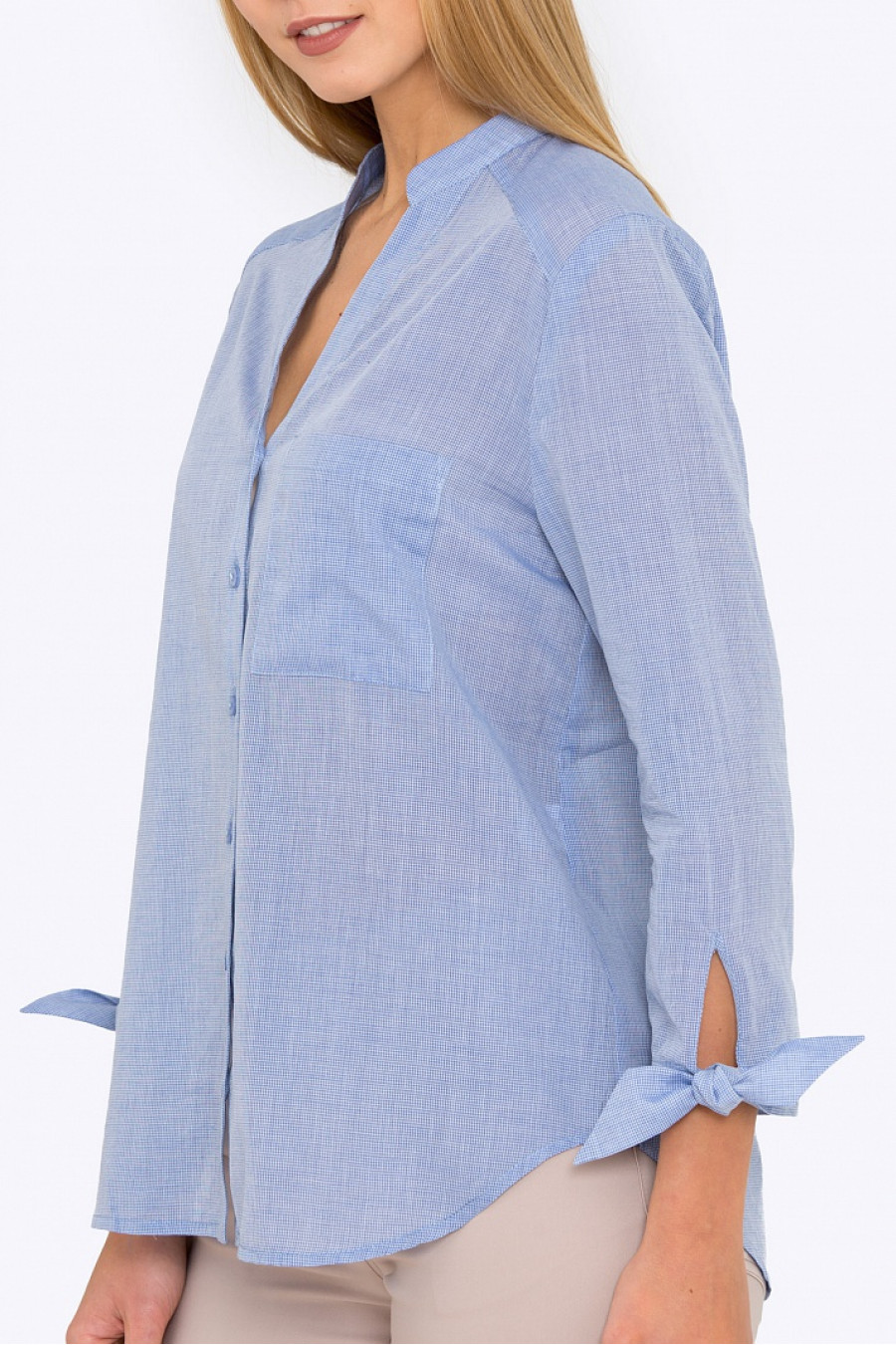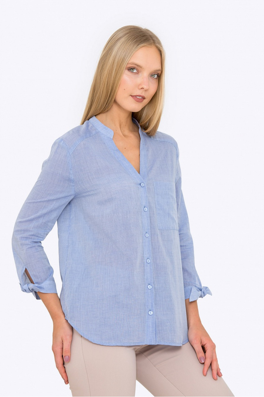 Женская рубашка свободного кроя с V-образным вырезом. Рукава 3/4 c завязками на манжетах. Модель из хлопкового текстиля. Рубашка в стиле Casual отличный выбор на каждый день.