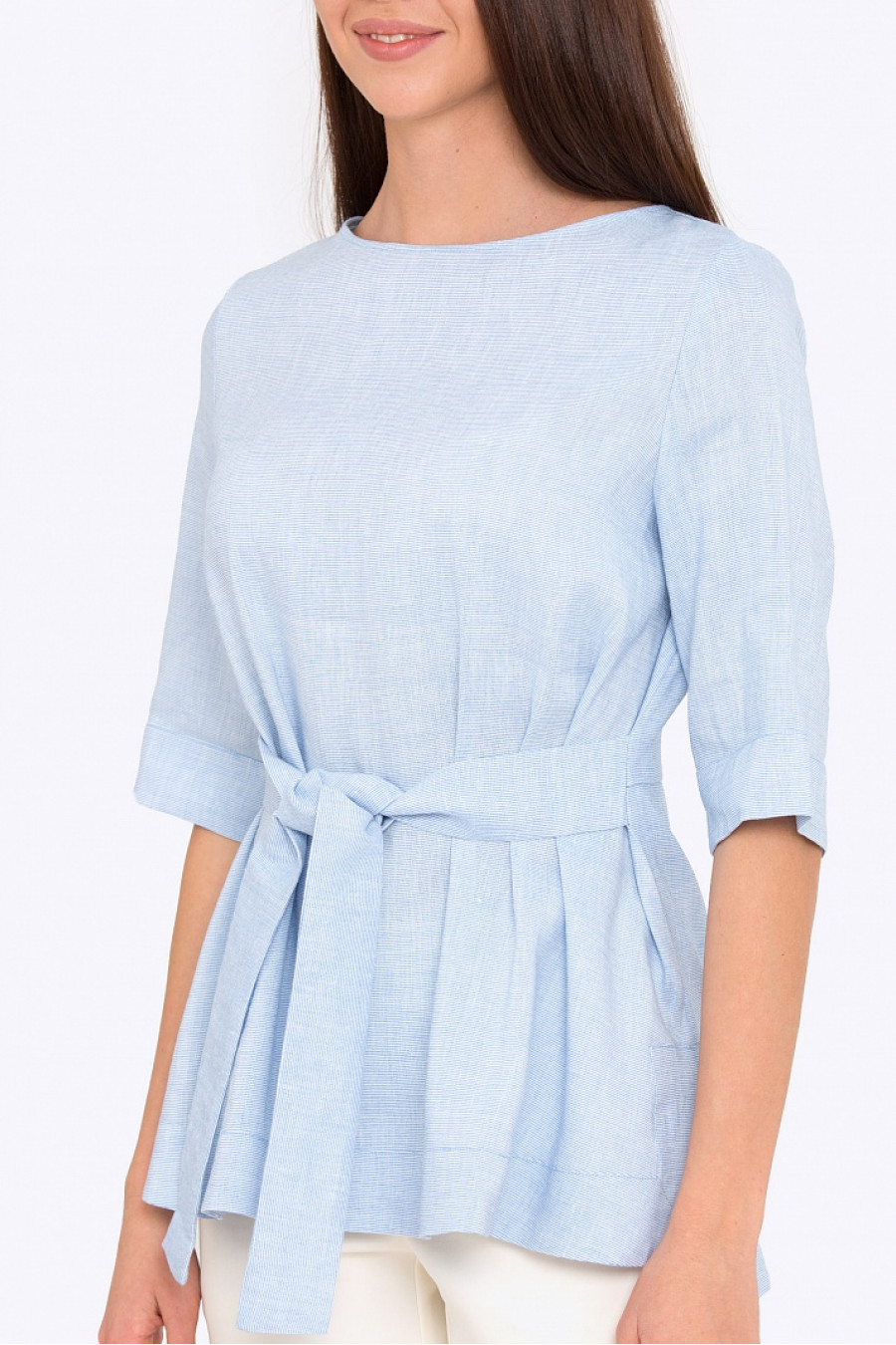 Блузка прямого силуэта с завязками на линии талии. Рукава 3/4, по бокам разрезы, низ асимметричный. Модель универсальная, подходит как классическим юбкам, так же будет отличным дополнением образа в стиле Casual. Рост фотомодели 172 см.