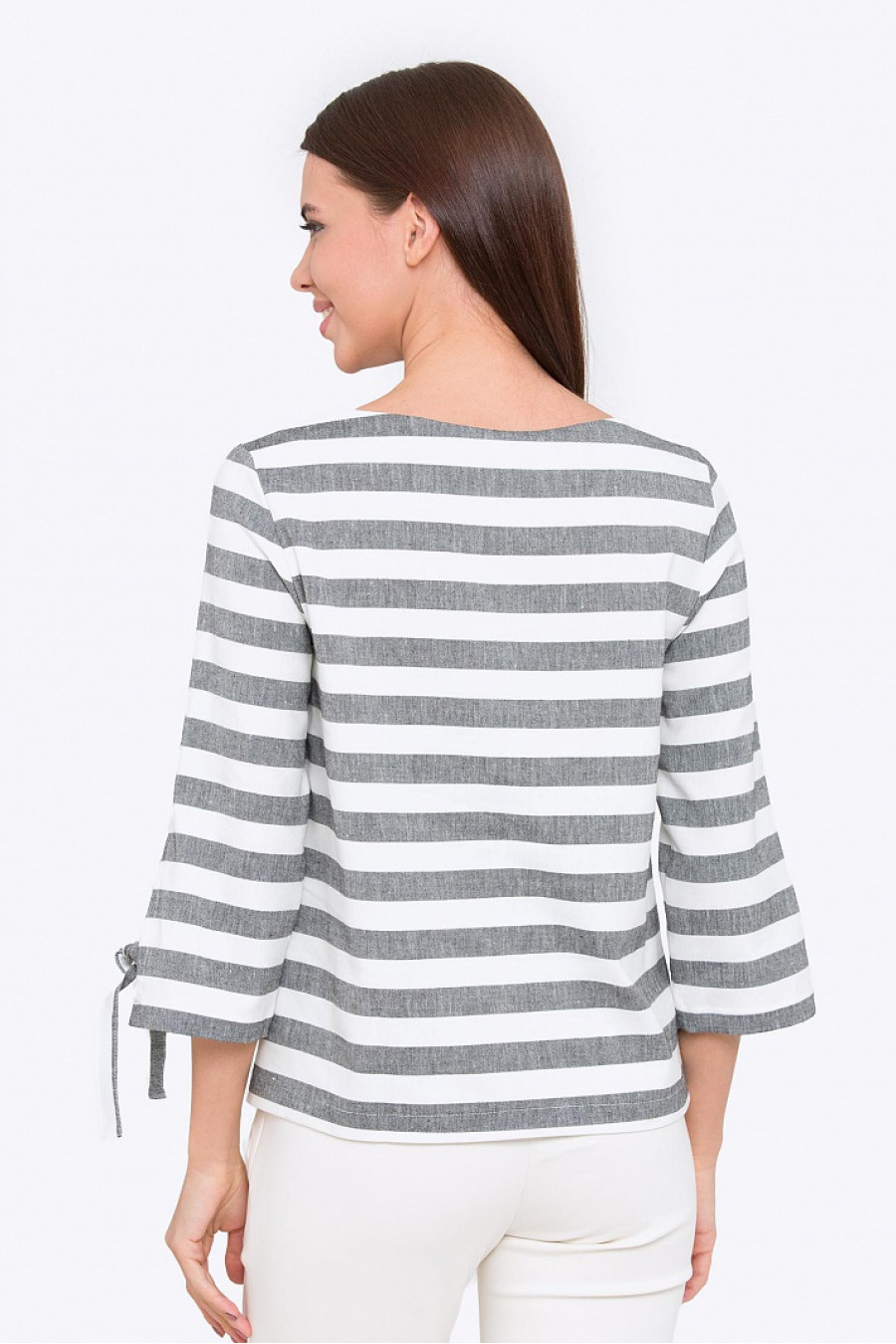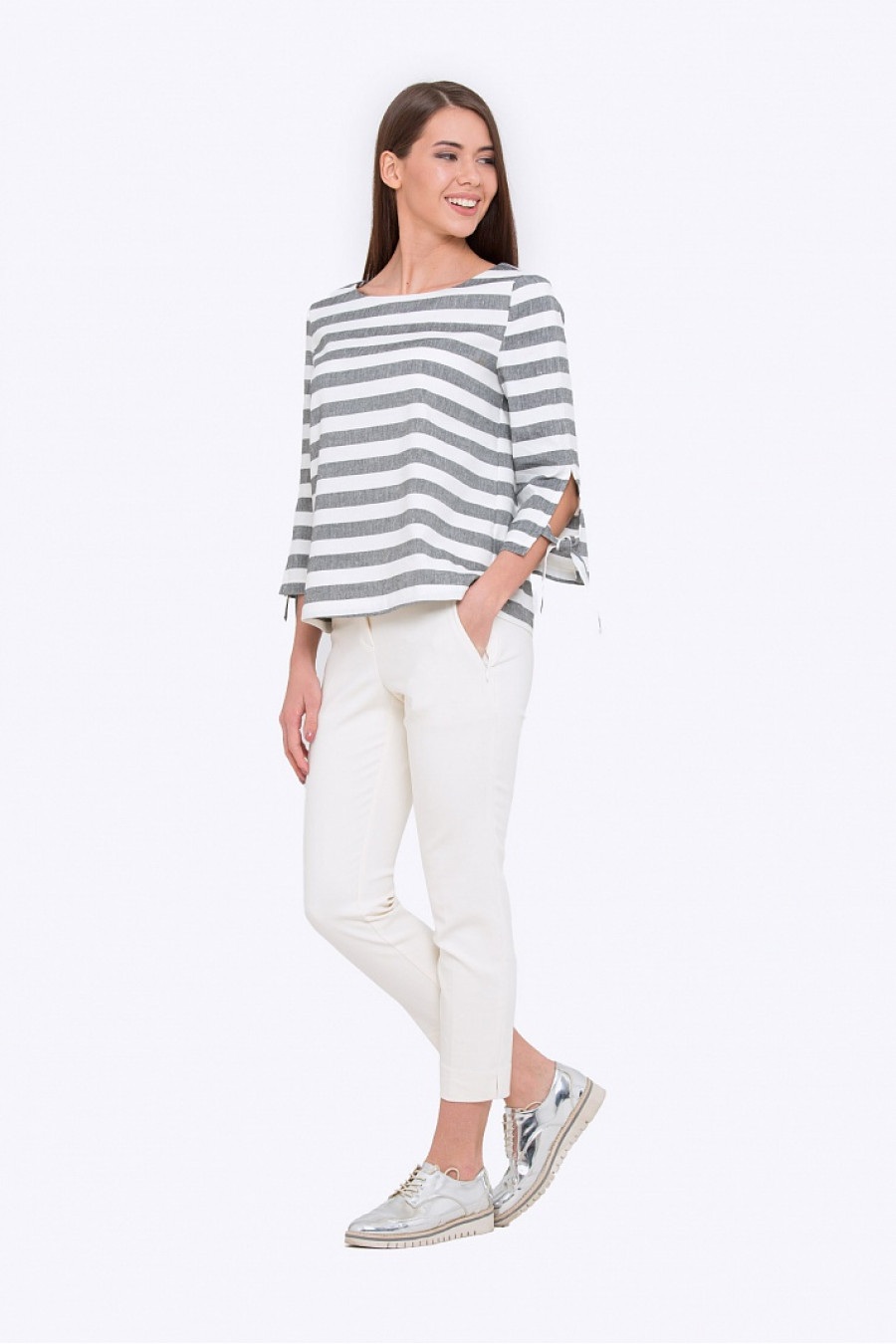 Блузка прямого кроя с рукавами 3/4 на завязках. Ткань в горизонтальную полоску, приятная к телу. Блузка в стилеCasual отличный выбор на каждый день. Образ на фото дополненБрюки D-019/sentiment