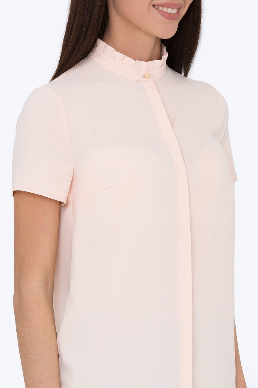 Блузка из легкого текстиля, приятного персикового цвета, с оборкой по горловине. Рукава короткие. Без подкладки. Застежка-планка на пуговицах. Модель хорошо сидит по фигуре, слегка просвечивает. Блузка может стать прекрасным дополнением делового образа или создать нежный, романтический наряд для женщин, которые стремятся быть в центре внимания. Рост фотомодели 172 см.