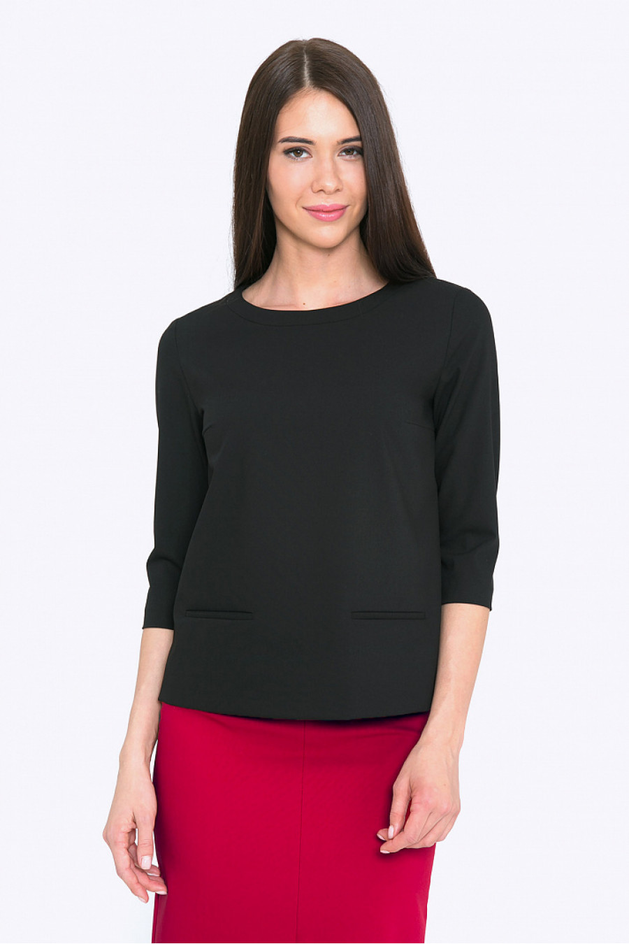 Блузка прямого кроя с функциональными карманами. Ткань структурная черного цвета. Рукава 3/4, застежка-молния на спинке. Без подкладки. Модель хорошо сидит по фигуре. Стильная блузка на каждый день. Рост фотомодели 172 см.