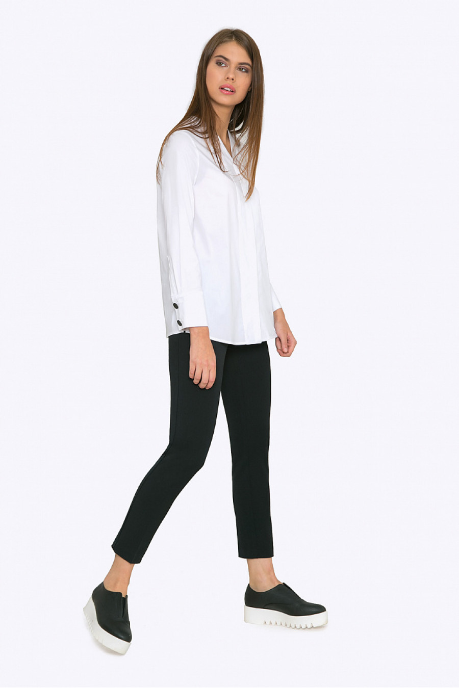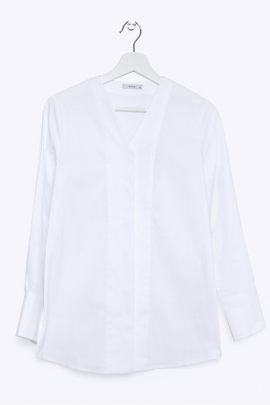 Рубашка свободного кроя с V-образным вырезом горловины.Вбольших размерахесть нагрудные вытачки. На модели широкие манжеты с крупными пуговицами. Ткань на основе хлопка белого цвета. Стильная рубашка в стиле Casual. Рост фотомодели 178см.