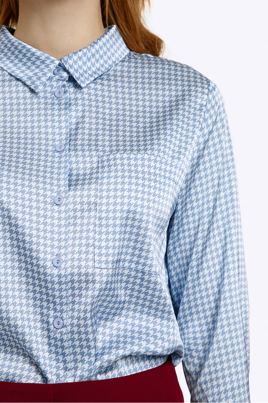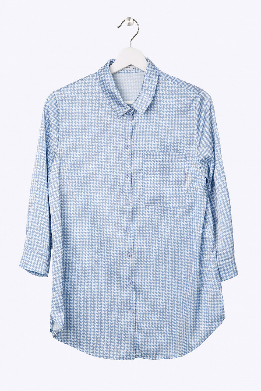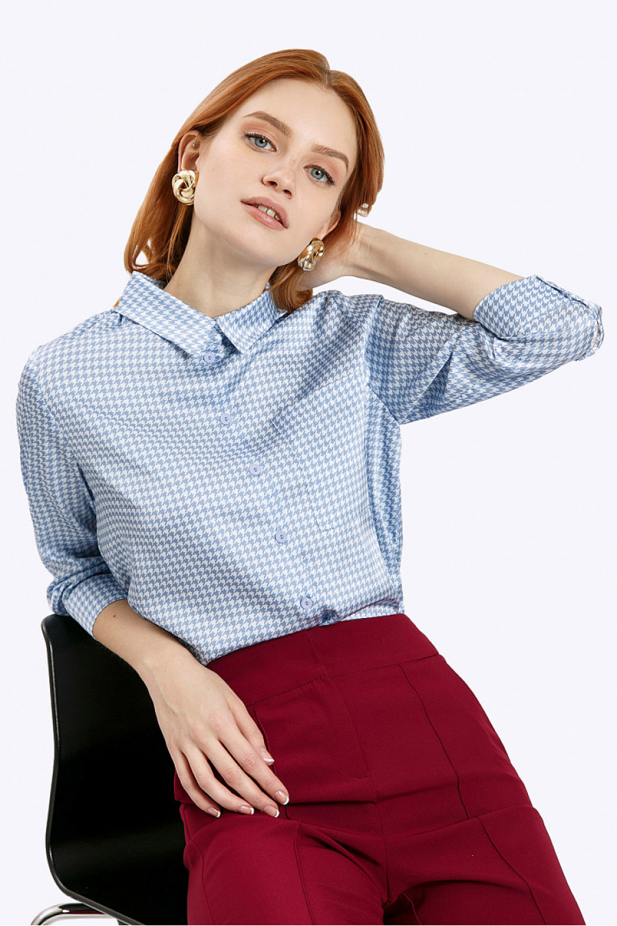 Закрытая блузка с орнаментом гусиная лапка. Модельимеет прямойсилуэт,рубашечный воротник, планку спуговицами, небольшой карман. Рукава ¾ с манжетами на двух пуговицах. Рост фотомодели 176 см.