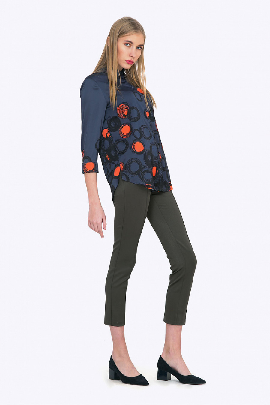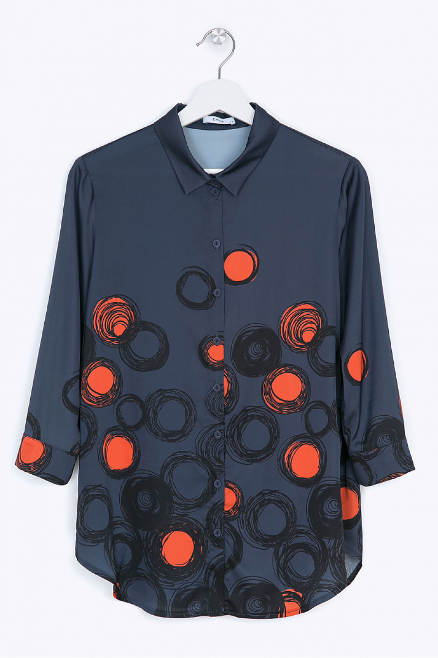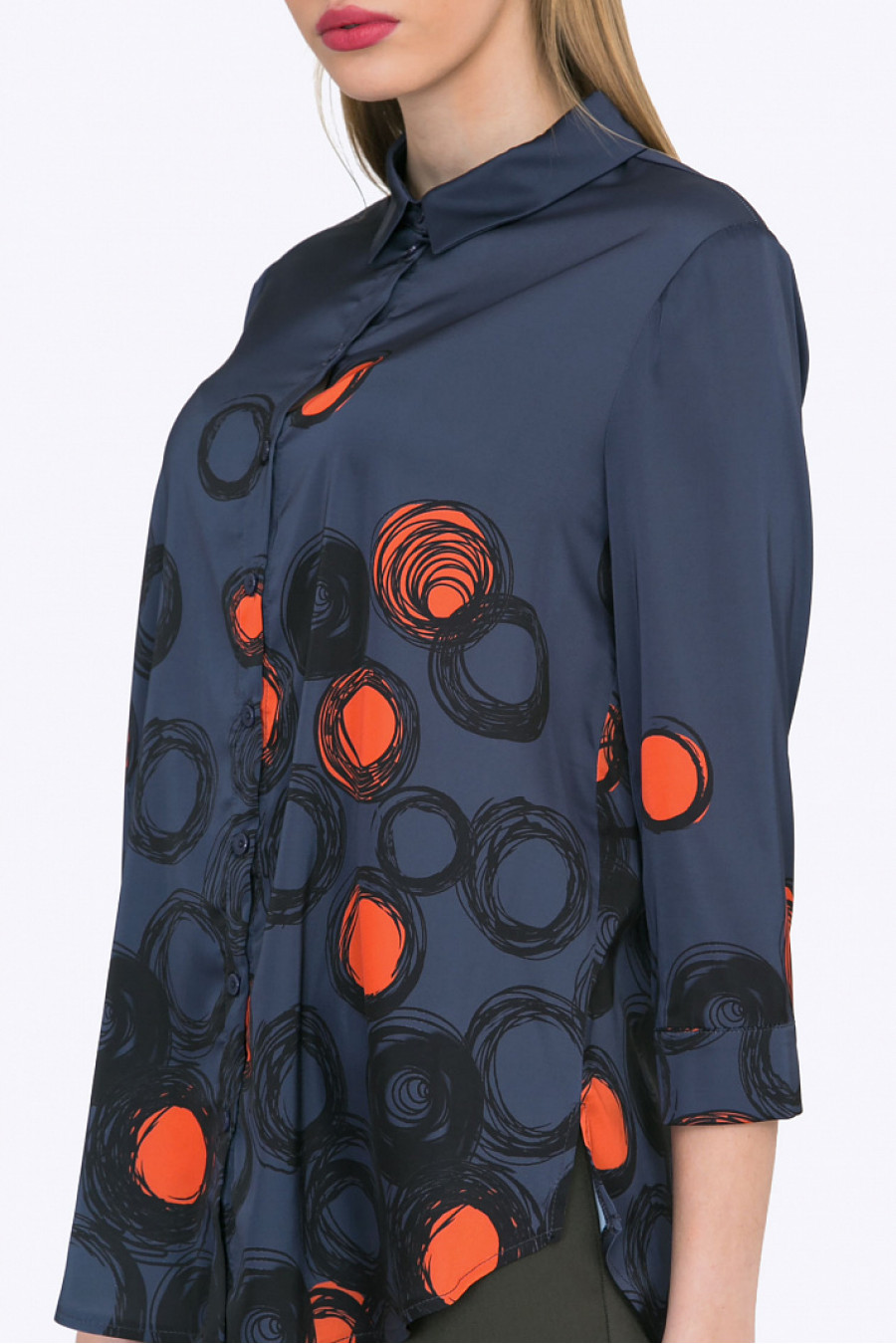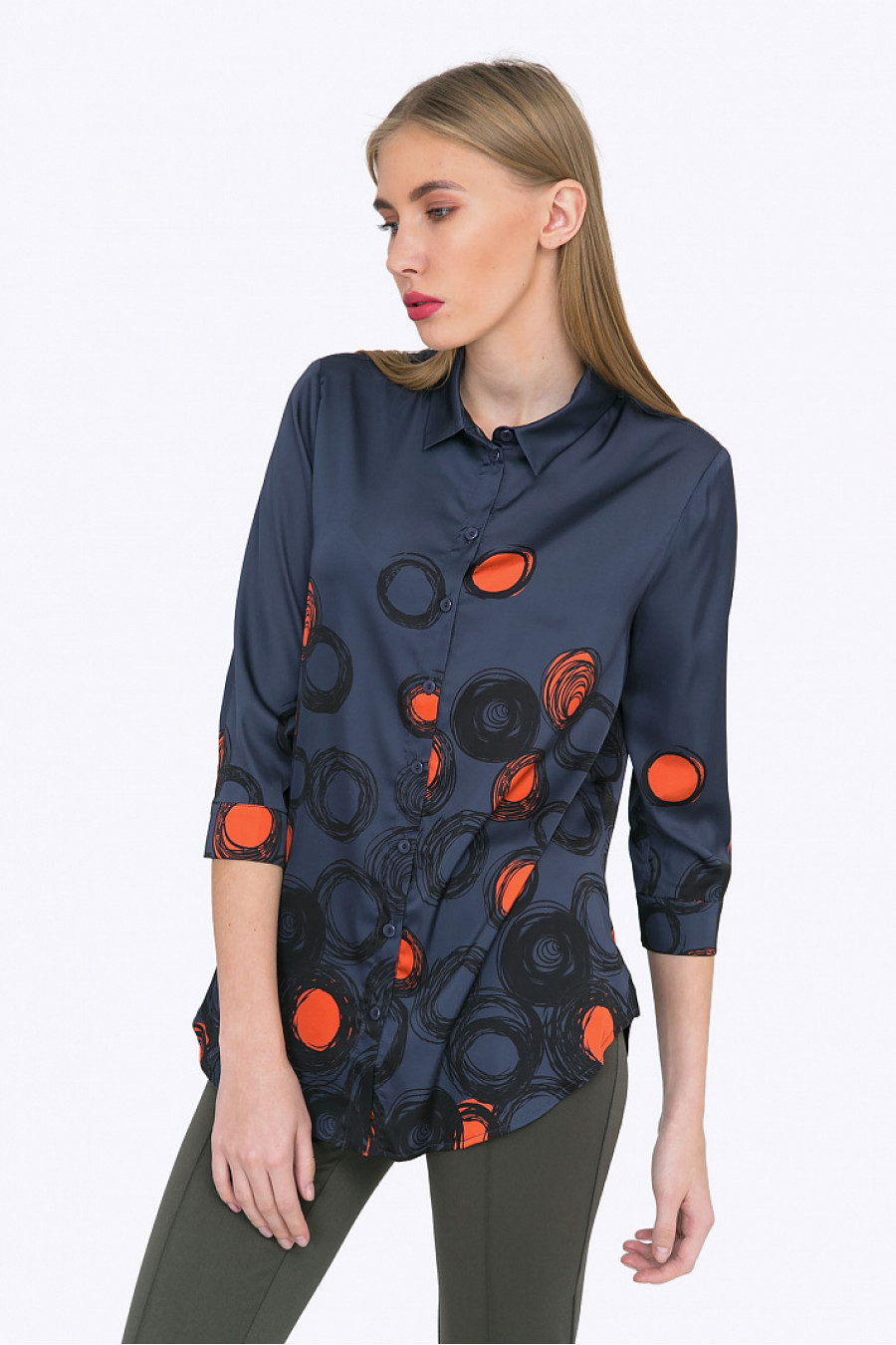 Рубашка прямого кроя. Тканьструящаясяс принтом. Спереди модель оформленанакладным карманом. Комфортная рубашка, хорошо сочетается с однотонными юбками и брюками. Образ на фото дополнен Брюками D053-rifle.