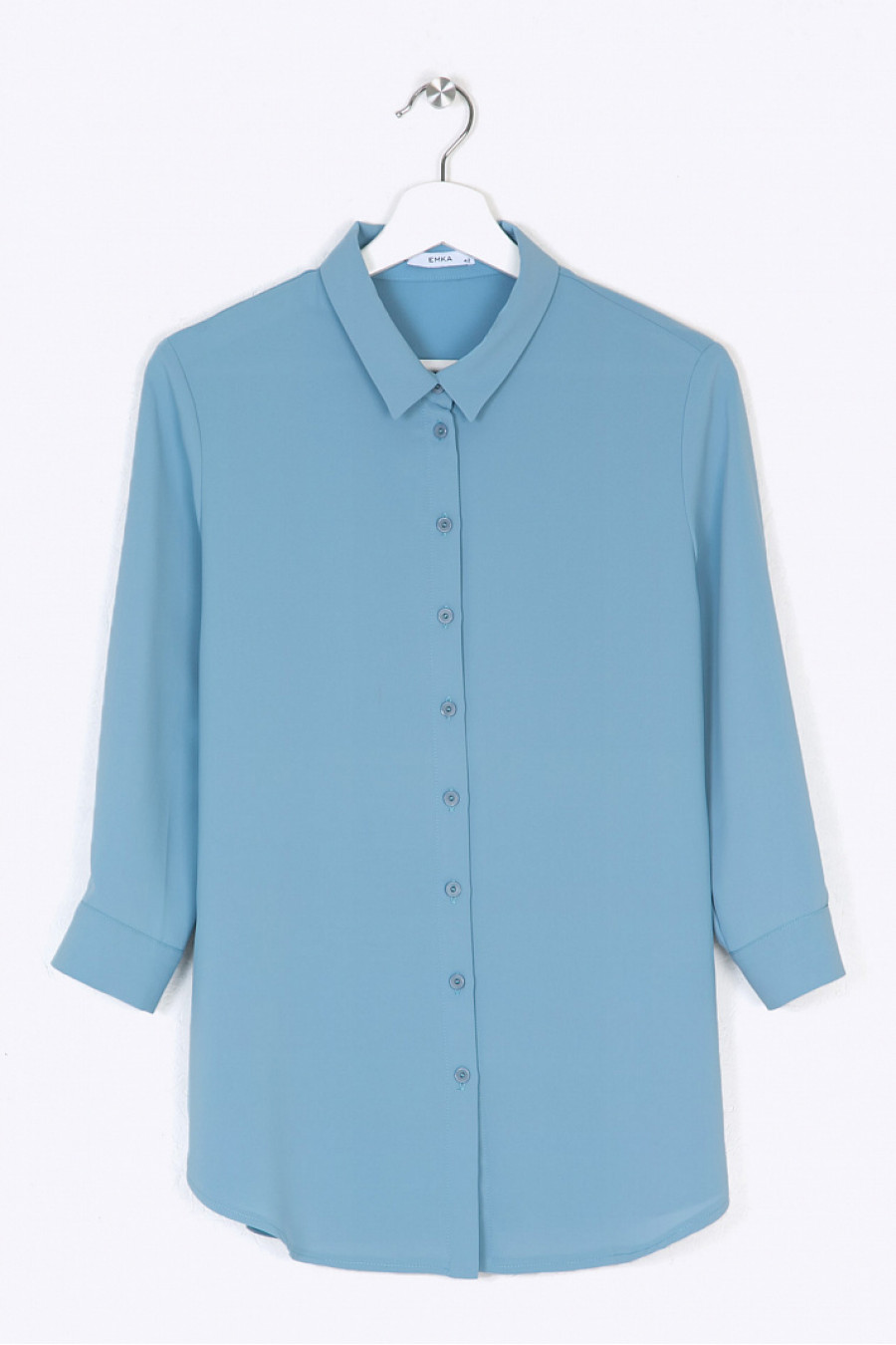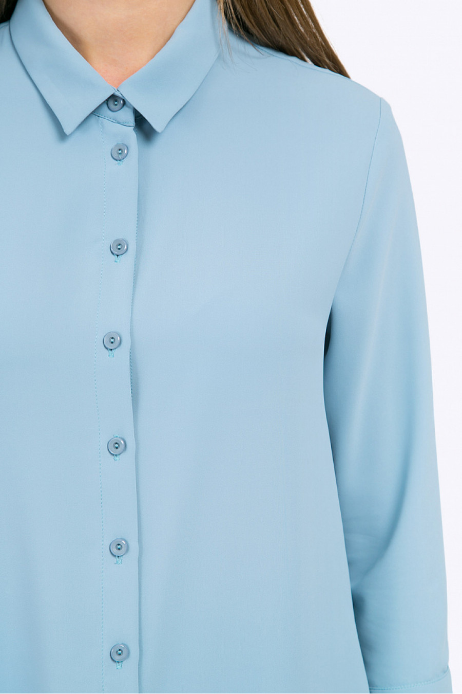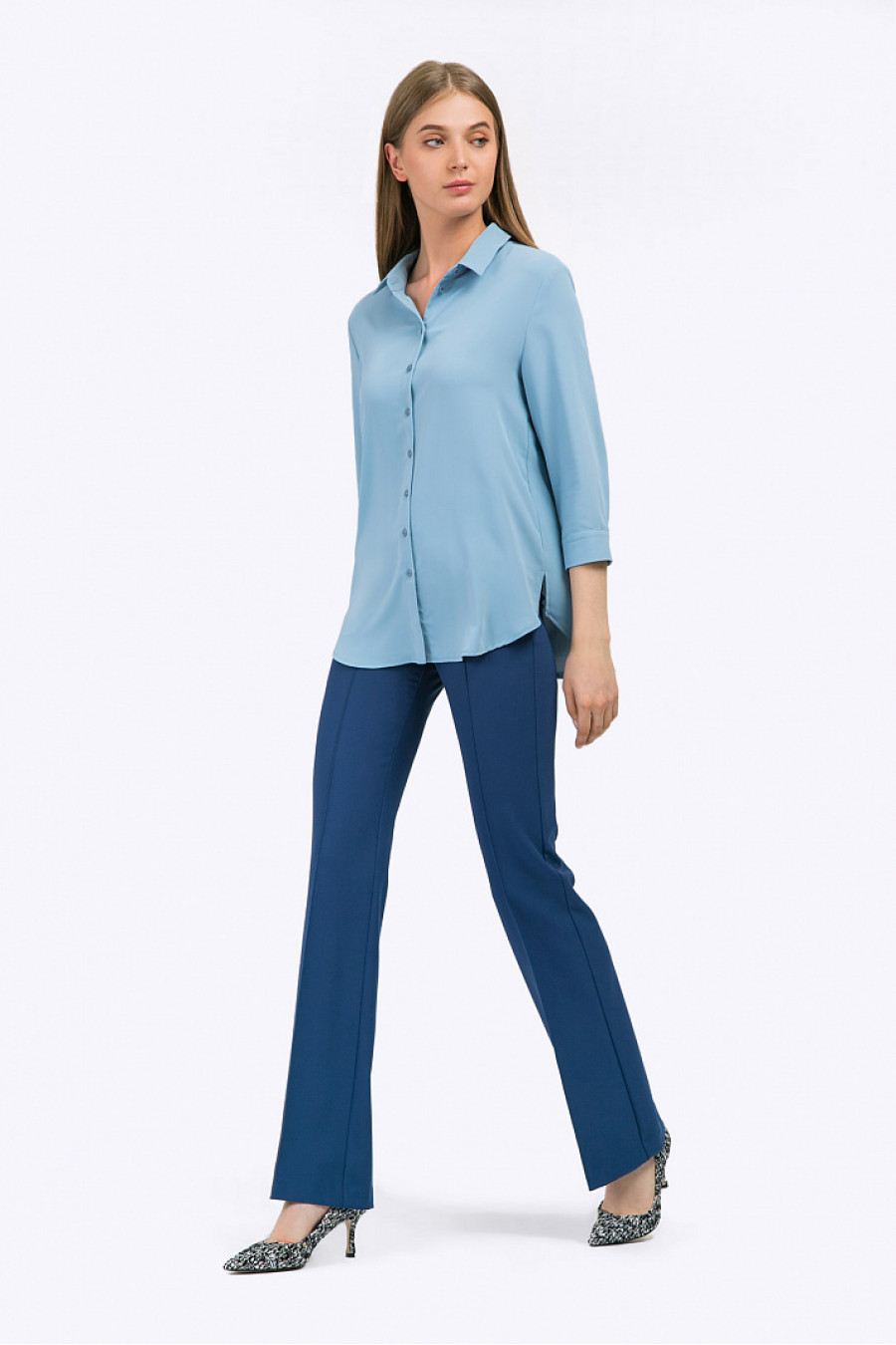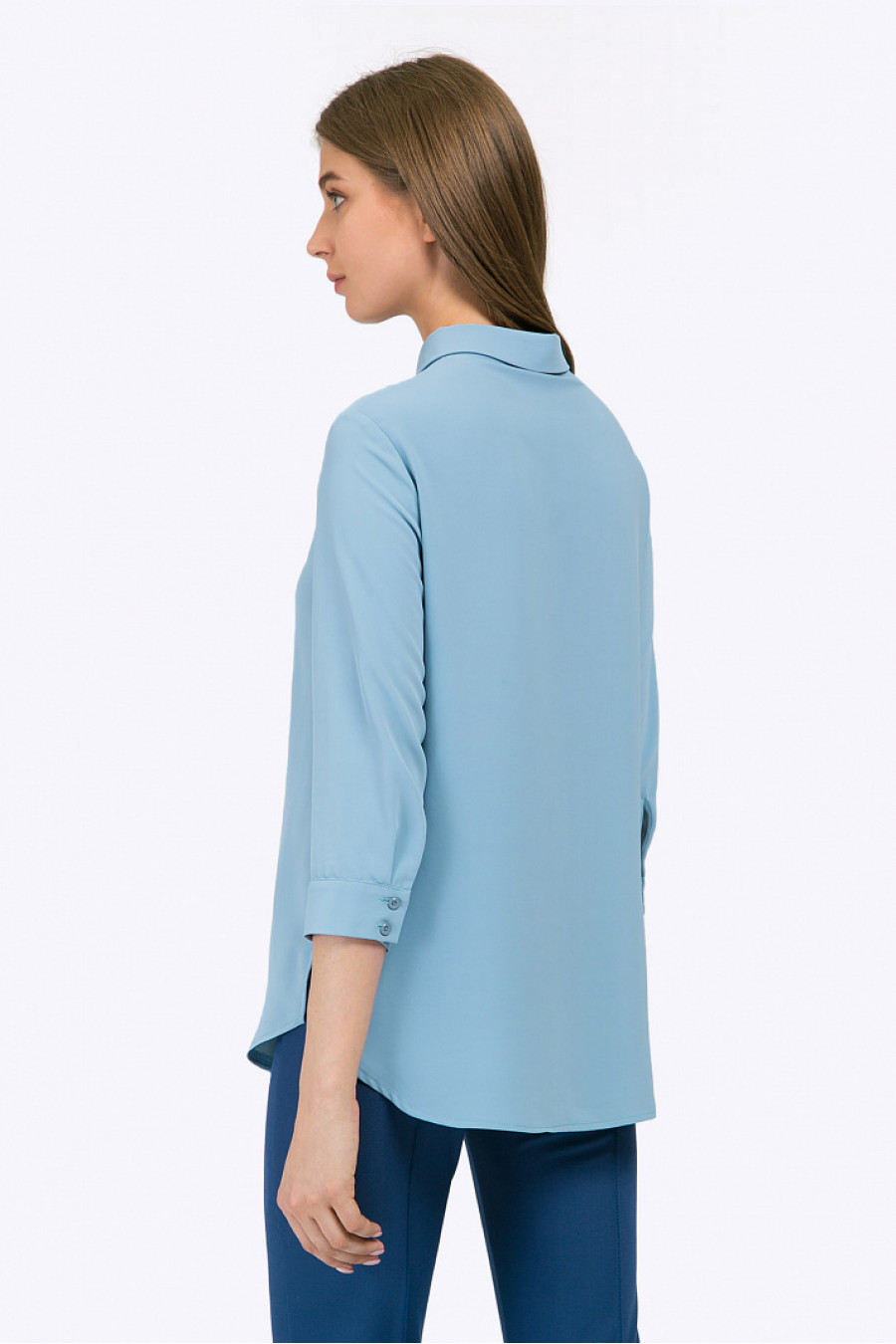 Блузка голубого цвета с рукавами ¾. Модель имеет