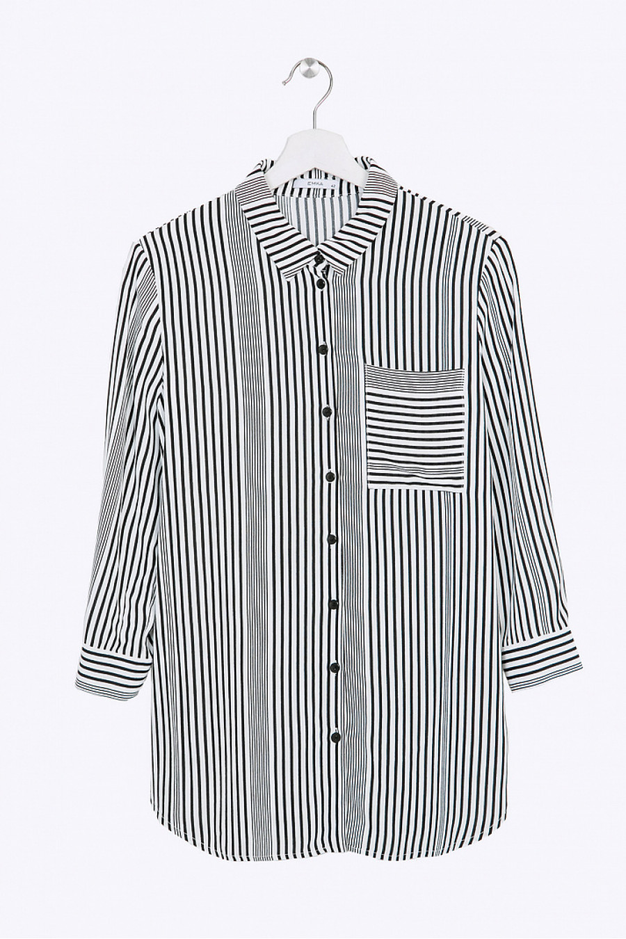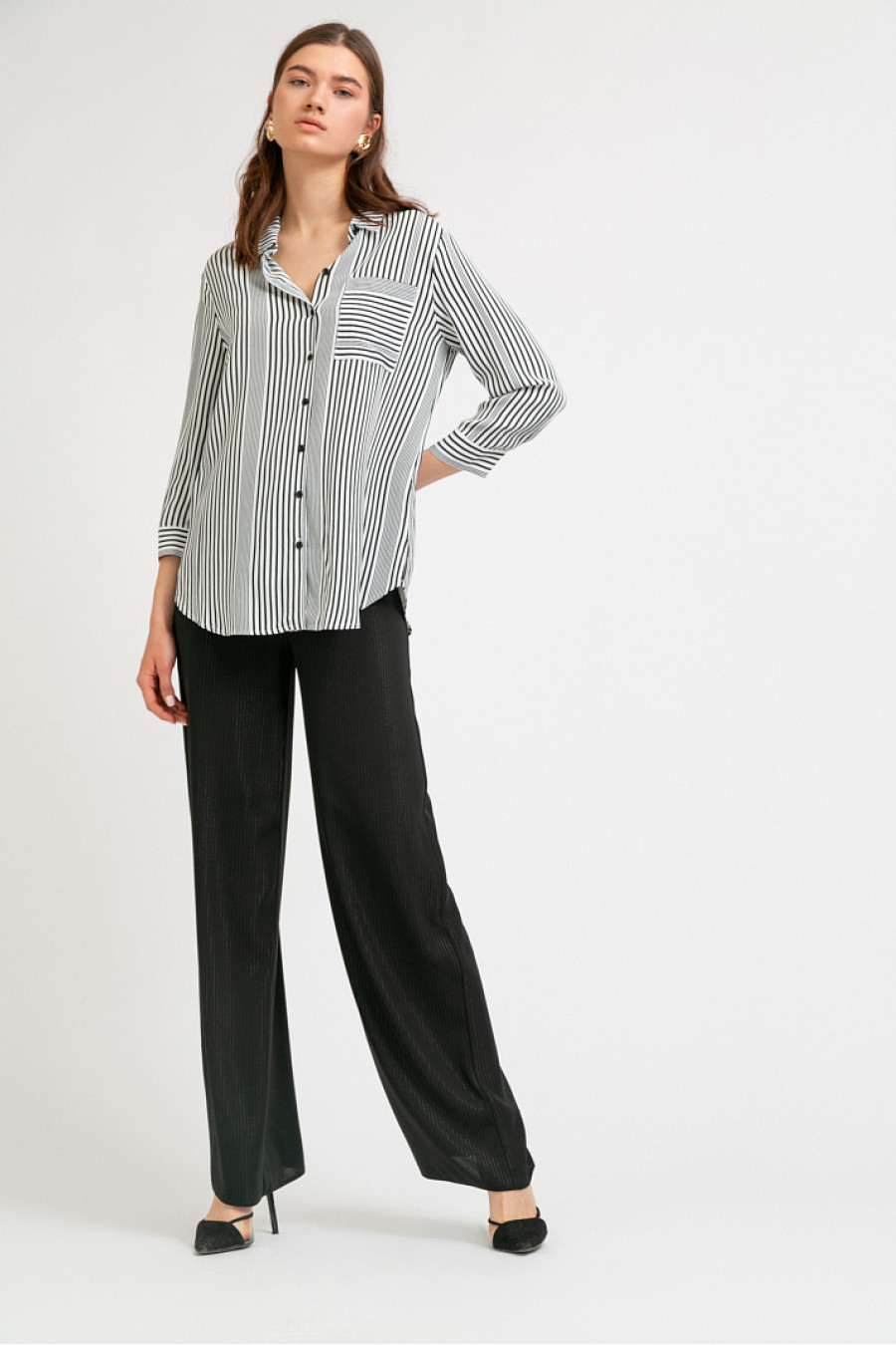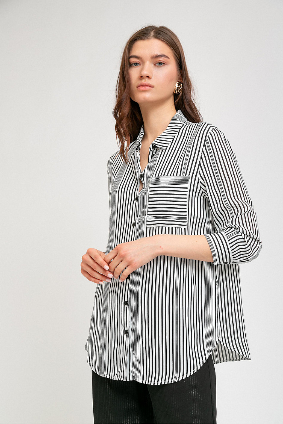 Закрытая блузка в полоску. Модельимеет прямойсилуэт,рубашечный воротник, планку спуговицами, небольшой кармашек. Рукава ¾ с манжетами на двух пуговицах. Рост фотомодели 177 см.