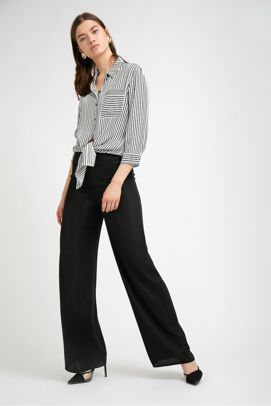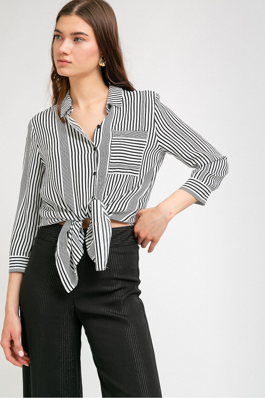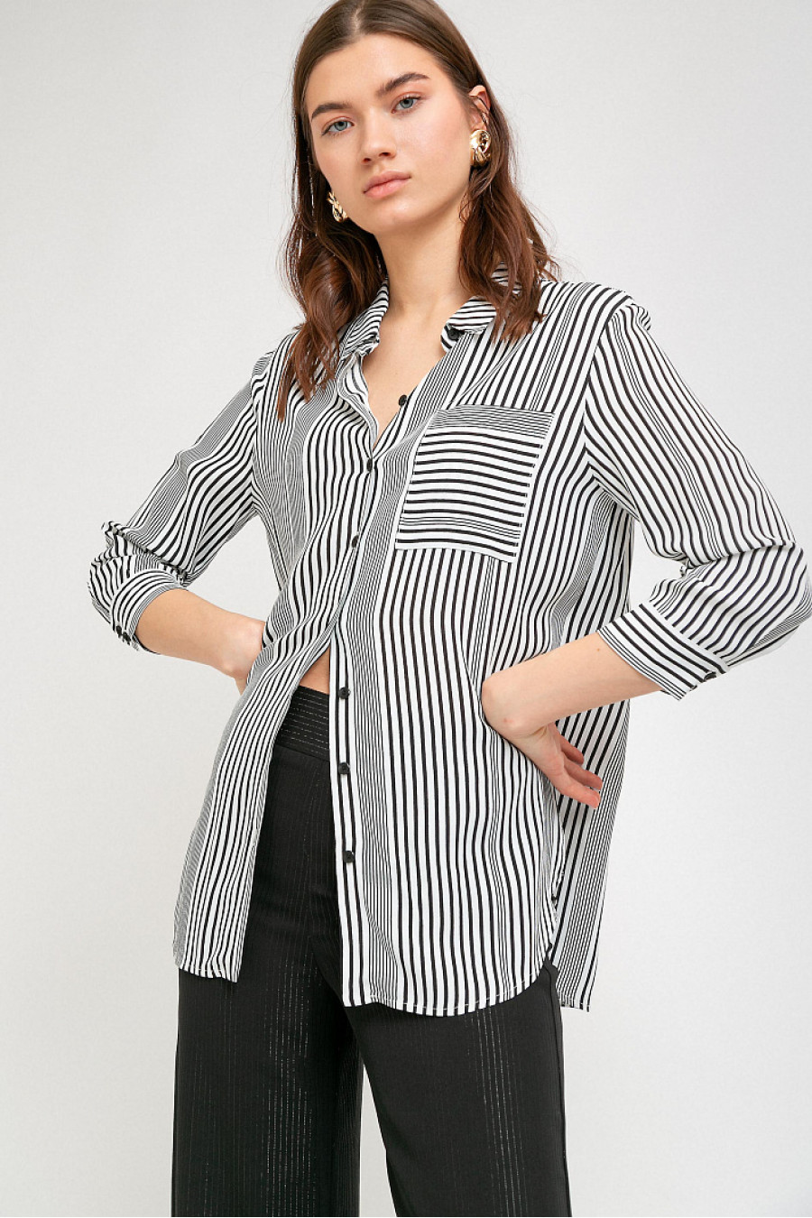 Закрытая блузка в полоску. Модельимеет прямойсилуэт,рубашечный воротник, планку спуговицами, небольшой кармашек. Рукава ¾ с манжетами на двух пуговицах. Рост фотомодели 177 см.