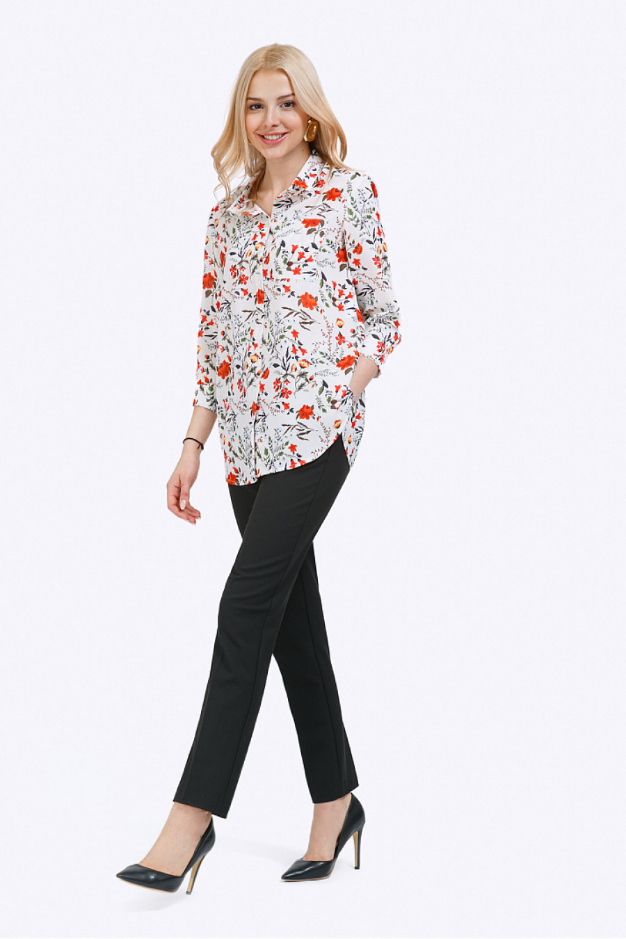 городском стиле. Модель прямого покроя, свободно облегает фигуру, рукава ¾ сманжетами. Имеются отложной рубашечный воротничок, спереди застёжка с планкой и небольшой кармашек. Линия подола фигурной формы. Образ на фото дополнен Брюками D102-djolin. Рост фотомодели 172 см.