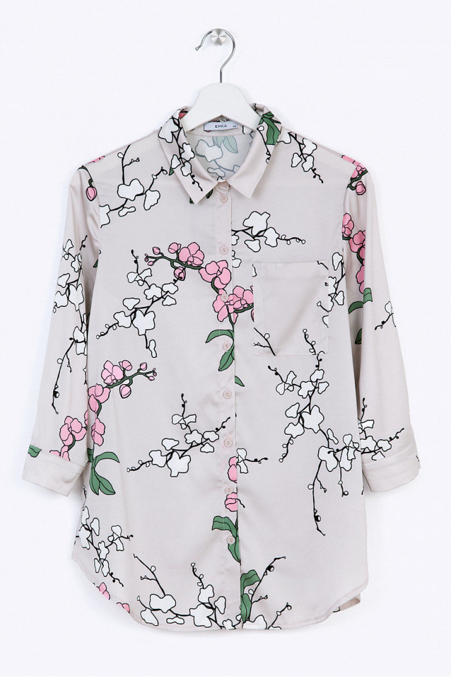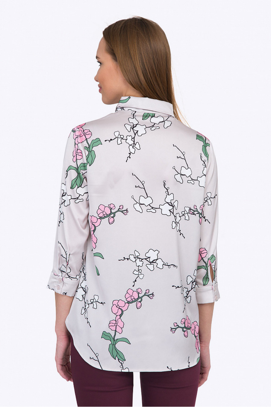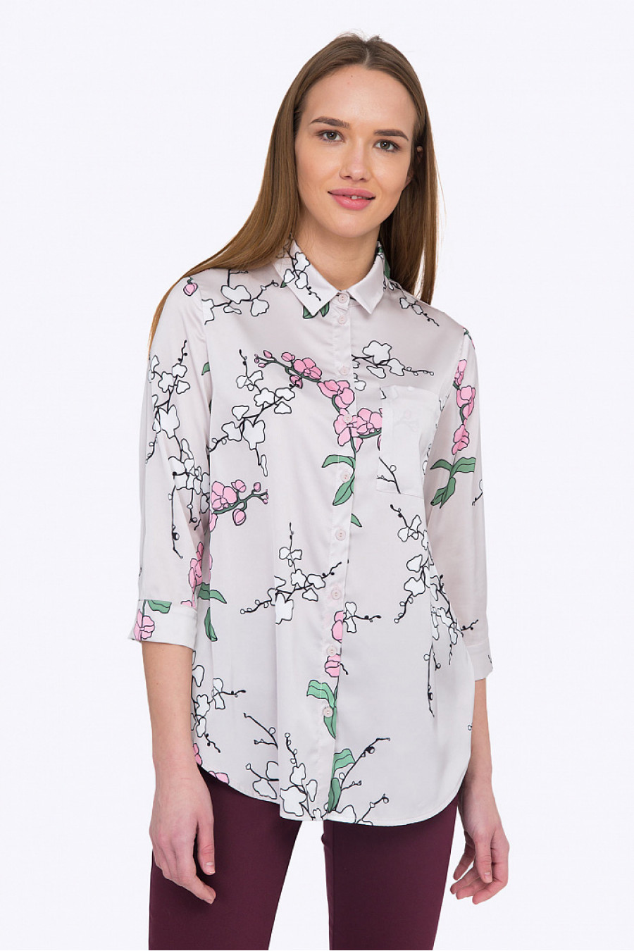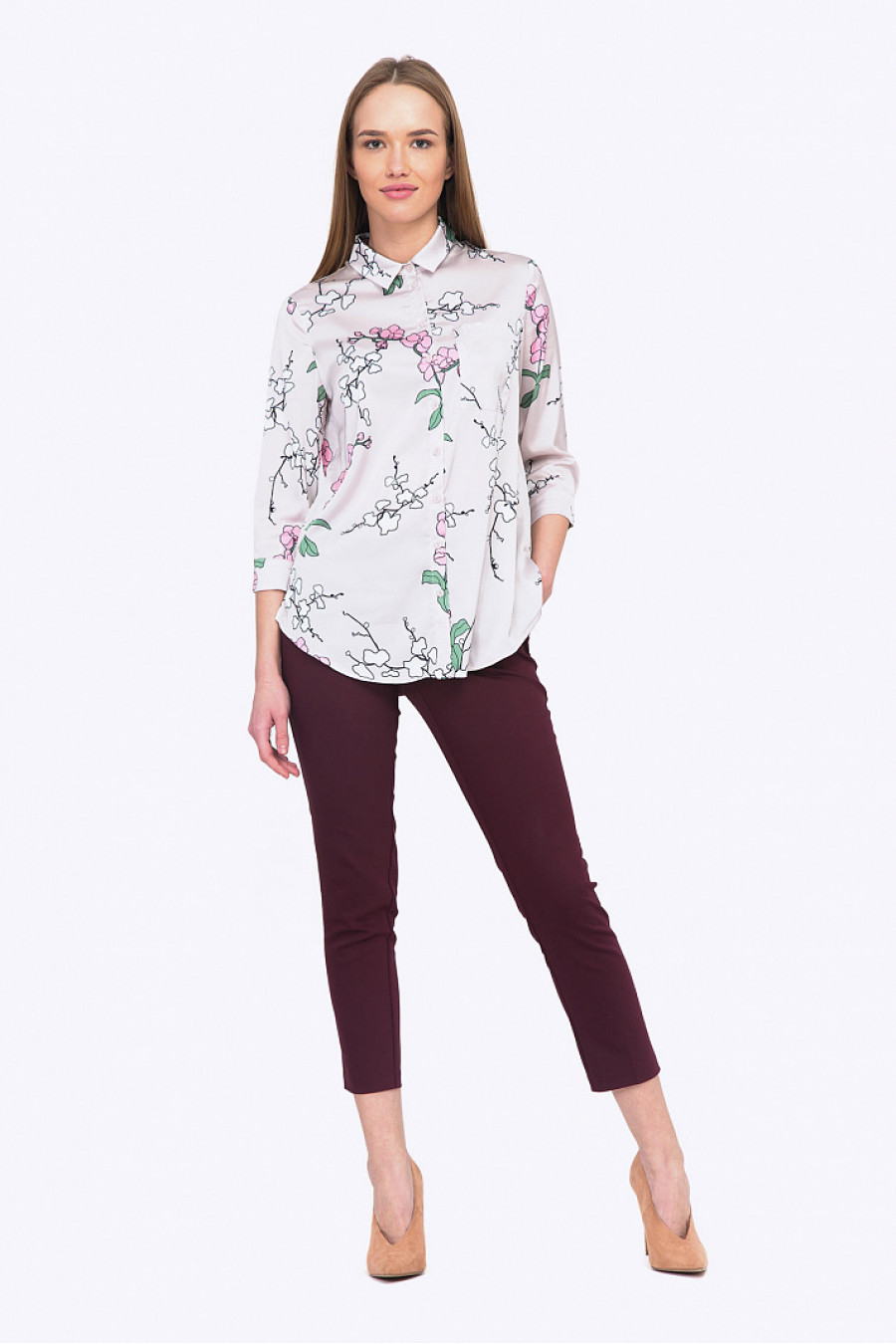 Блузка на пуговицах нежного оттенка лаванды с рисунком сакуры. Легкая струящаяся ткань приятна к телу. Блузка хорошо сочетается с классическими брюками, а также юбками любых моделей. Образ на фото дополнен Брюками D076-somi . Рост фотомодели 176 см.<-p>