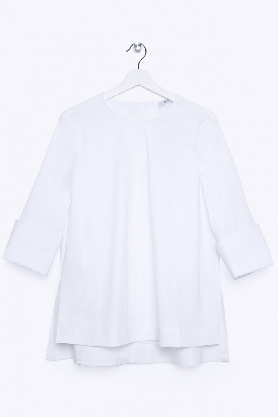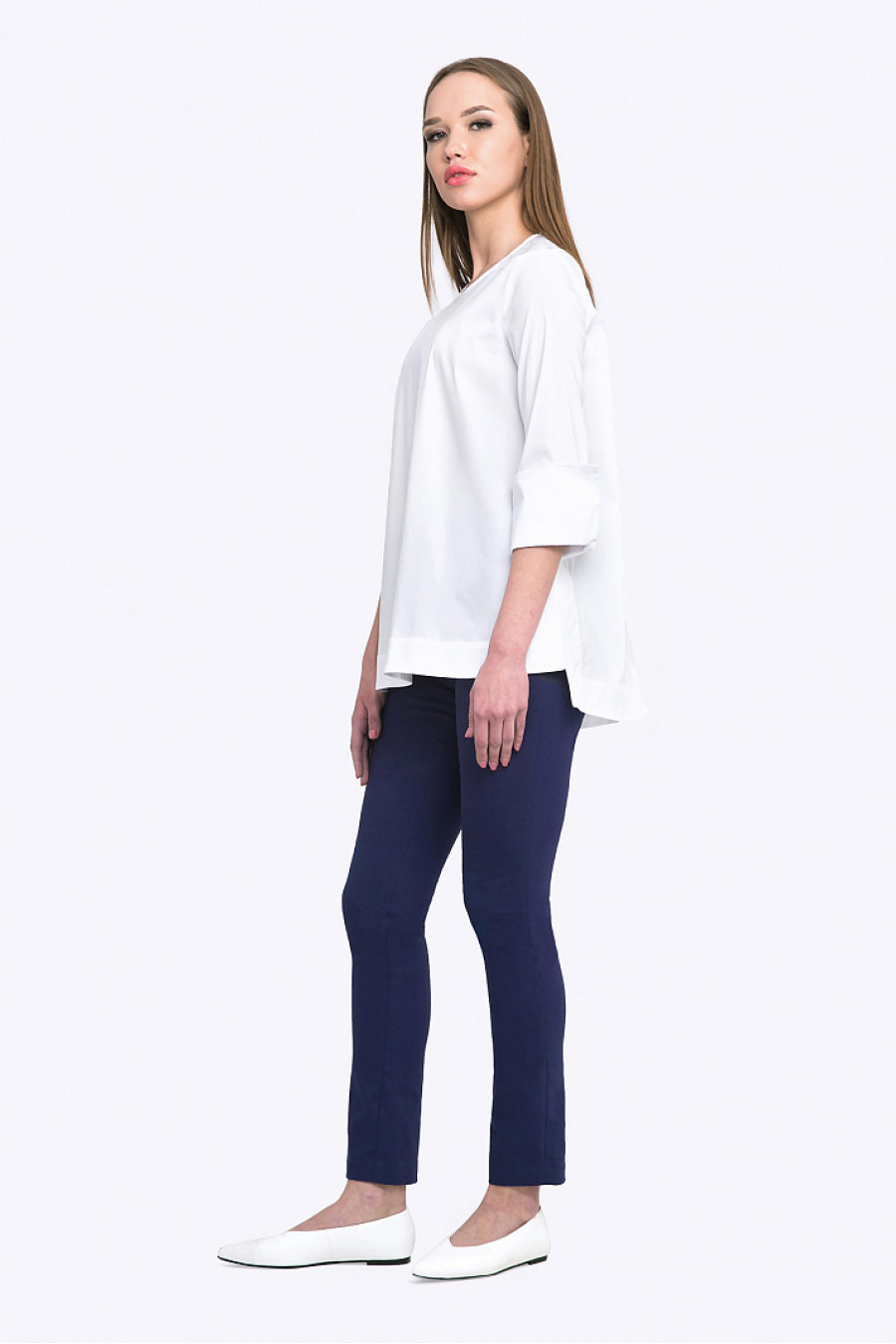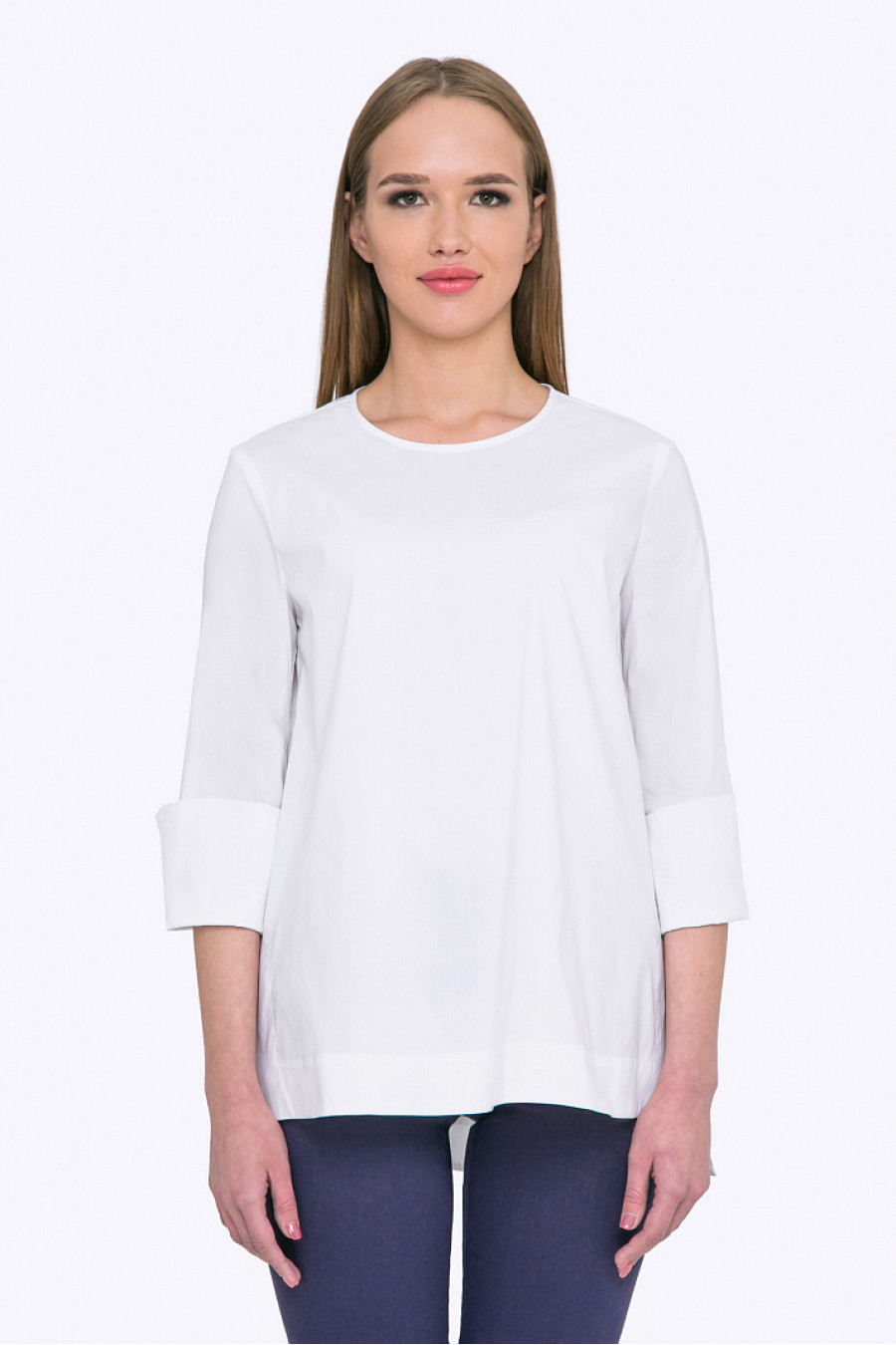 Блузка свободного кроя с разрезами по бокам и асимметричным низом. Рукава 3/4 с широкими манжетами. Модель не сковывает движения и позволит создать стильный образ. Рост фотомодели 174 см.