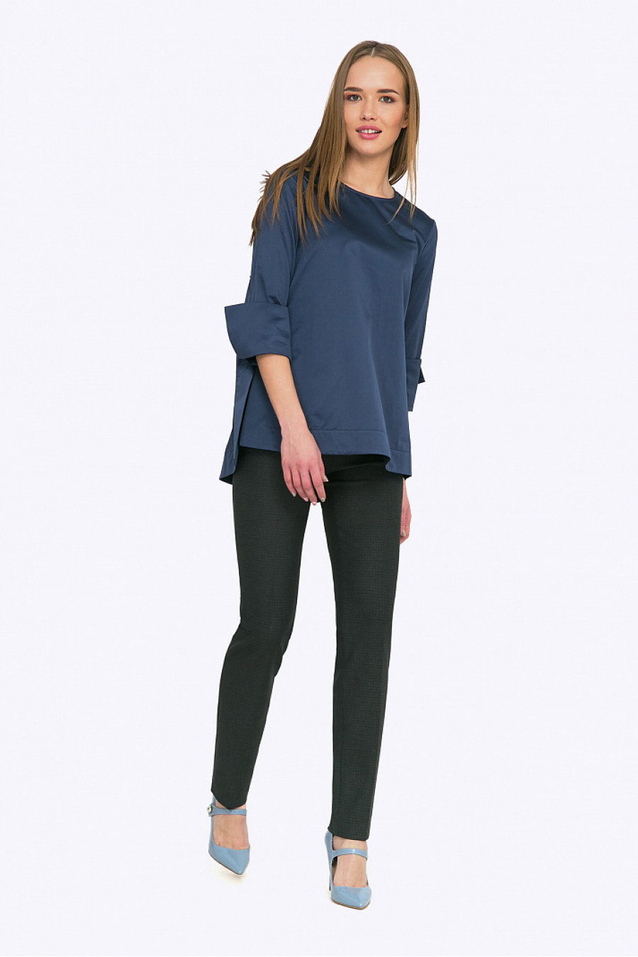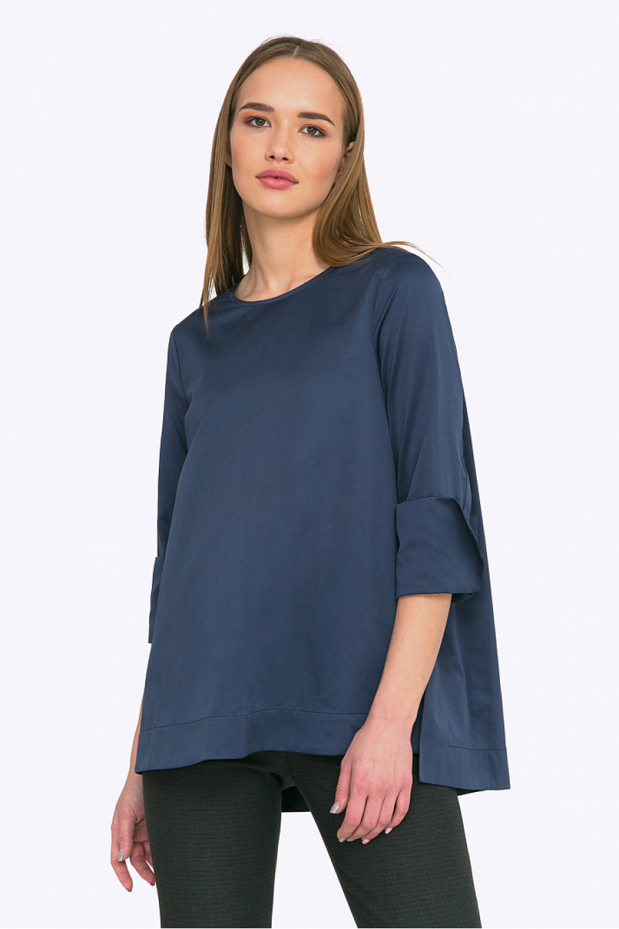 Уникальная блуза благородного оттенка антрацит с легкой аллюзией на Китайский стиль не оставит равнодушными поклонниц восточной эстетики в моде. Изысканный крой асимметричного низа и крупных манжет, гармоничные линии свободного силуэта - сделают обладательницу этой модели изюминкой любого вечера либо самой стильной сотрудницей офиса. С черными лаконичными брюками (как на фото) или прямой юбкой макси из богатой ткани - модель создаст неповторимый и элегантный look. Блуза будет отлично смотреться на блондинках и золотоволосых. Мягкая смесовая ткань с большим содержанием хлопка приятна в носке и проста в уходе. Образ на фото дополнен Брюками D004-miley. Рост фотомодели 174 см.