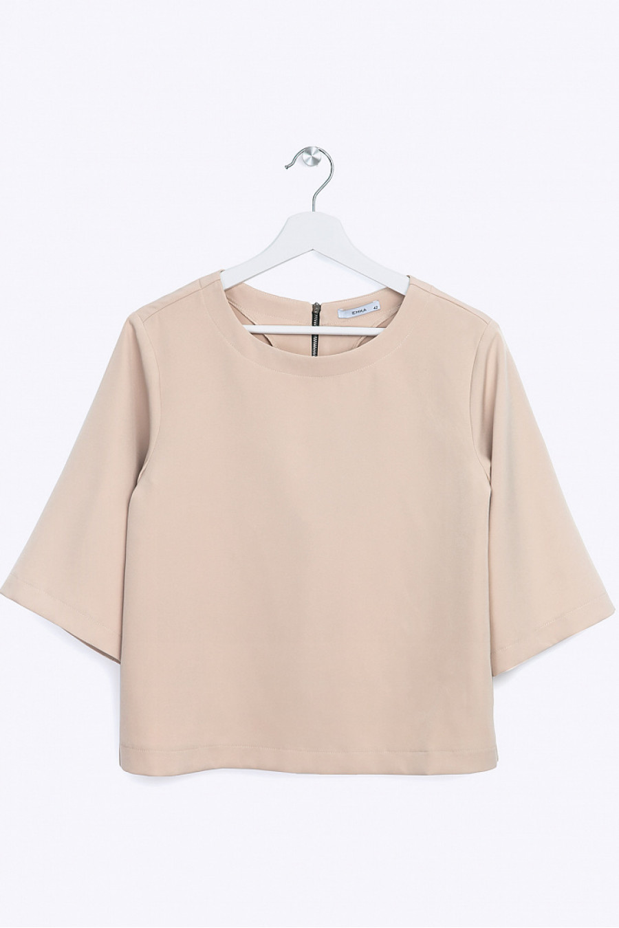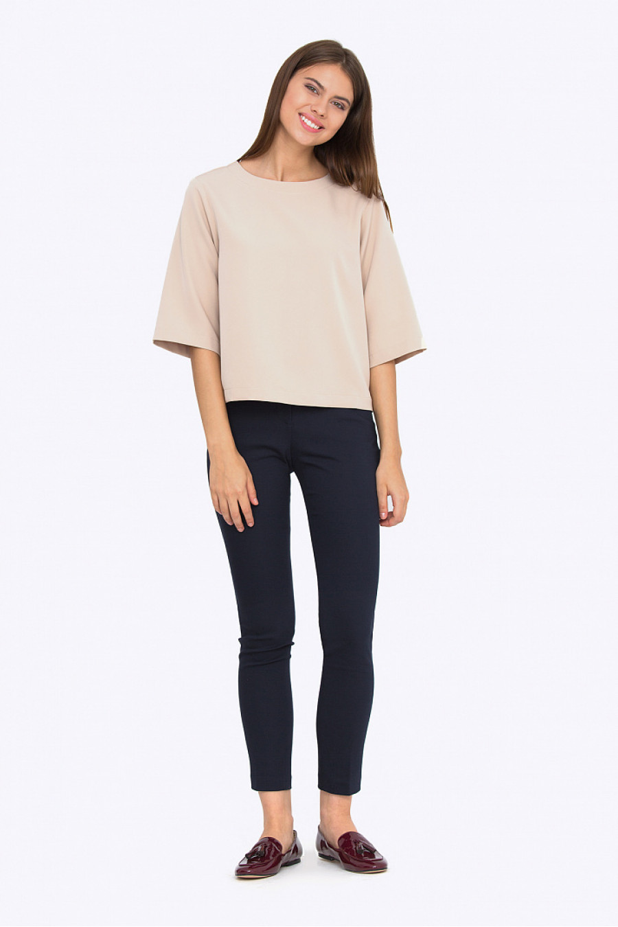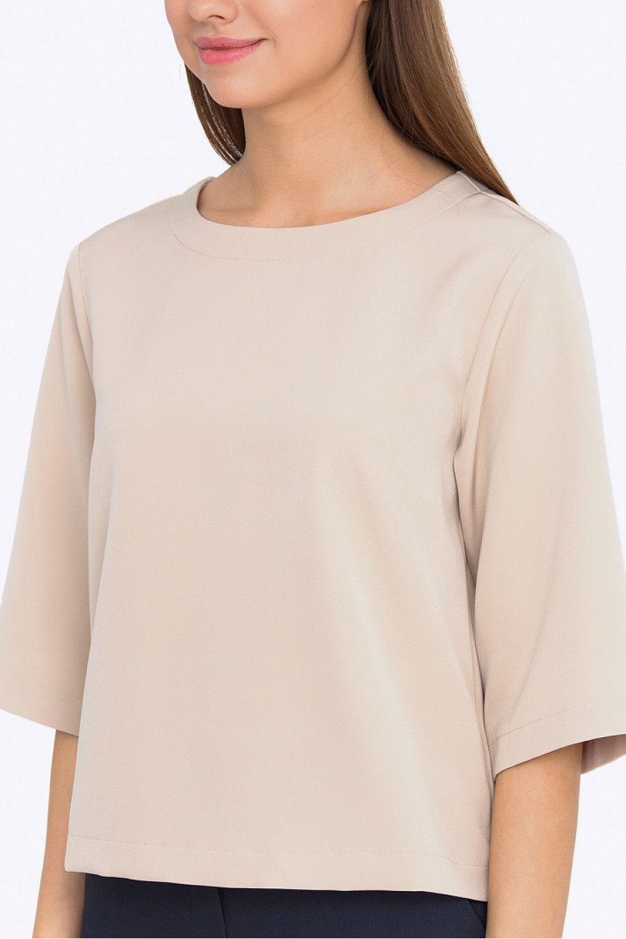 Блузка прямого кроя смолнией на спинке. Модель со свободными рукавами. Ткань средней плотности бежевого цвета. Блузку можно носить как с классическими юбками, так и с брюками в стиле Casual. Образ на фото дополненБрюкиD-016/gorgeous. Рост фотомодели 178см.