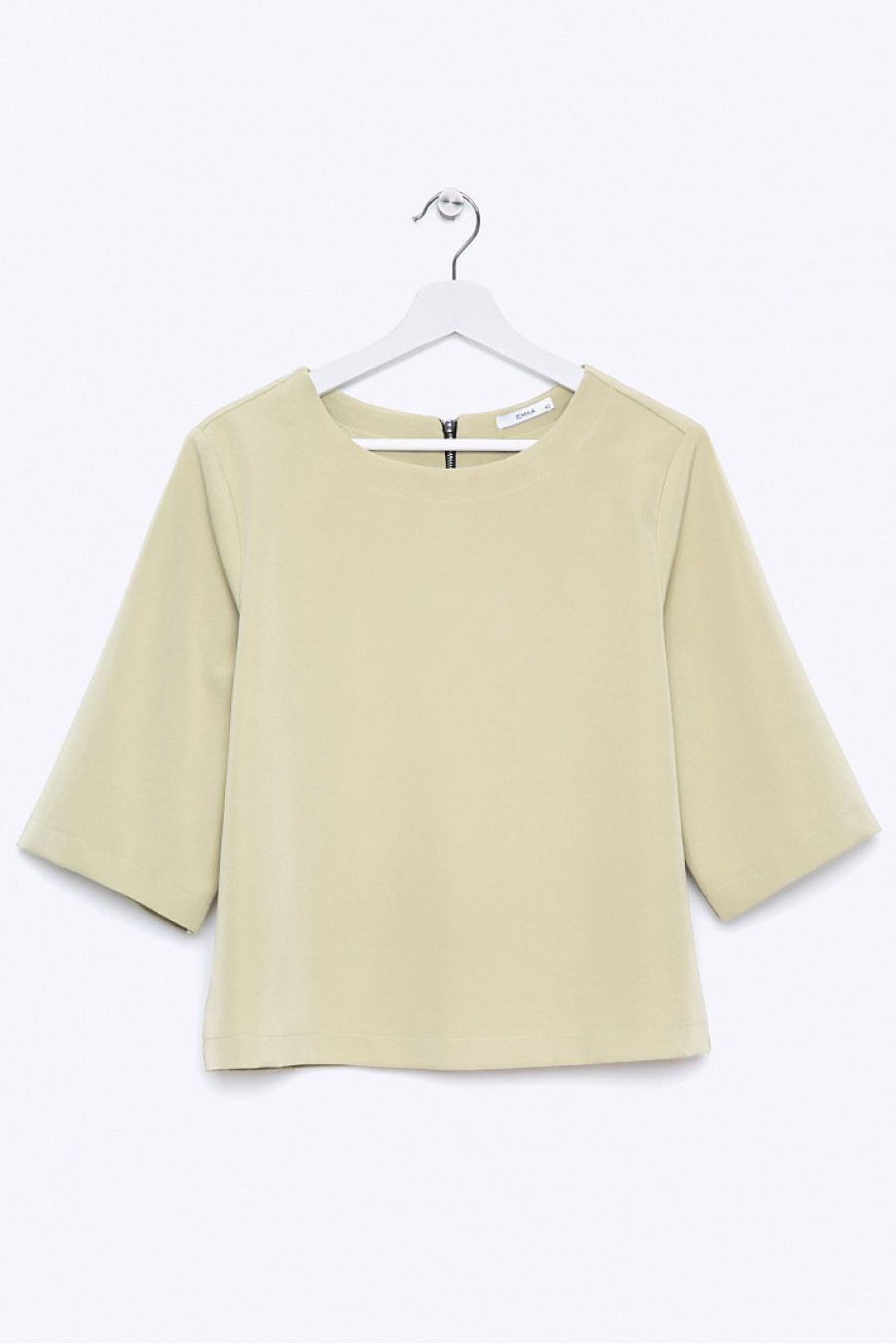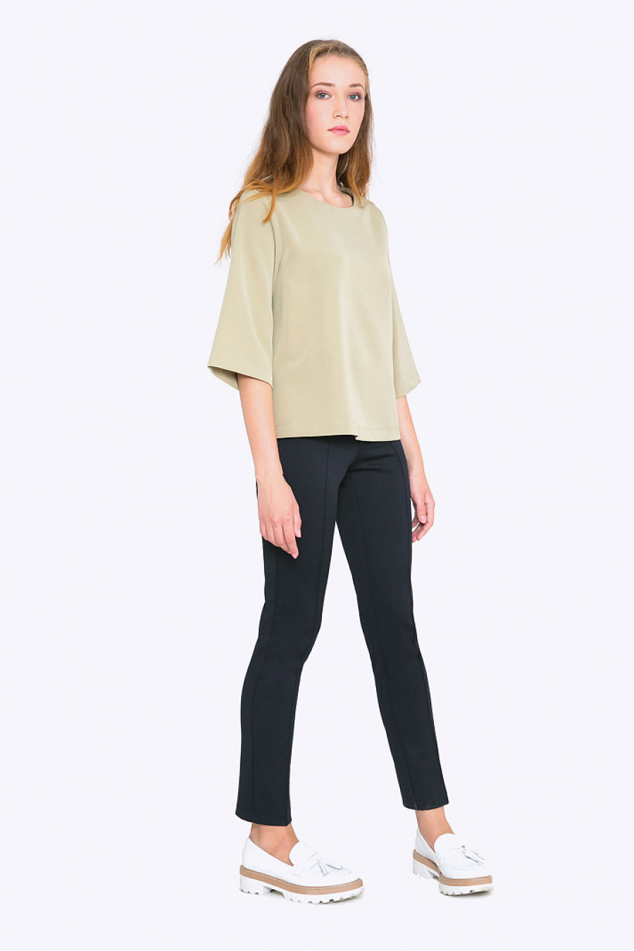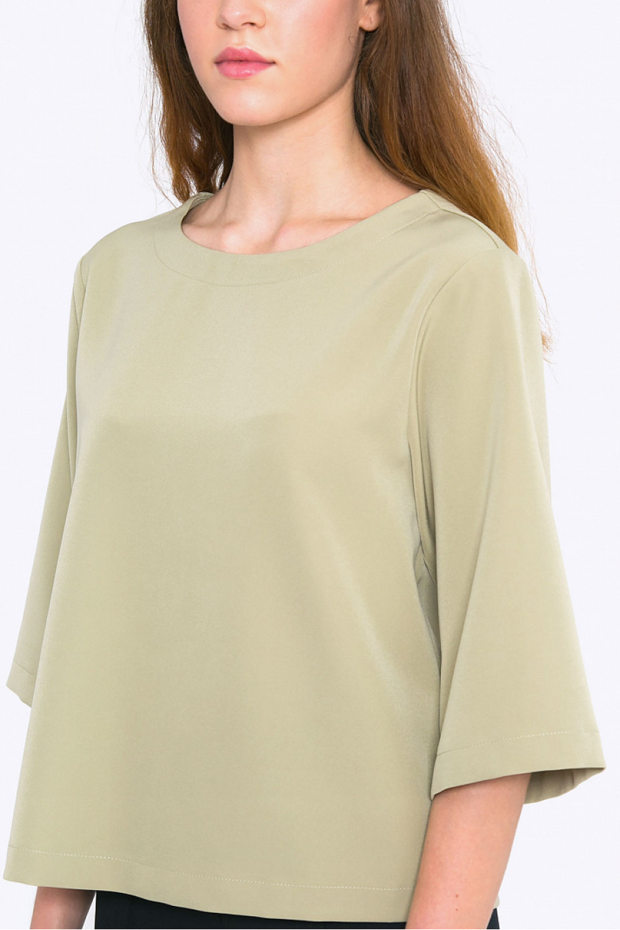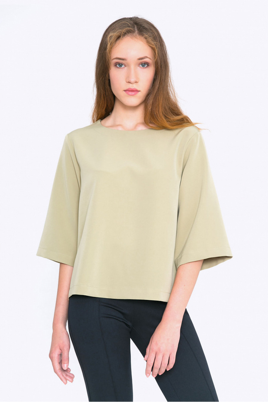 Блузка прямого кроя с застежкой - молнией на спинке. Модель со свободными рукавами. Ткань средней плотности, фисташкового цвета. Блузка универсальная, можно носить как с классическими юбками, так и с брюками в стилеCasual. Рост фотомодели 173 см.