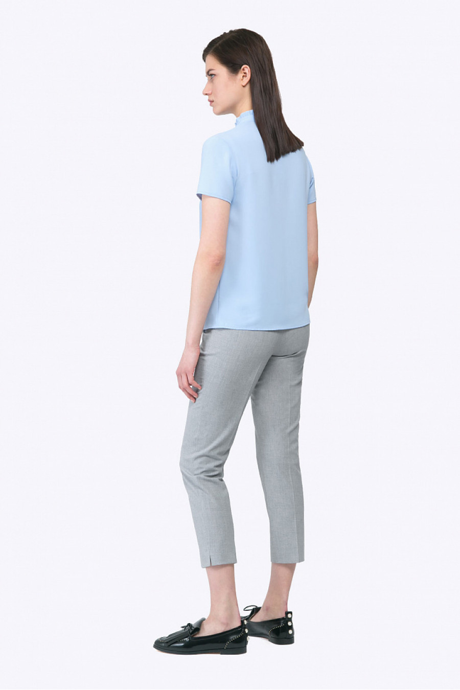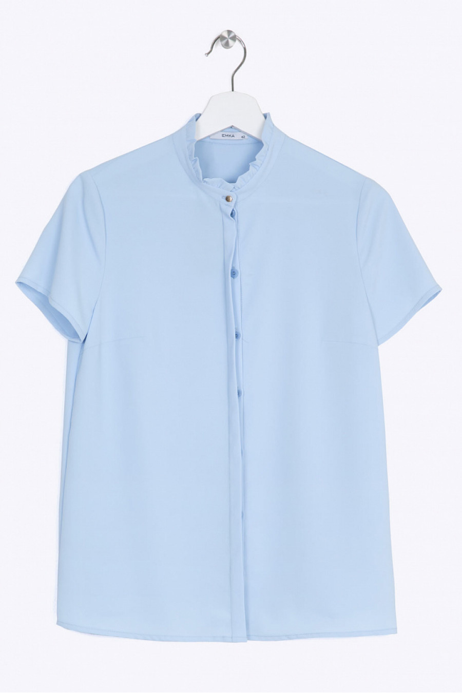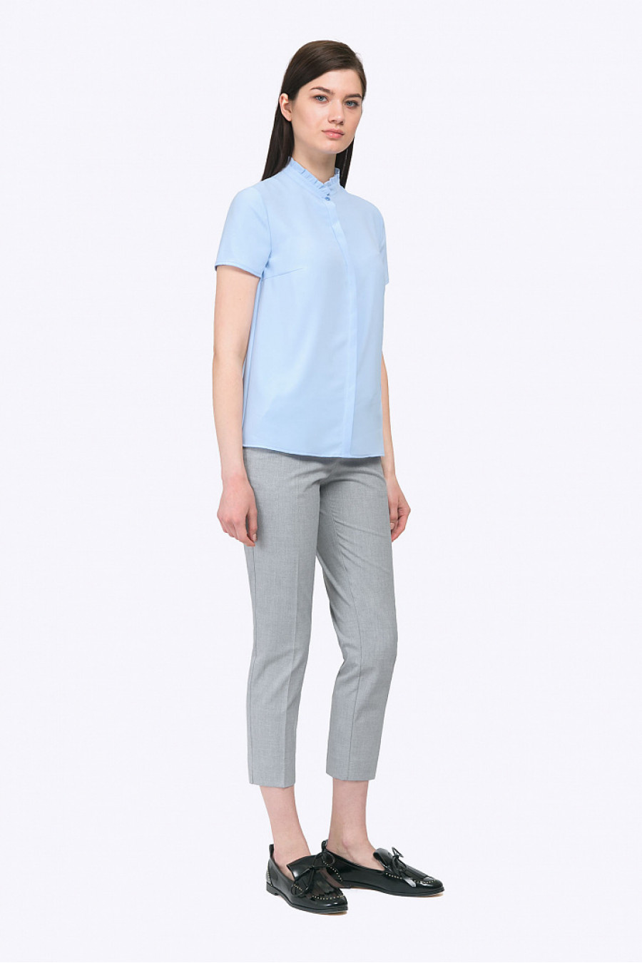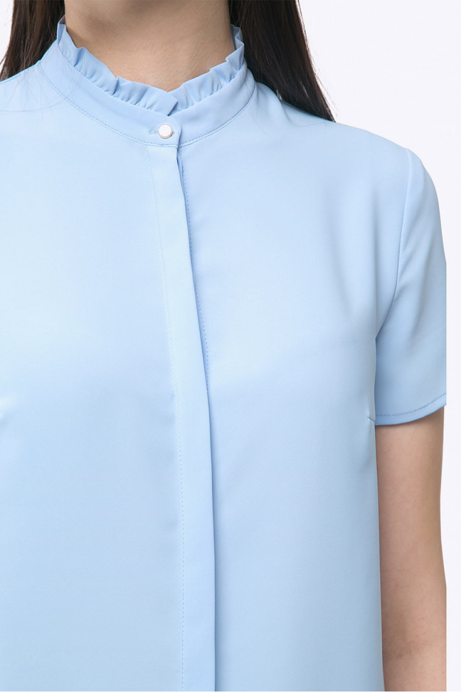 Блузка холодного голубого тона с воротником стойкой, коротким рукавом и закрытой планкой впереди. Выполнена из полиэстера, что обеспечивает модели практичность в носке. Незаменимая вещь в гардеробе деловой женщины. Образ на фото дополнен брюками D011-rainy . Рост фотомодели 178 см.