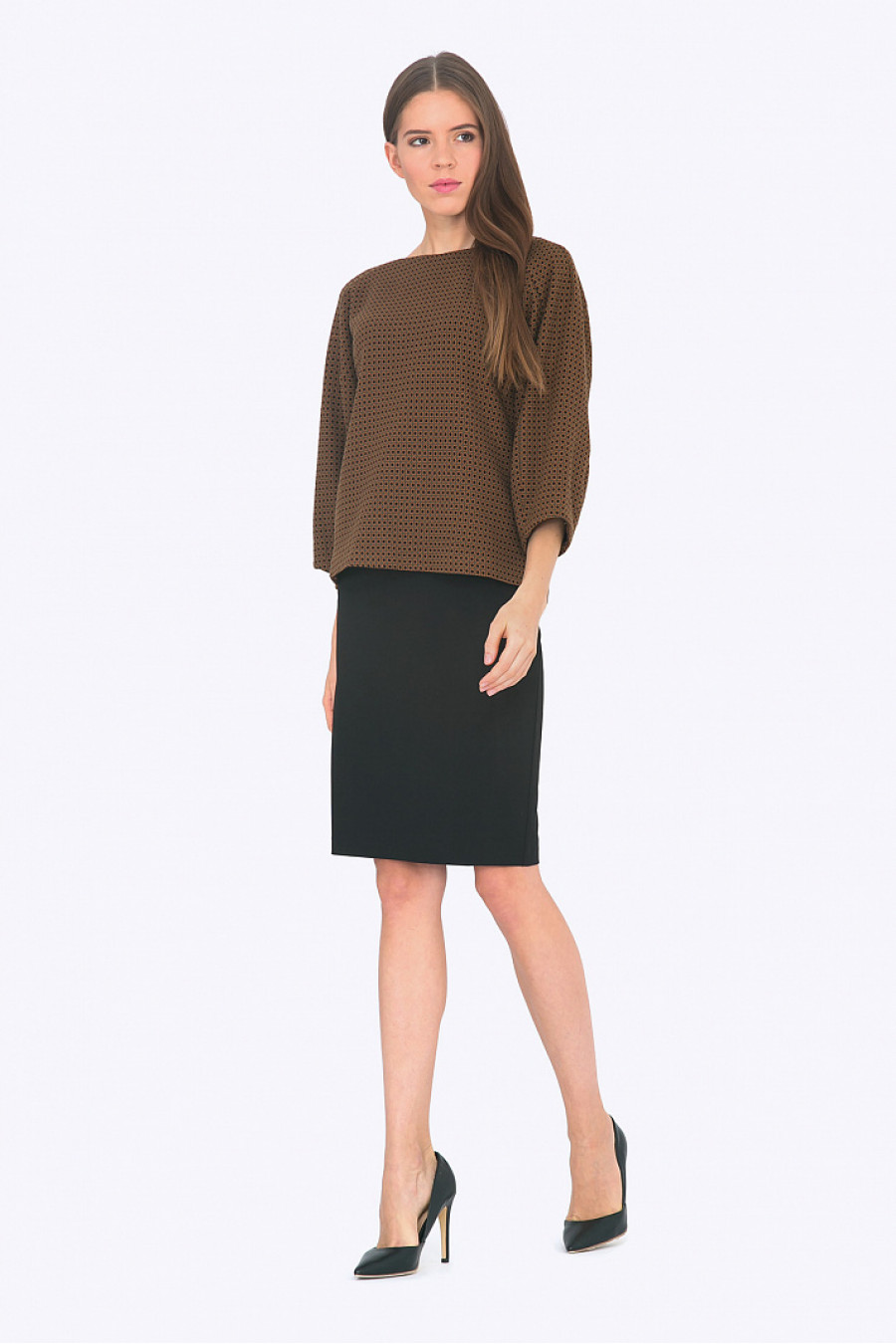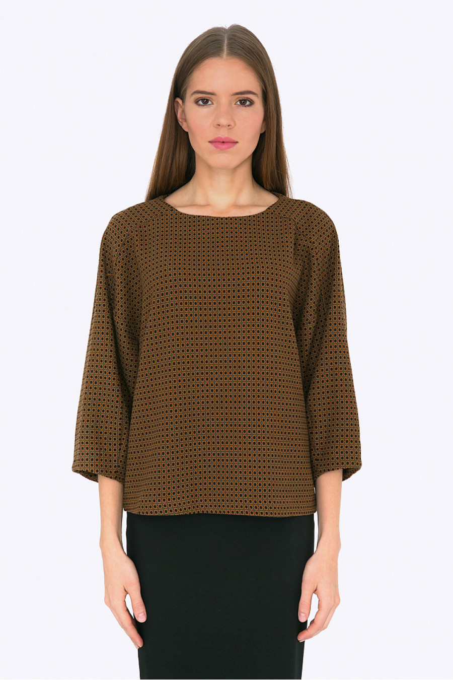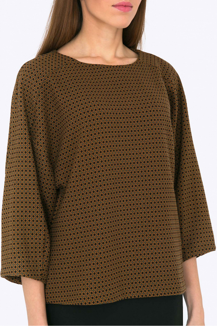 Блузка прямого кроя с рукавами реглан. Ткань плотная с узором. Рукава объемные, 3/4. Модель хорошо сидит по фигуре, прекрасно смотрится как c юбками, так и с брюками.Стильная блузка на каждый день и для офиса. Рост фотомодели 178 см.