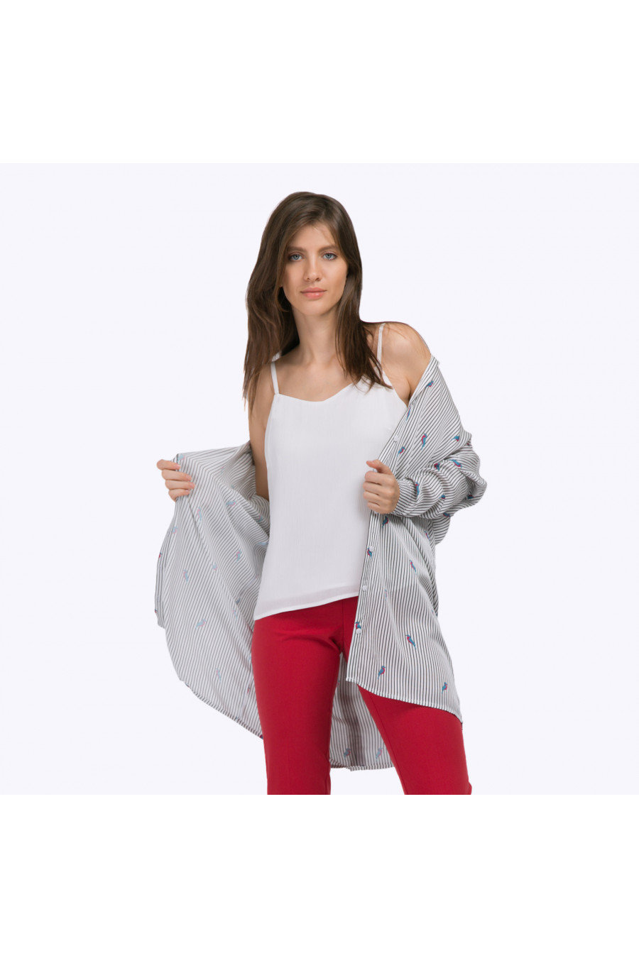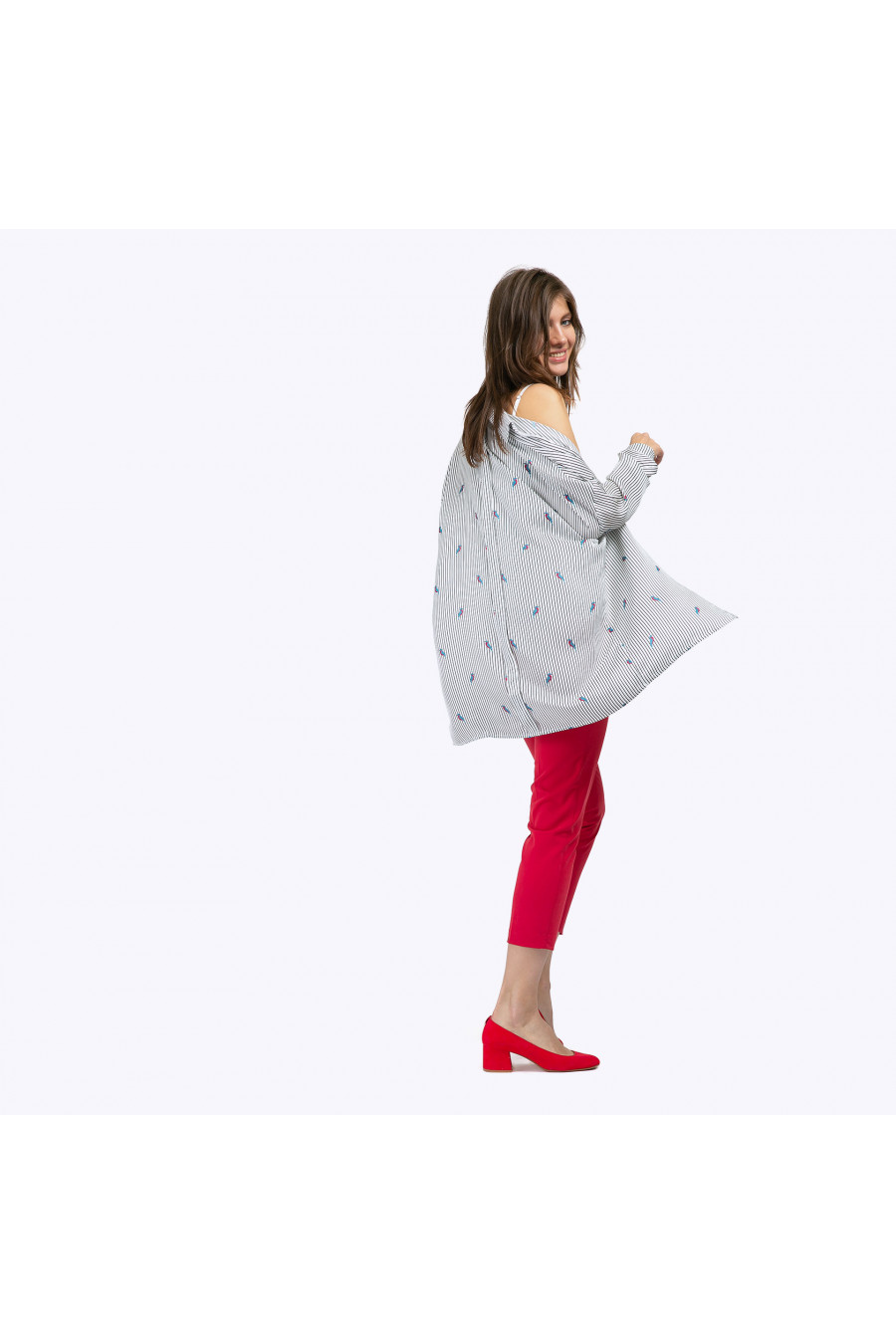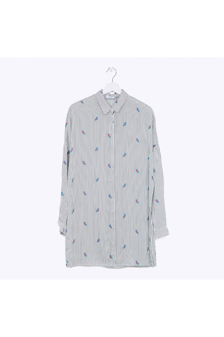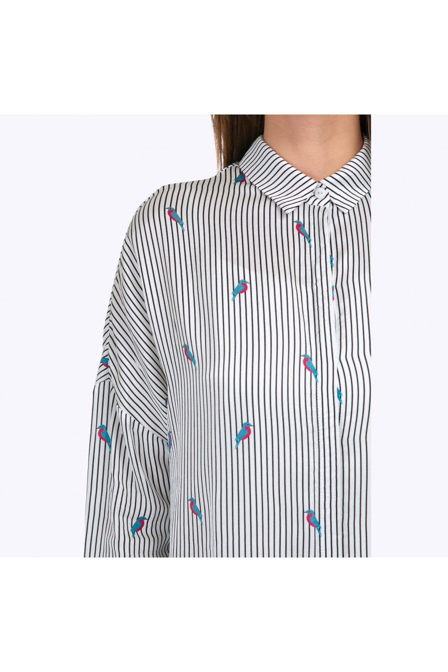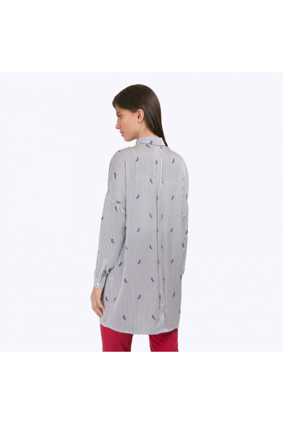 Блузка - туника вактуальном стиле oversize с длинными рукавами со спущенной проймой. Имеет рубашечный воротник, скрытую застёжку спереди и мягкую складку в районе спинки. Строгий ритм чёрных полосок принта неожиданно расцвечен яркими птицами сочных сине-малиновых оттенков, что в совокупности со свободным кроем позволяет подчеркнуть независимость и свободолюбивый характер. Образ на фото дополнен Блузкой B2249-bailey