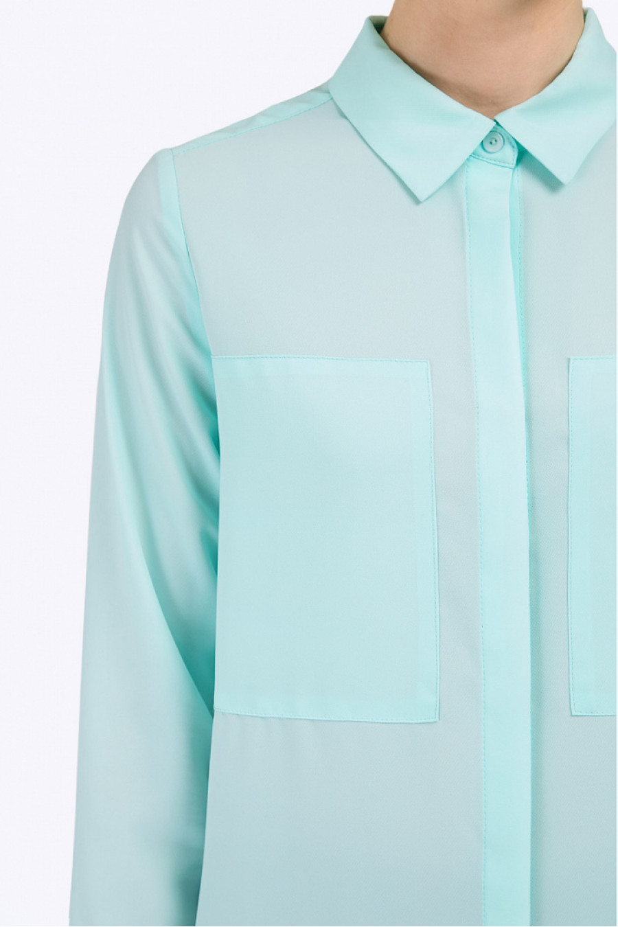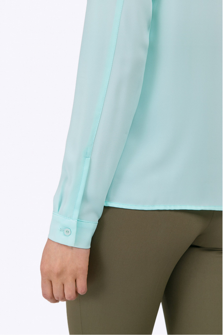 Блузка нежного мятного оттенка для создания образов в городском стиле. Модель имеет прямой покрой, свободное облегание по фигуре, рубашечный ворот.Спереди расположены потайная застёжка и крупные карманы, сзади имеется кокетка. Длинные рукава дополнены манжетами.Образ на фото дополнен брюками D051-rise .Рост фотомодели 172см.