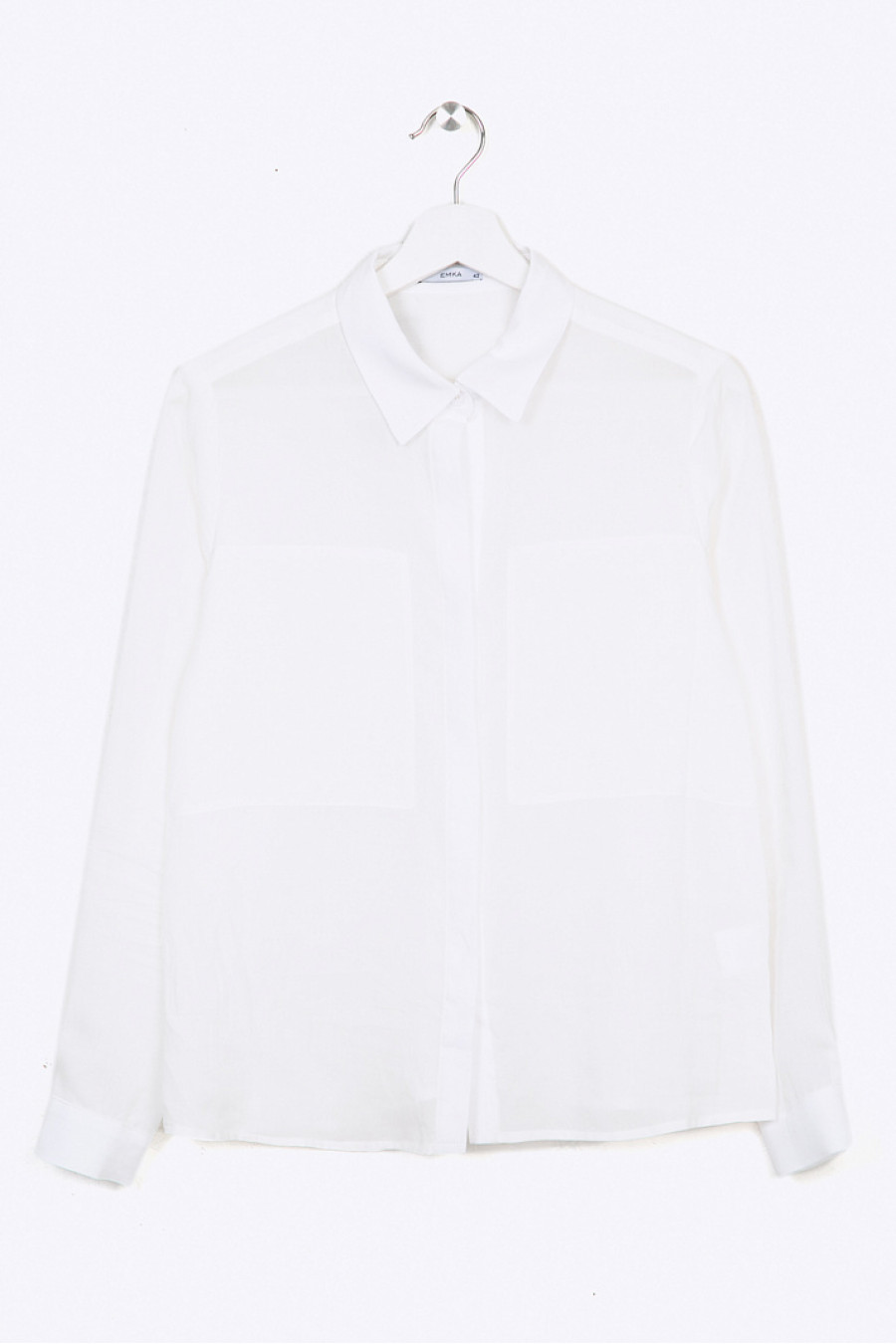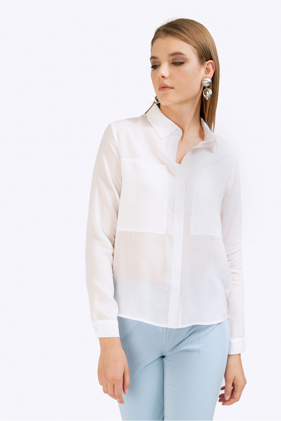 Белая блузка с длинными рукавами для образов в офисном стиле. Модель имеет отложной воротник, потайную застёжку, полочки спереди декорированы крупными накладными карманами, спинка выполнена на кокетке. Рукава дополнены манжетами на пуговке. Рост фотомодели 177 см.