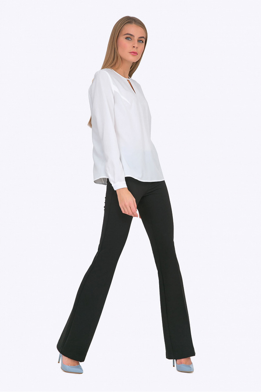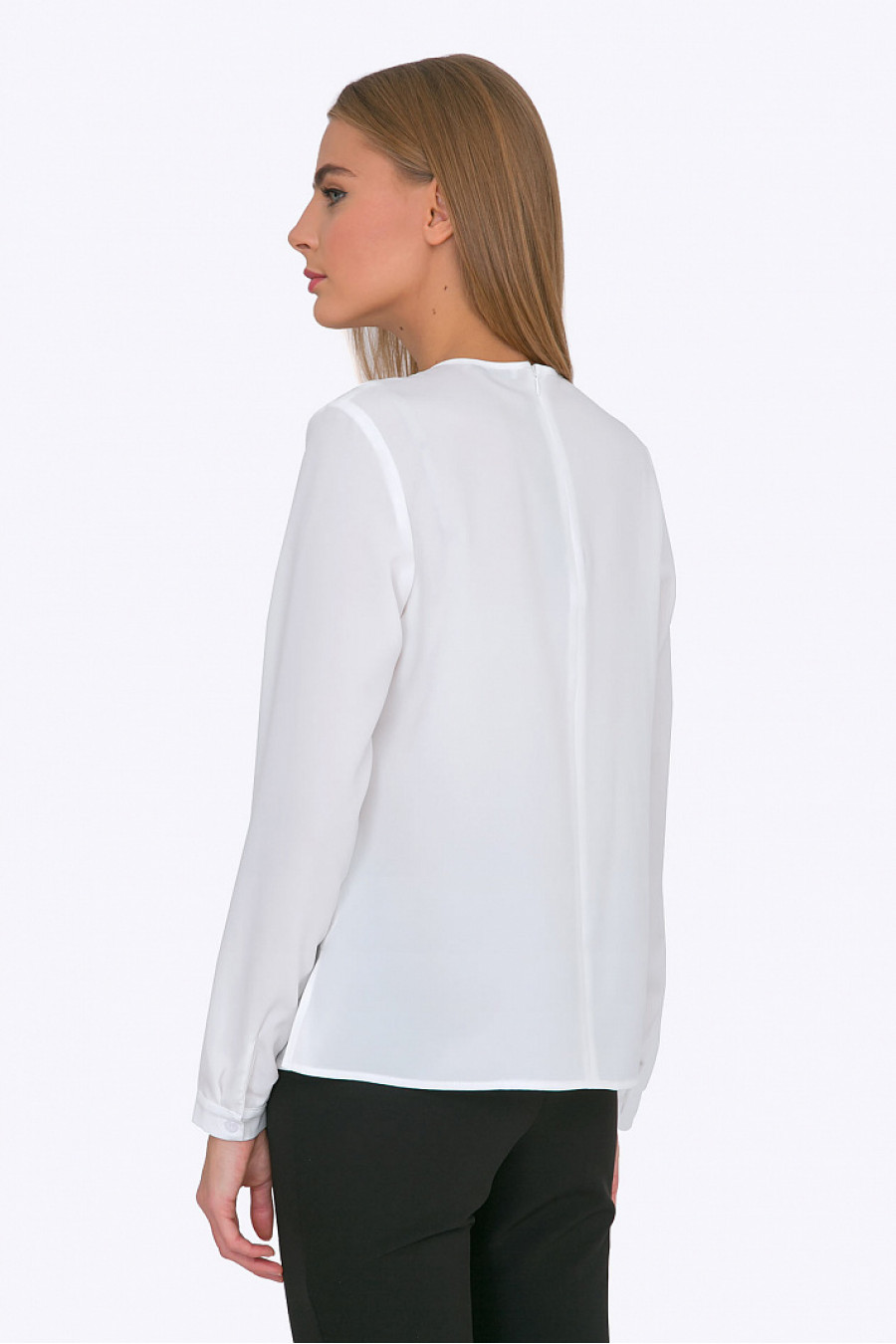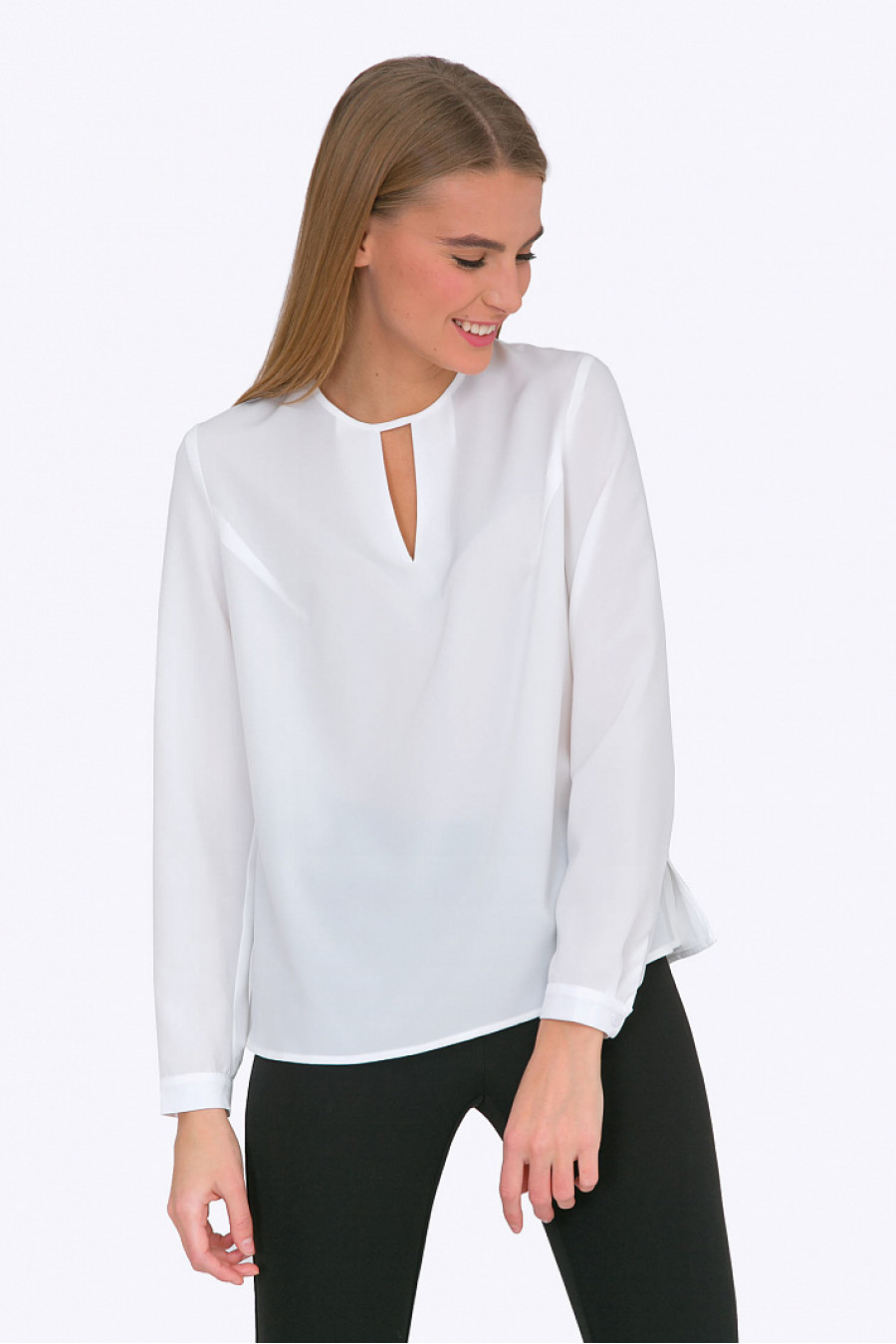 Лаконичная блуза из легкой ткани нежного оттенка айвори - непременно привлечет внимание поклонниц романтичного стиля. Гармоничный, слегка свободный крой, красивые линии выреза, тонкие манжеты - делают эту модель идеальной для создания выразительных женственных образов. С классическими черными брюками ( на фото) - образуем выдержанный офисный look, с юбкой-макси из богатой ткани, дорогими аксессуарами - элегантный вечерний. Блуза отлично смотрится на фигурах любого типа, будет неотразима на золотоволосых и блондинках. Мягкая смесовая ткань проста в уходе и приятна в носке. Образ на фото дополнен Брюками D067-premiera. Рост фотомодели 176 см.