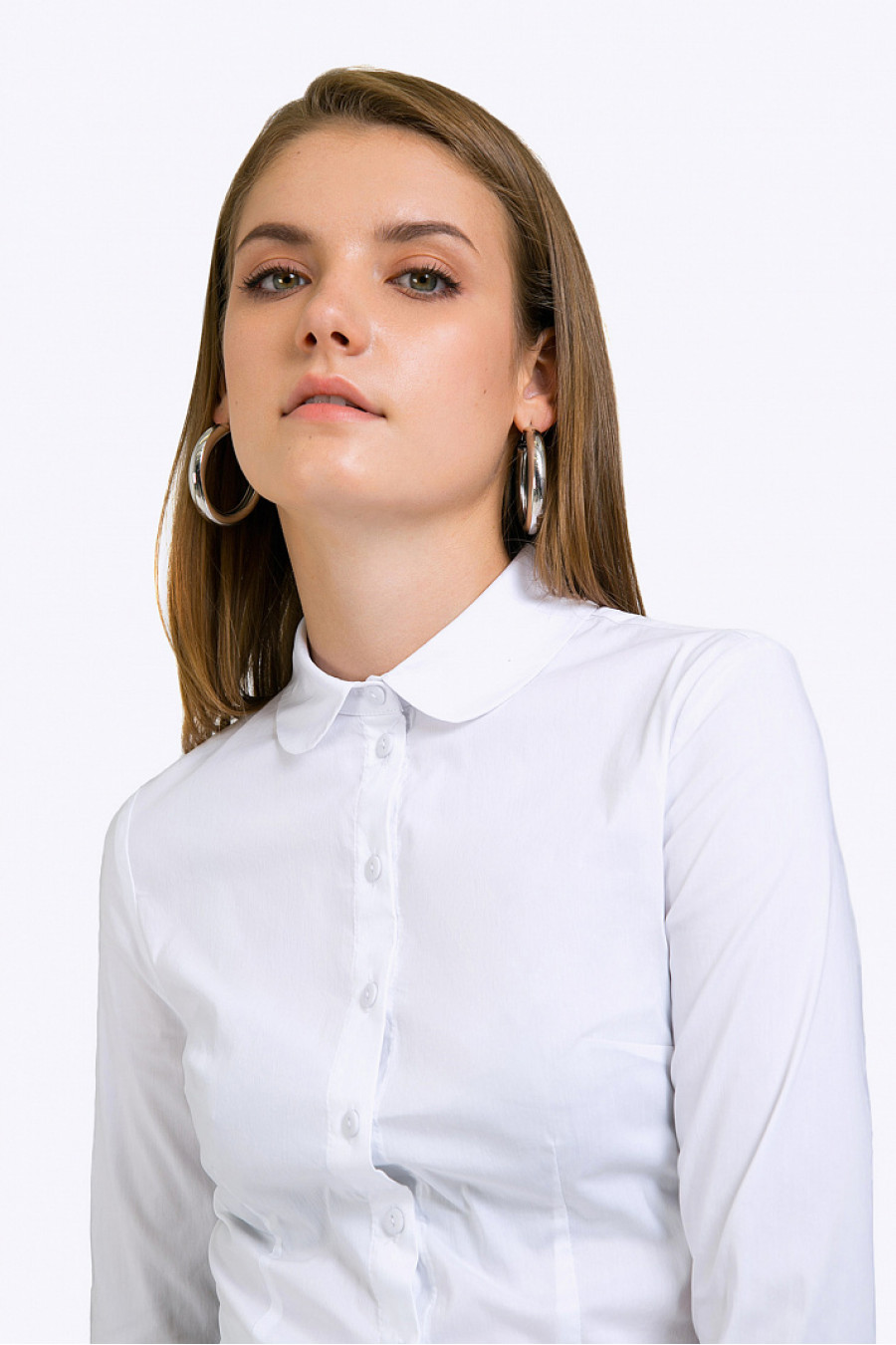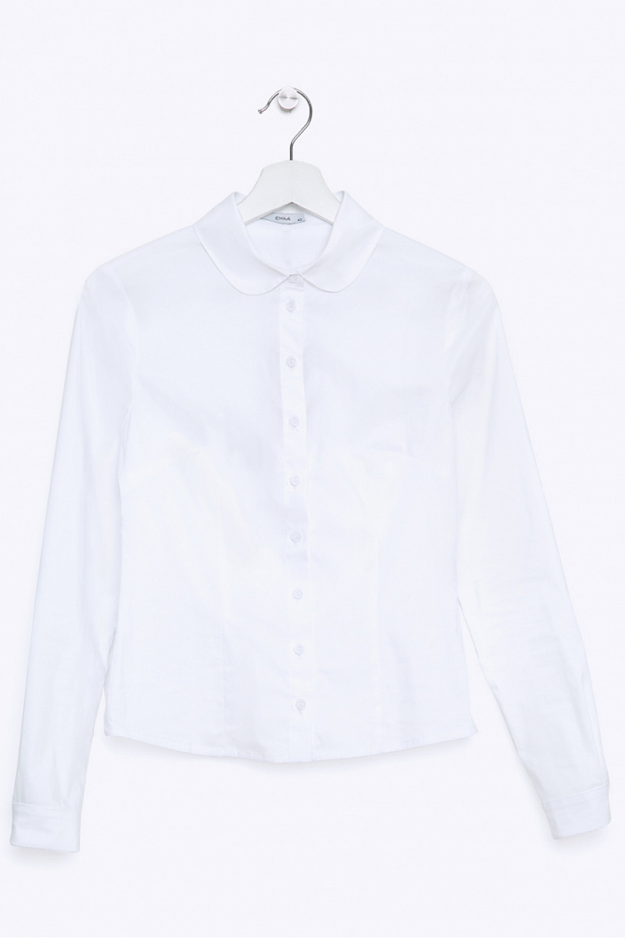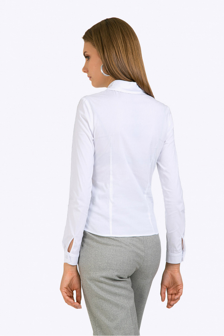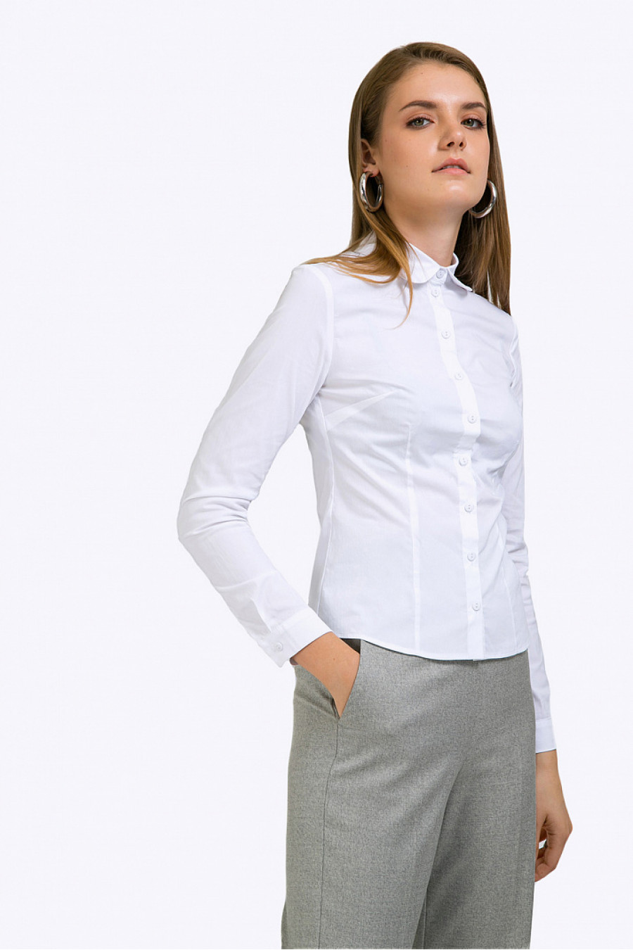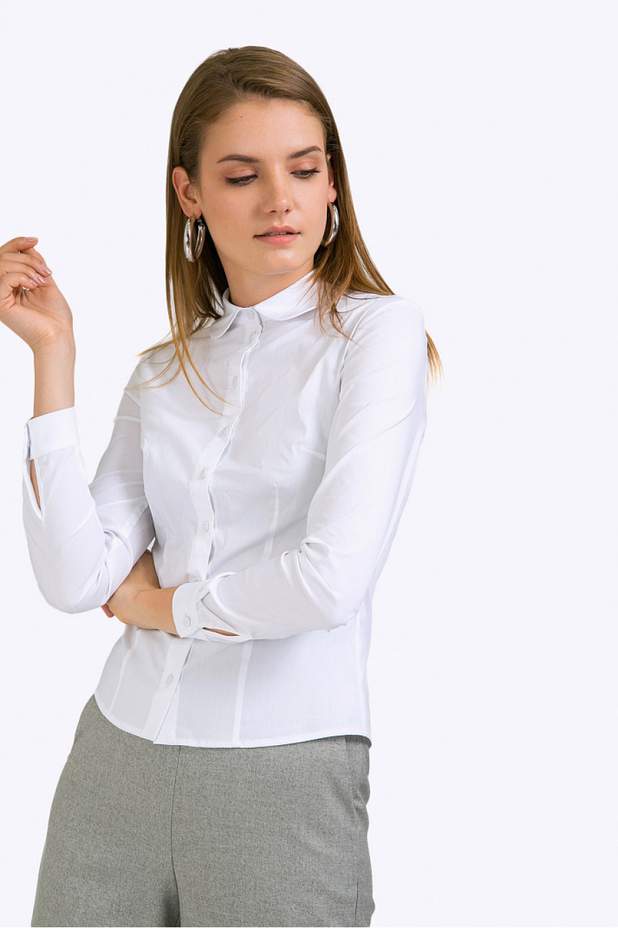 Белая блузка с длинными рукавами из стрейч-коттона. Модель приталенногосилуэта с мягкими плавными линиями, подолом фигурной формы, имеет круглыйрубашечный воротничок, вертикальную планку с пуговками, рукава дополненыманжетами. Образ на фото дополнен брюками D119-debra . Рост фотомодели 177 см.