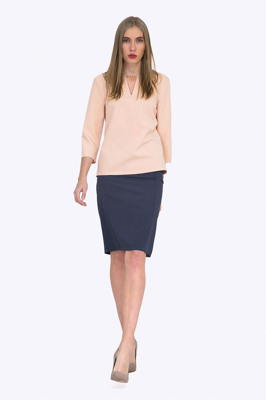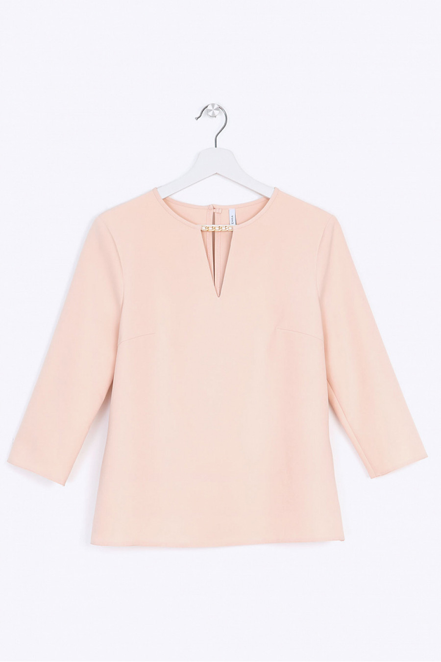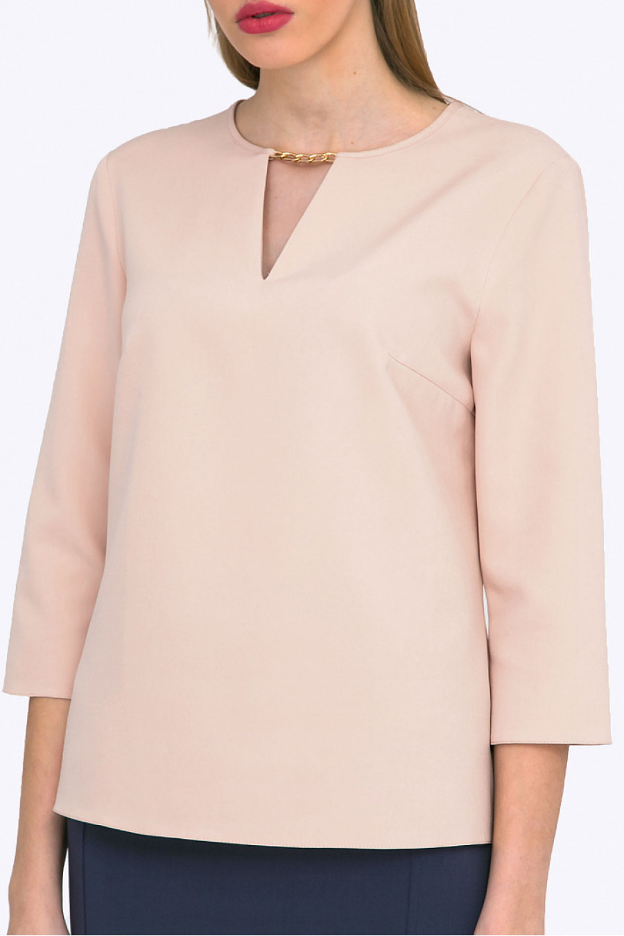 Блузка прямого кроя. Ткань плотная. Горловина с фигурным вырезом и декоративной цепочкой. Отличная модель для офиса, хорошо сочетается с классическими юбками и брюками. Рост фотомодели 177 см.