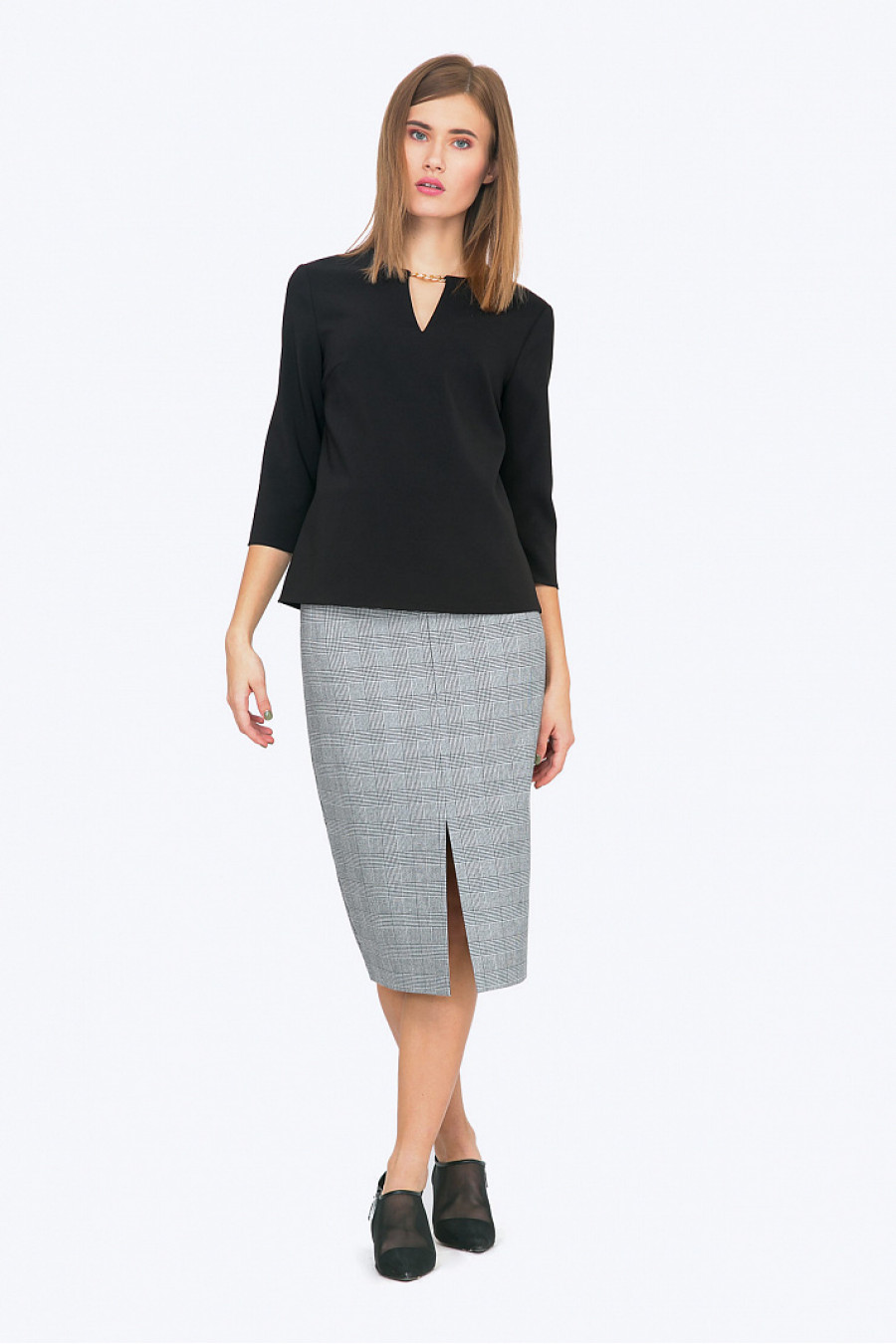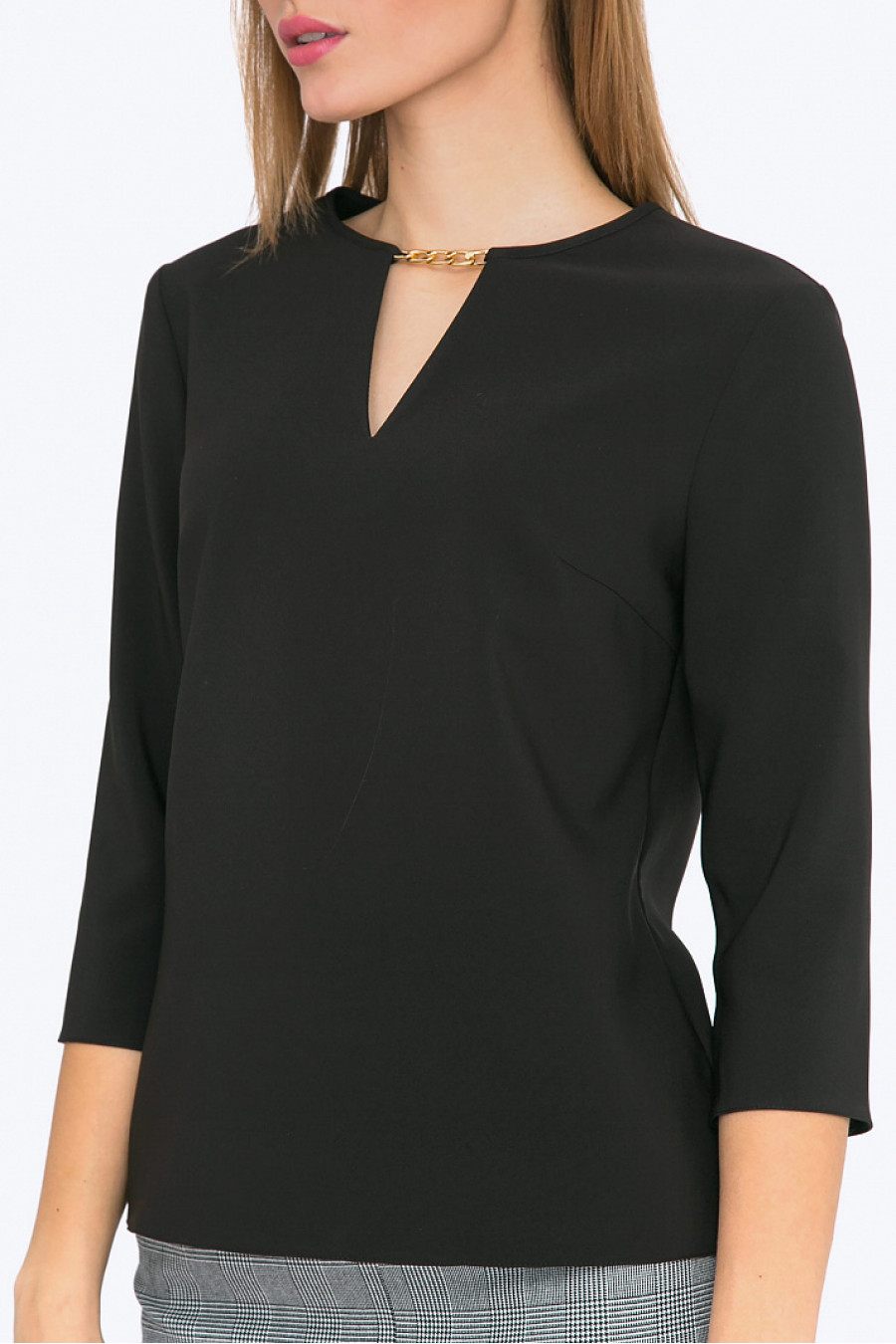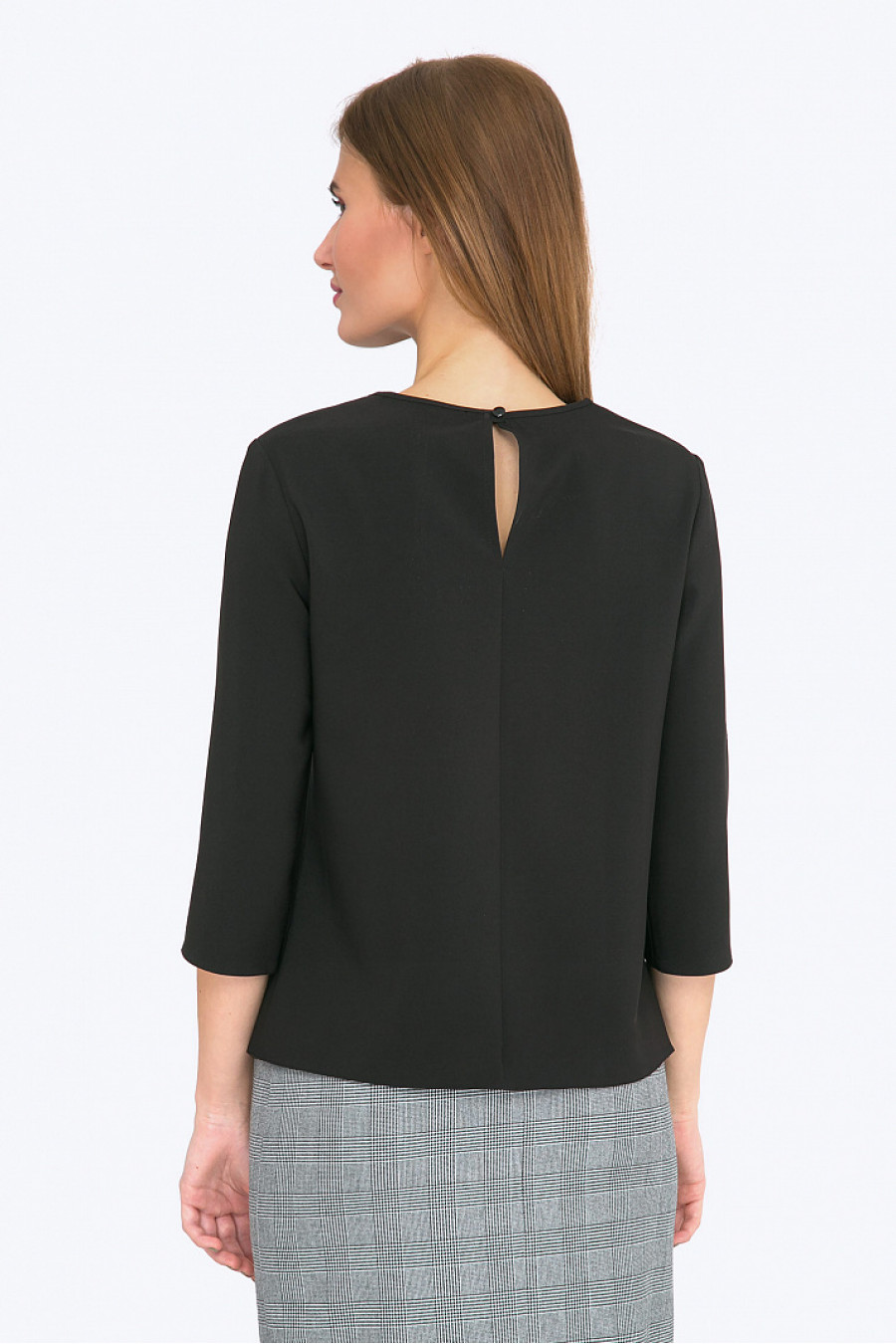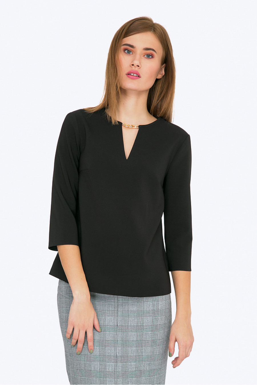 Элегантная блуза благородного черного цвета - прекрасный выбор для создания гармоничного вечернего образа (с юбкой - макси из богатой ткани) или повседневого делового look-a ( с серыми брюками или юбкой-карандаш - как на фото). Совершенные линии дизайна обеспечивают прекрасную посадку на фигурах любого типа. Гармоничная линия ворота, декоративная золотистая цепочка и красивый вырез под застежку сзади - подчеркнут красоту шеи, слегка укороченный рукав - привлечет внимание к ладоням. Плотная, но мягкая смесовая ткань с содержанием вискозы проста в уходе и приятна в носке. Образ на фото дополнен Юбкой S616-oxford. Рост фотомодели 175 см.