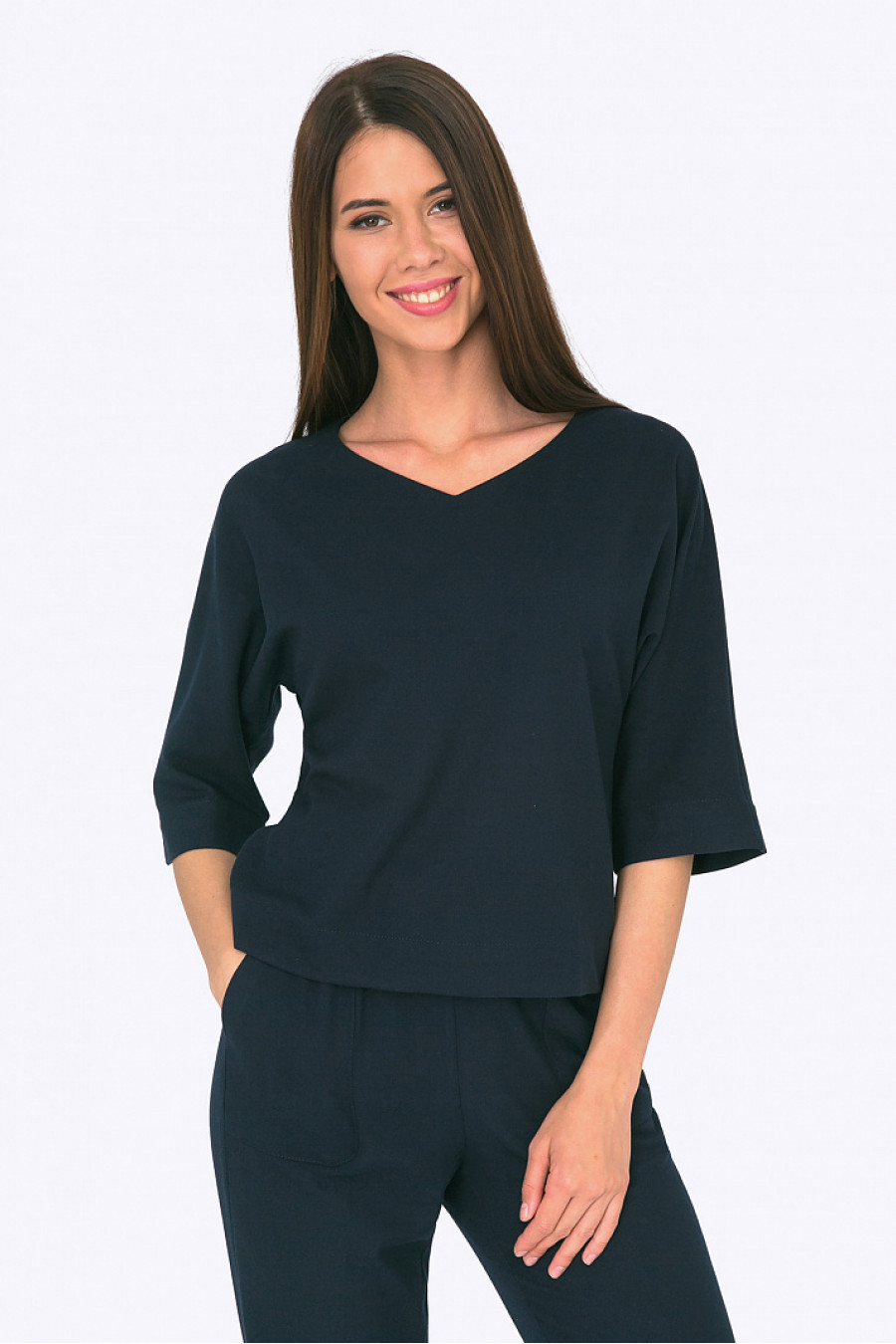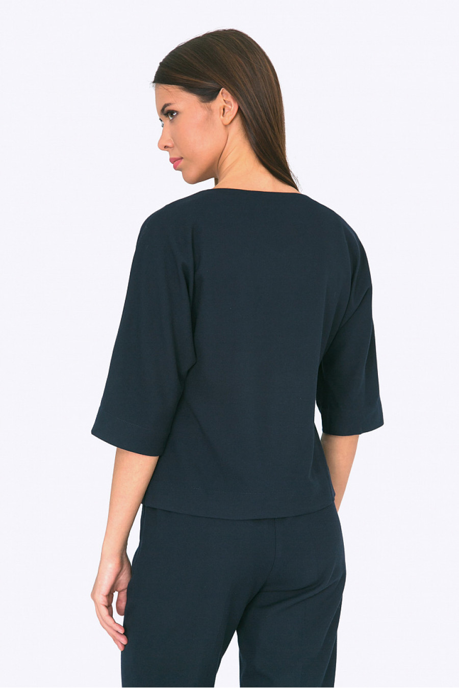 Укороченная блузка с цельнокроеным рукавом. Модель прямого кроя с V-образным вырезом горловины. Ткань мягкая. Стильная модель как для офиса, так и на каждый день. Рост фотомодели 172см.