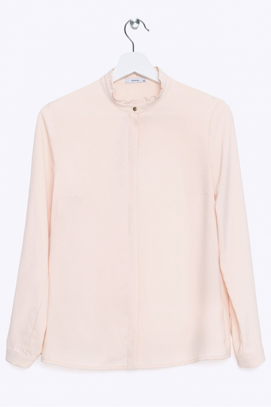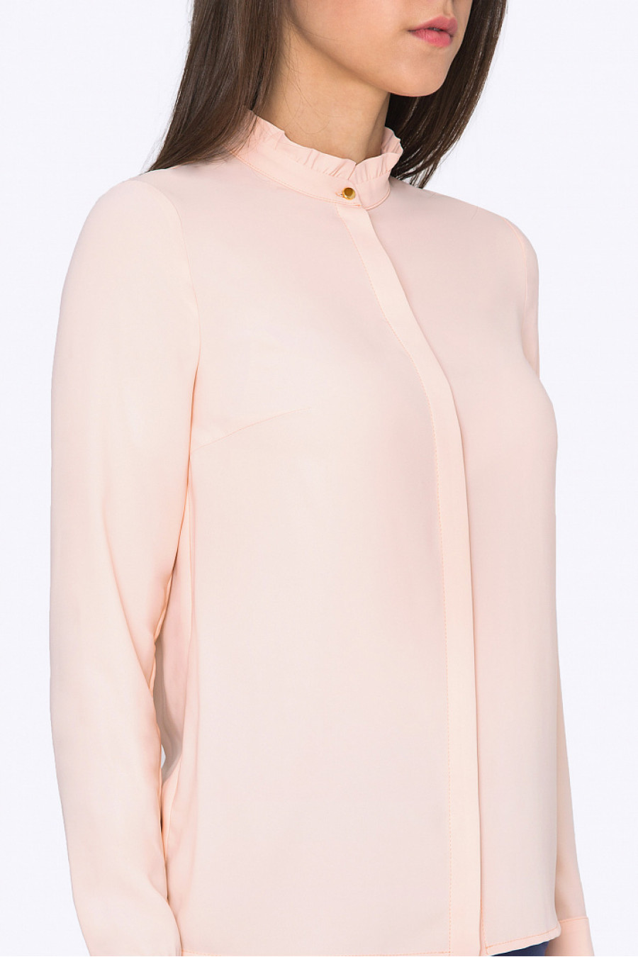 Блузка из легкого текстиля, приятного персикового цвета, с оборкой по горловине. Без подкладки. Застежка-планка на пуговицах. Модель хорошо сидит по фигуре, слегка просвечивает. Блузка может стать прекрасным дополнением делового образа или создать нежный, романтический наряд для женщин, которые стремятся быть в центре внимания. Рост фотомодели 175см.