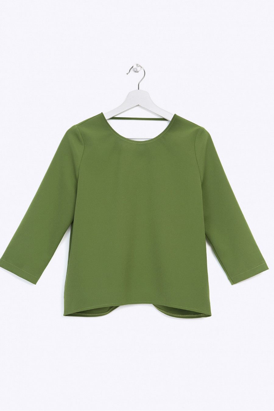 Блузка прямого кроя с V-образным вырезом и декоративным узлом на спинке. Ткань плотная. Рукава 3/4. Блузка прекрасно дополнит повседневный образ или вечерний лук. Рост фотомодели 178 см.