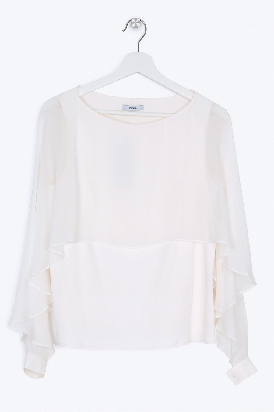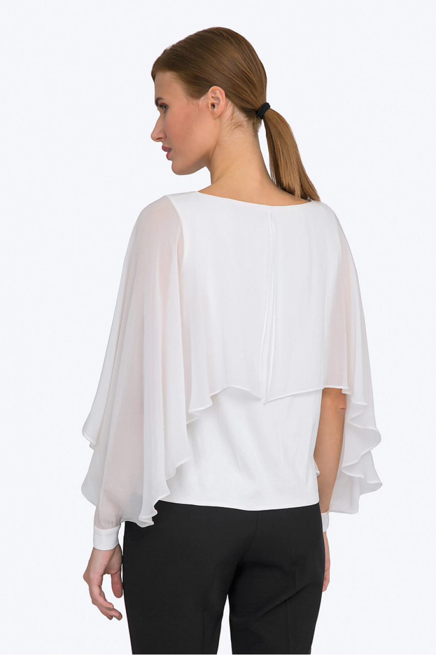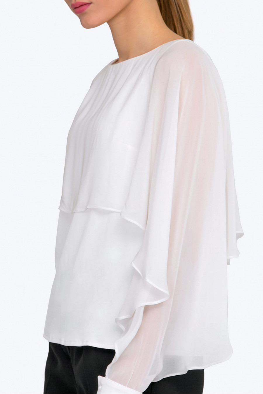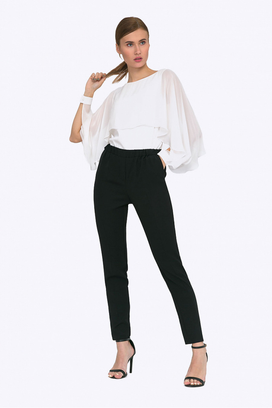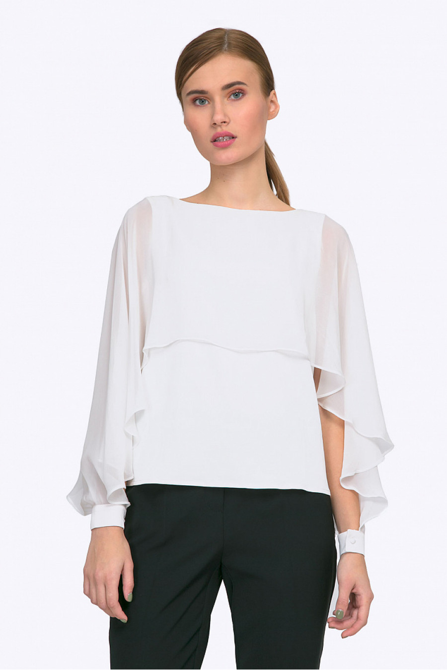 Нежный образ светлого ангела, созданный с помощью этой креативной вечерней блузки - станет отличным выбором для праздничного приема или свидания, приятно удивит окружающих и запомнится надолго. Кокетка из легкой ткани в виде крыльев и элегантные манжеты выделят красоту рук, лаконичные линии основы подчеркнут замысел дизайна. Совершенный фасон этой модели не нуждается в украшениях или аксессуарах, - для выхода в свет достаточно подходящего выразительного макияжа и прически. В комплект можно подобрать как черные так и белые брюки или юбку-макси. Легкая, но плотная ткань с большим содержанием вискозы приятна в носке и проста в уходе. Блуза будет отлично смотреться на блондинках и золотоволосый.Образ на фото дополнен Брюками D055-carlota. Рост фотомодели 175 см.