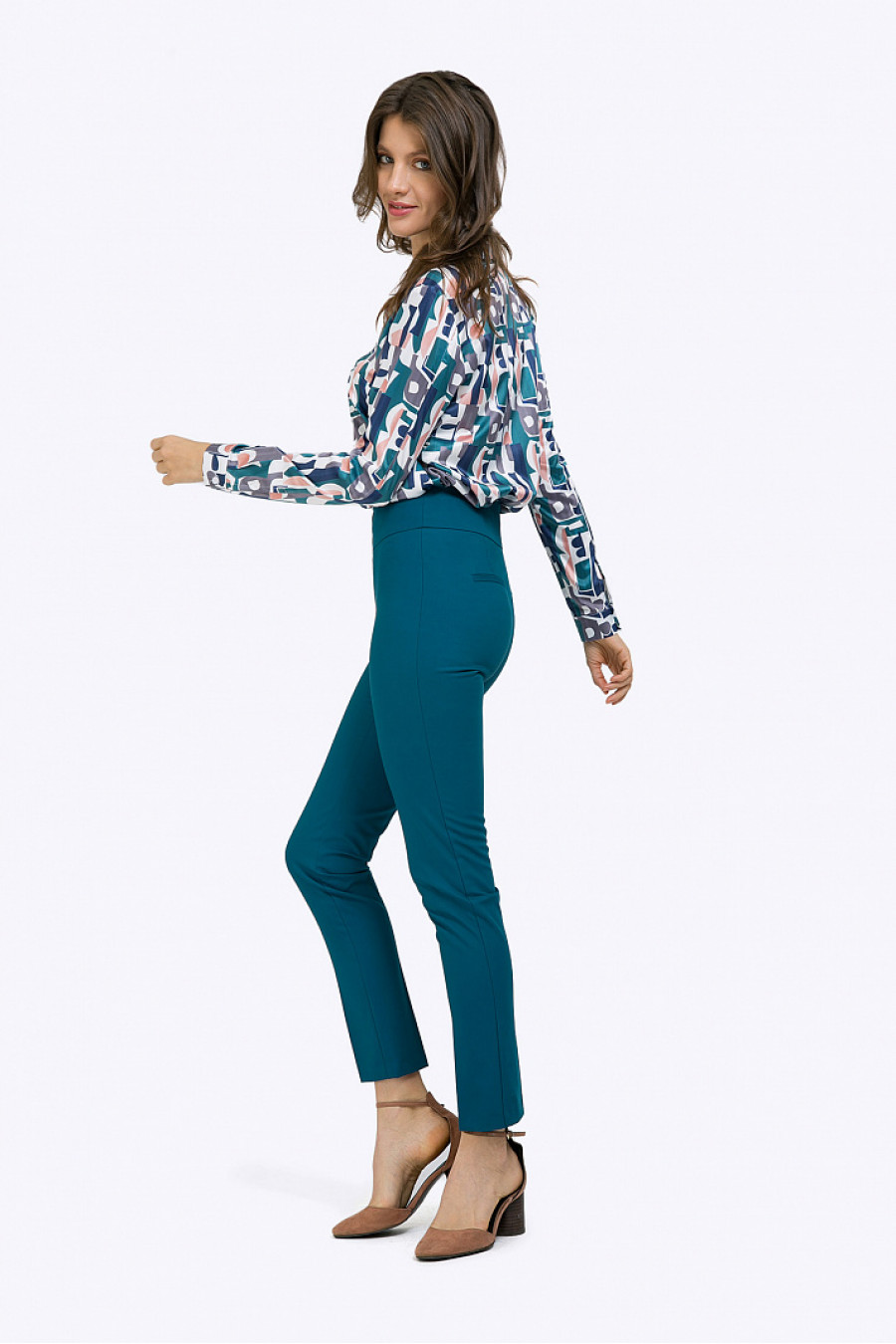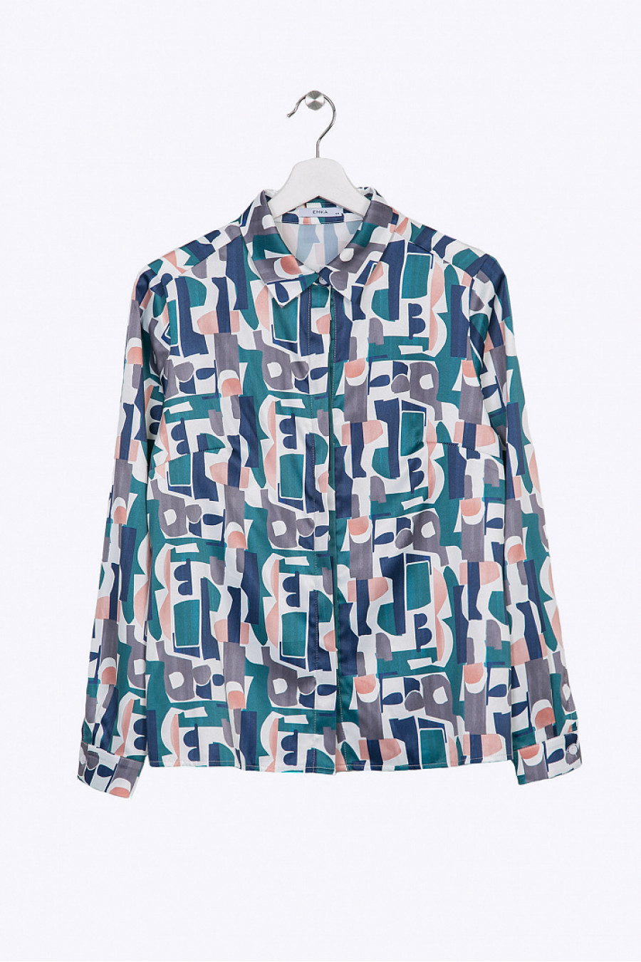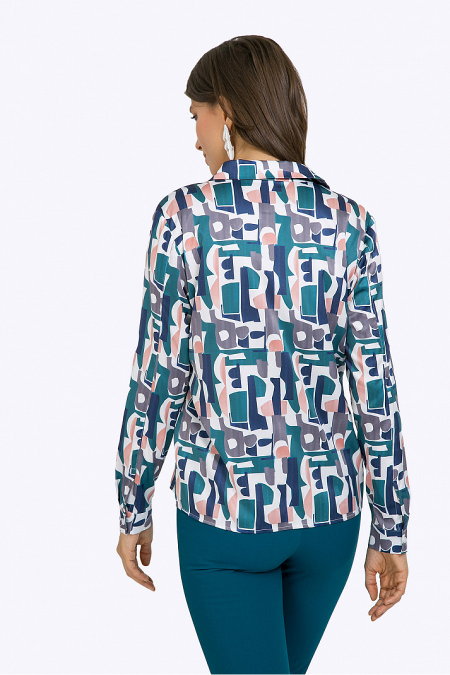 Блузка с абстрактным принтом в полифоничной цветовой гамме спреобладанием холодной палитры. Выполнена из эластичной поливискозы с благородным атласным блеском. Модель прямого силуэта, со свободным облеганием пофигуре, имеет отложной воротник, потайную застёжку, длинные рукава с манжетами. Рост фотомодели 177 см.