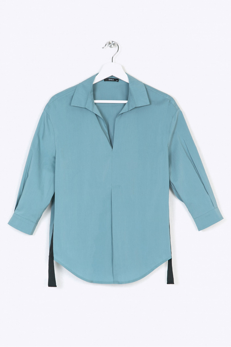 Блузка прямого силуэта из серо-голубого хлопка. Модель имеет свободное облегание, заниженную пройму, фигурно выполненный подол. V-образный вырезгорловины заканчивается рубашечным воротом. Лиф спереди имеет заутюженнуюскладку, спинкаукрашена кокеткой. Боковые швы модели акцентированы широкойтесьмой контрастного чёрного цвета. Рукава 3-4 дополнены манжетами. Образ на фото дополнен брюками D098-matilda . рост фотомодели 175см.