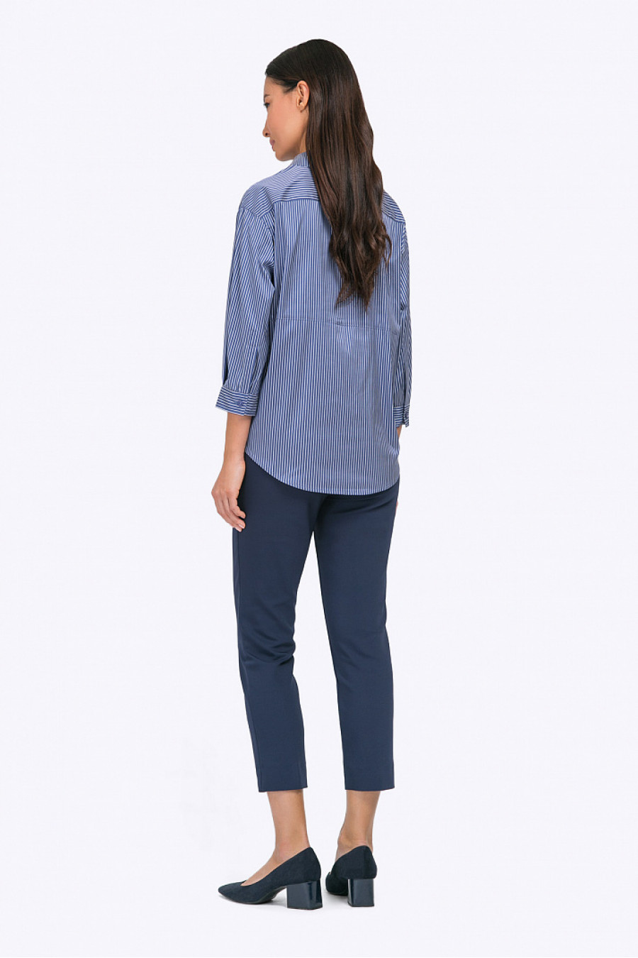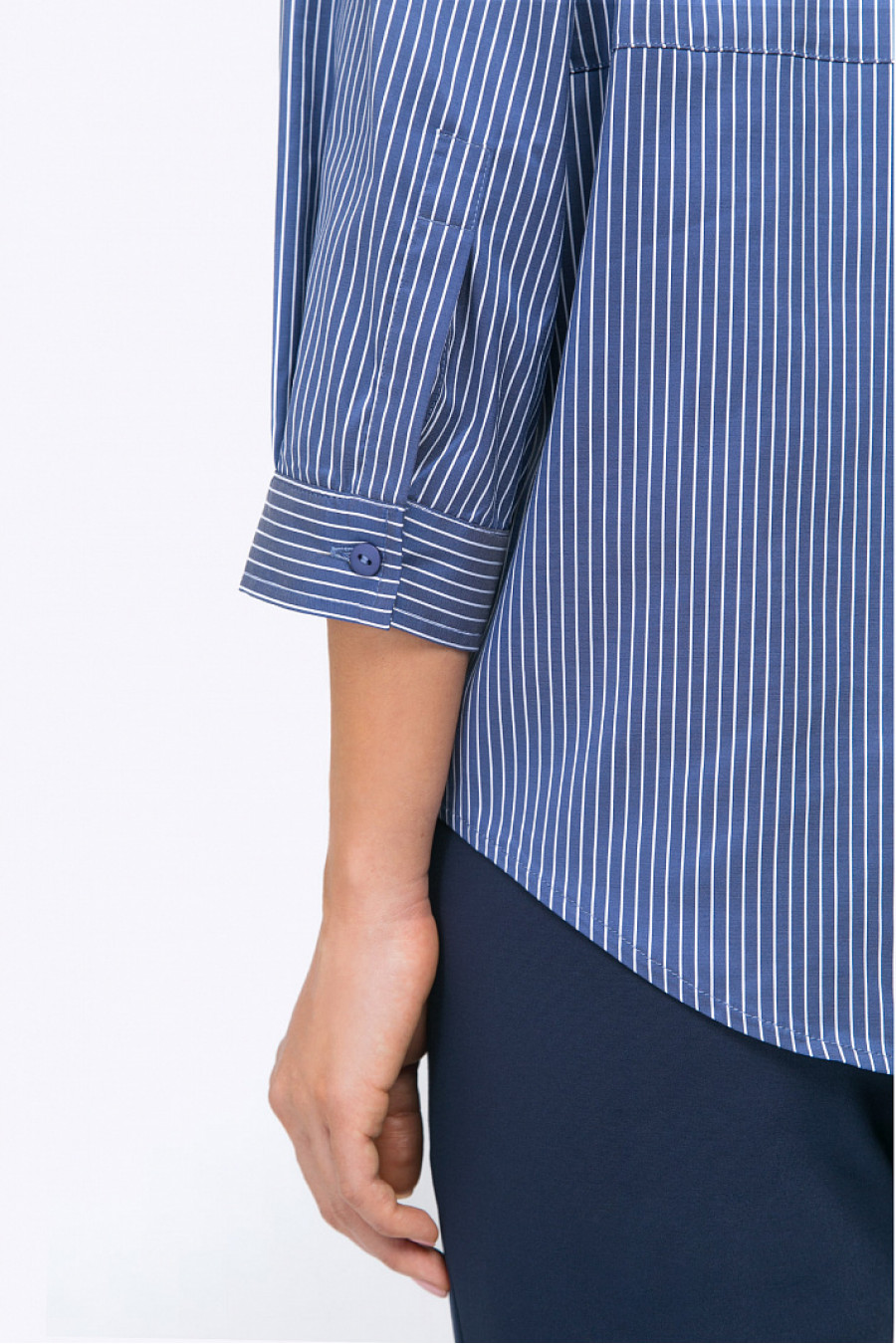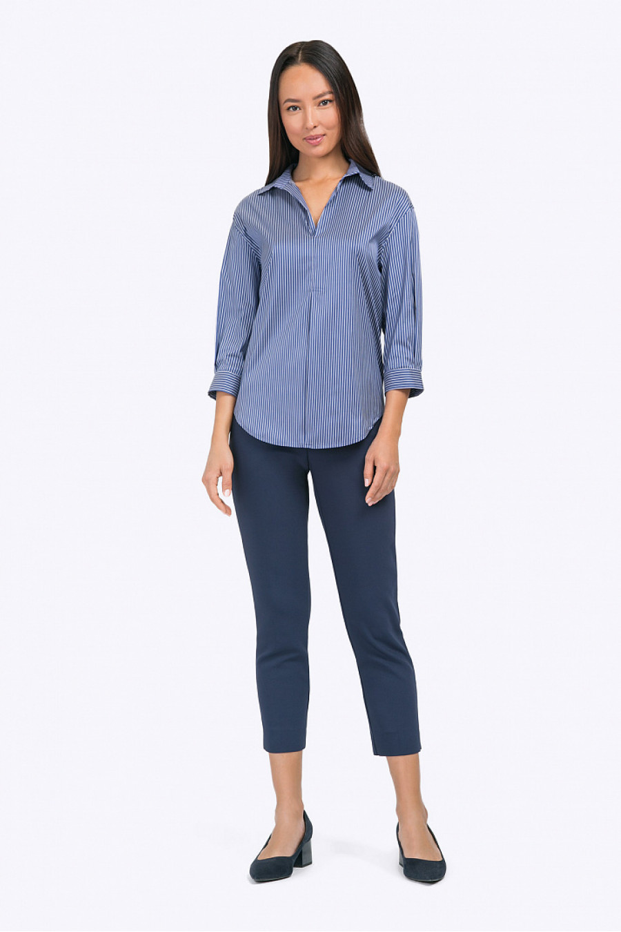 Блузка в свободном городском стиле из габардина синего цвета в узкую белую полоску. Модель имеет спереди заутюженную одностороннюю складку, сзадикокетку, фигурно выполненный подол.V-образный вырез горловины дополненрубашечным воротом. Рукава ¾ с заниженной проймой и манжетами на пуговичках. Образ на фото дополнен брюками D019-chester . Рост фотомодели 175см.