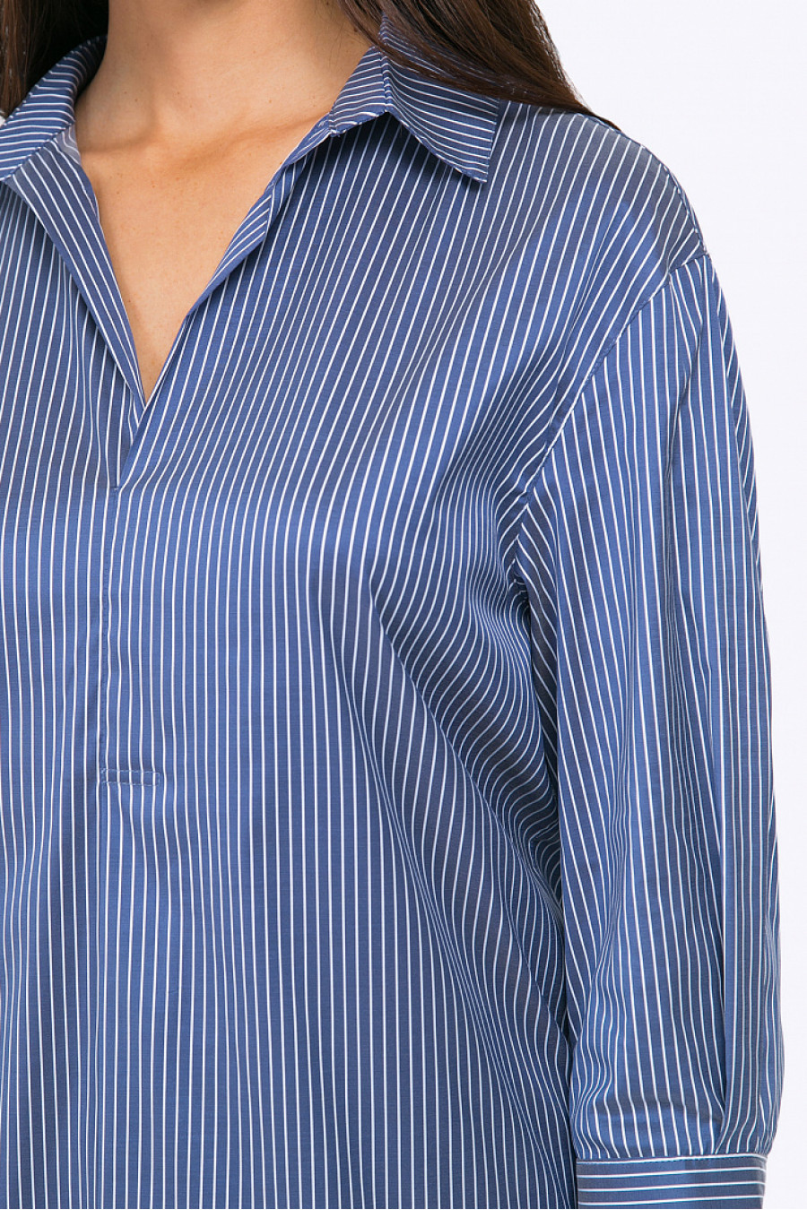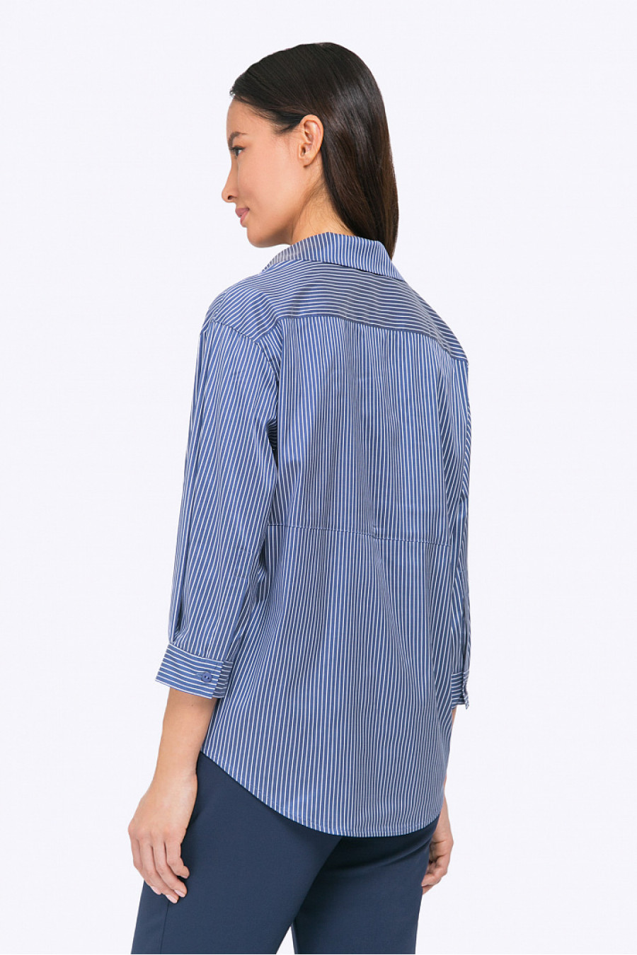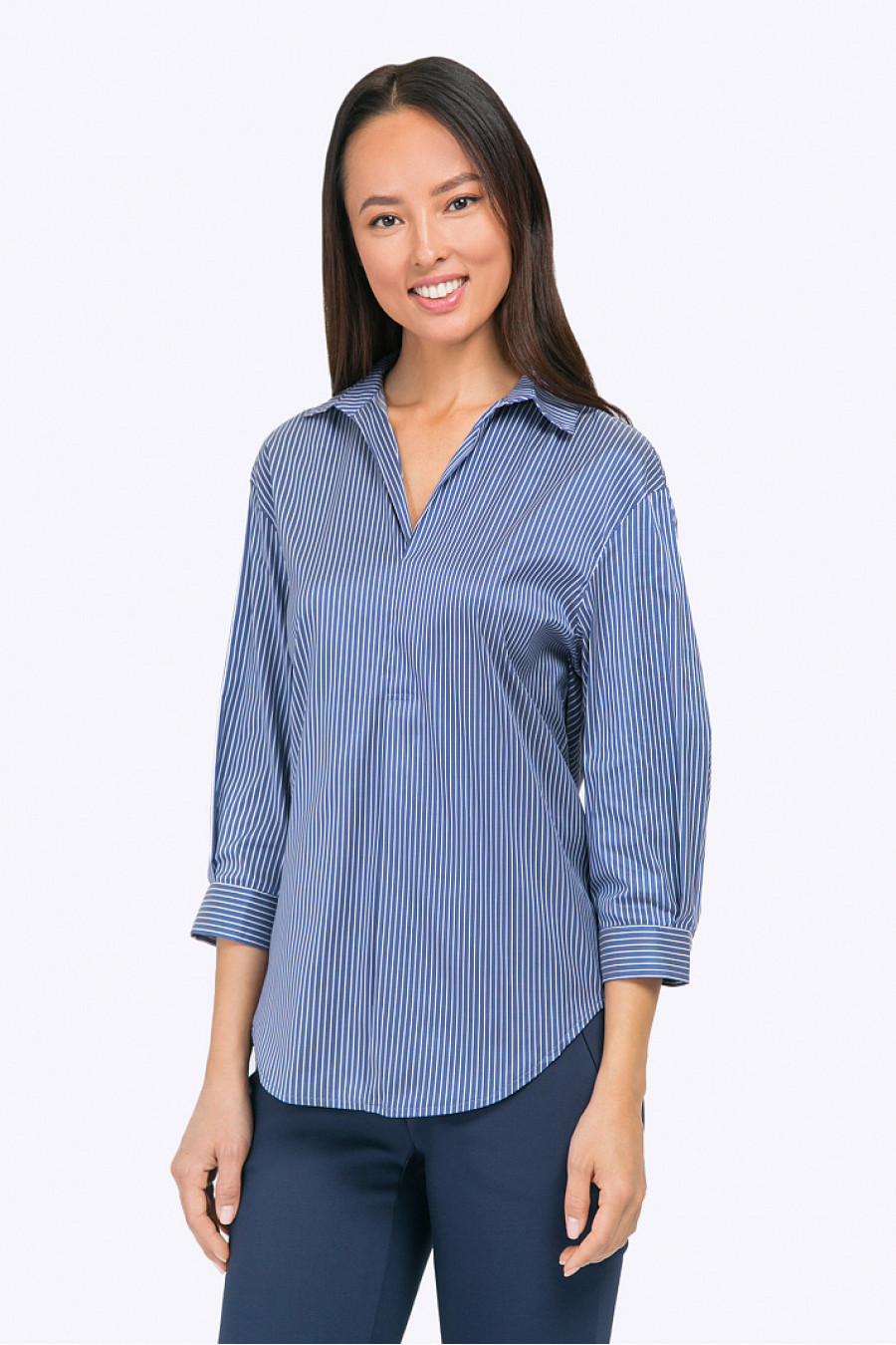 Блузка в свободном городском стиле из габардина синего цвета в узкую белую полоску. Модель имеет спереди заутюженную одностороннюю складку, сзадикокетку, фигурно выполненный подол.V-образный вырез горловины дополненрубашечным воротом. Рукава ¾ с заниженной проймой и манжетами на пуговичках. Образ на фото дополнен брюками D019-chester . Рост фотомодели 175см.