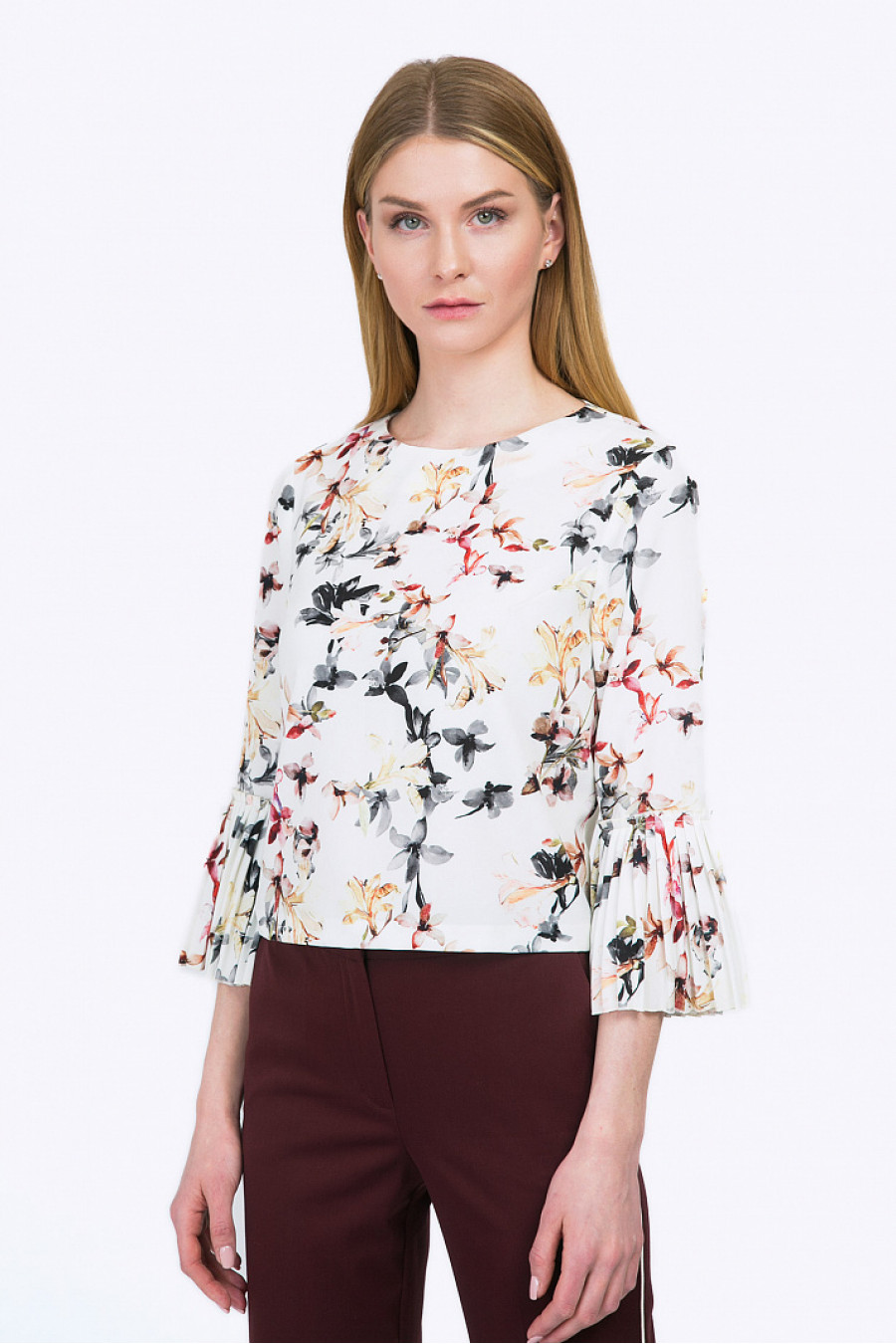 Нежная блуза с цветочным принтом - непременно привлечет внимание поклонниц индивидуального стиля. Гармоничный свободный крой, красивые линии выреза, плиссировка на рукавах- делают эту модель идеальной для создания выразительных женственных образов. С пастельных тонов юбкой-карандаш (на фото) - образуем выдержанный офисный look. Блуза отлично смотрится на фигурах любого типа, будет неотразима на золотоволосых и шатенках. Рост фотомодели 174 см.