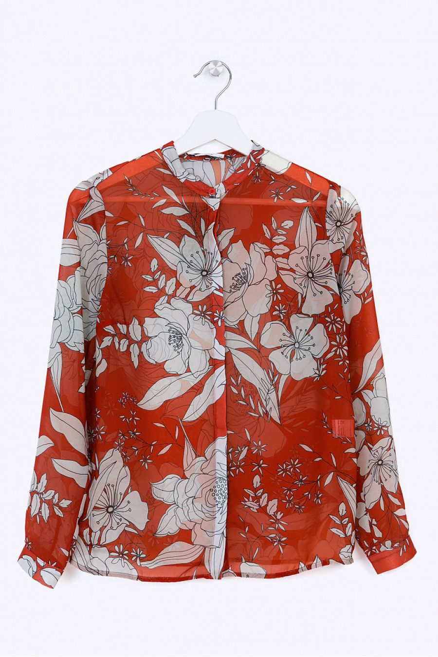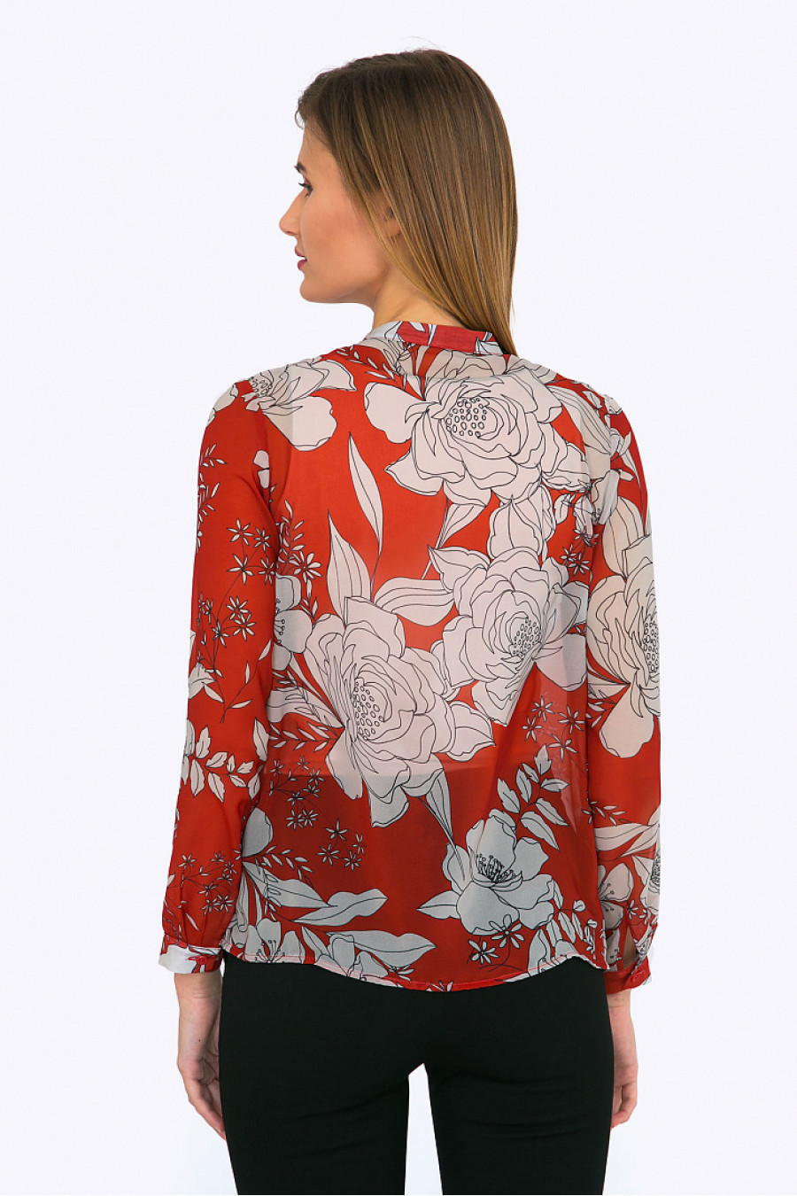 Шифоновая блузка с цветочным принтом. Модель прямого кроя без воротника,с длинными рукавами. Блузка хорошо сидит по фигуре. Прекрасный выбор на каждый день и для офиса. Образ на фото дополняют Брюки D035-twinkle. Рост фотомодели 177 см.
