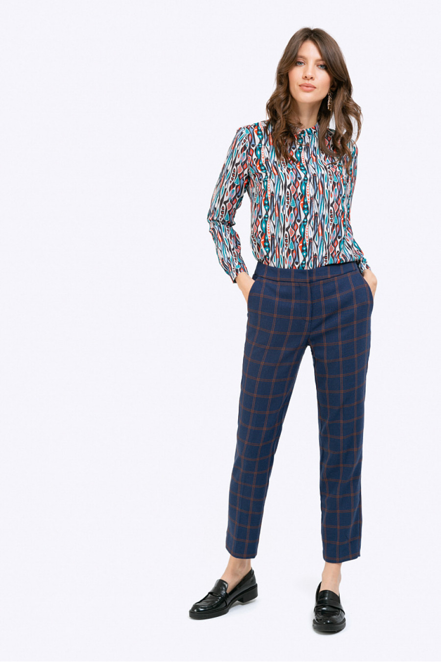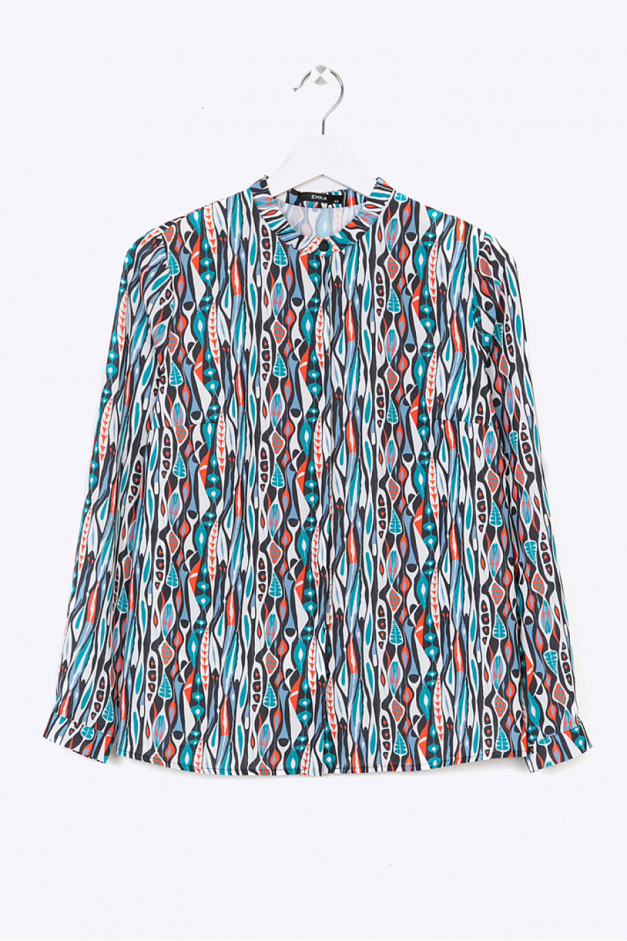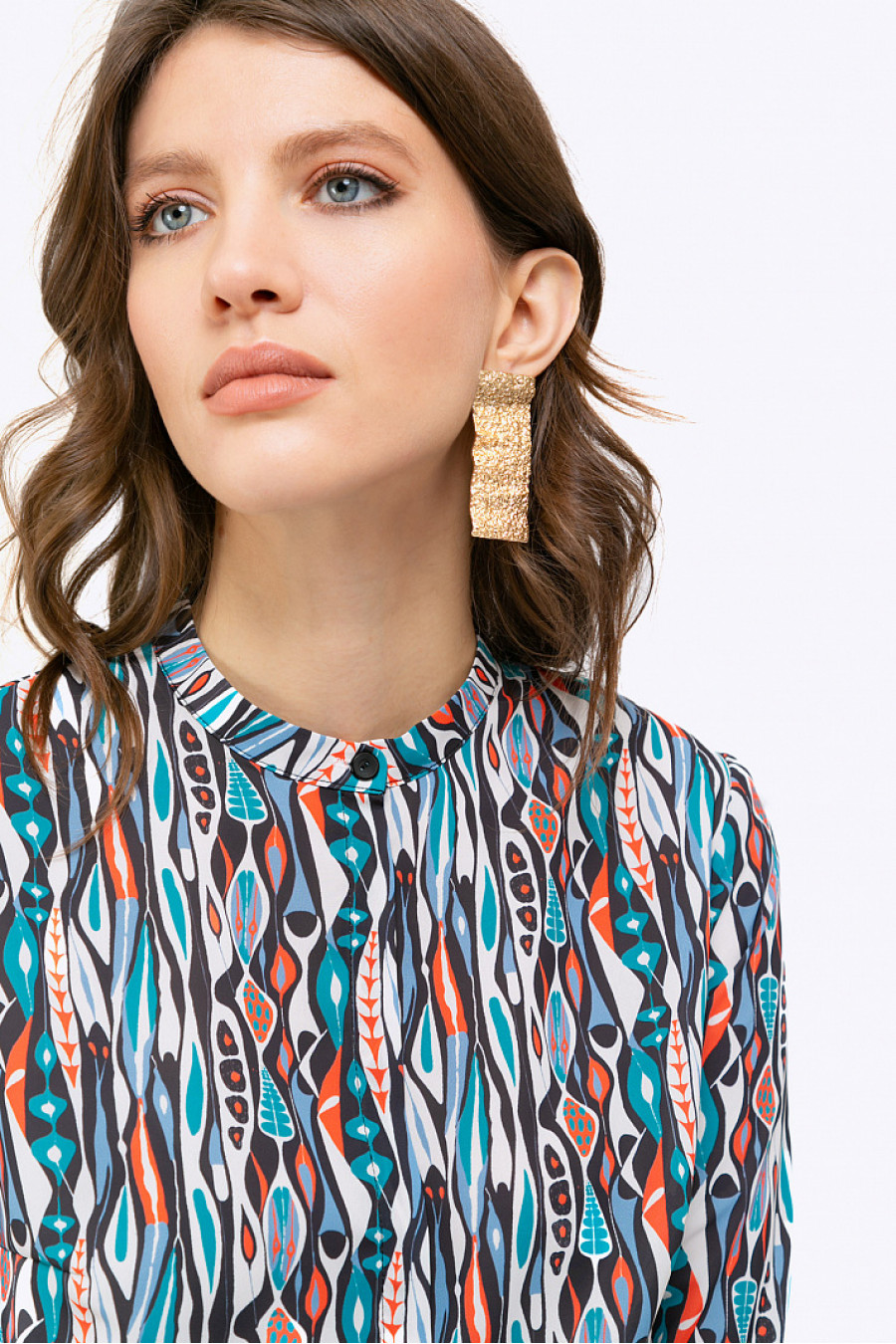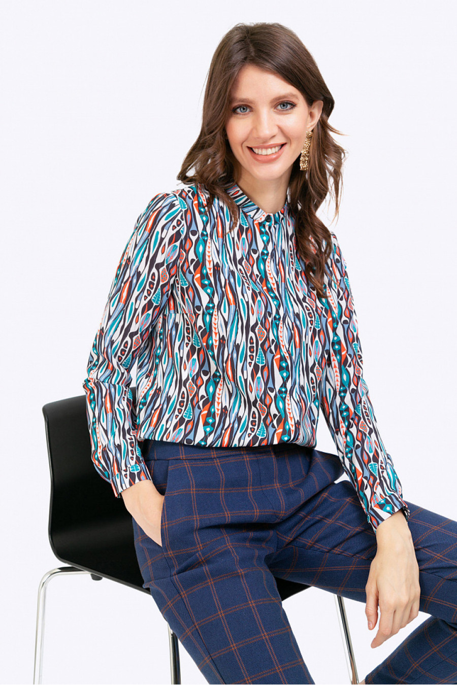 Блузка с ярким принтом. Модель прямого кроя без воротника,с длинными рукавами. Блузка хорошо сидит по фигуре. Рост фотомодели 177 см.