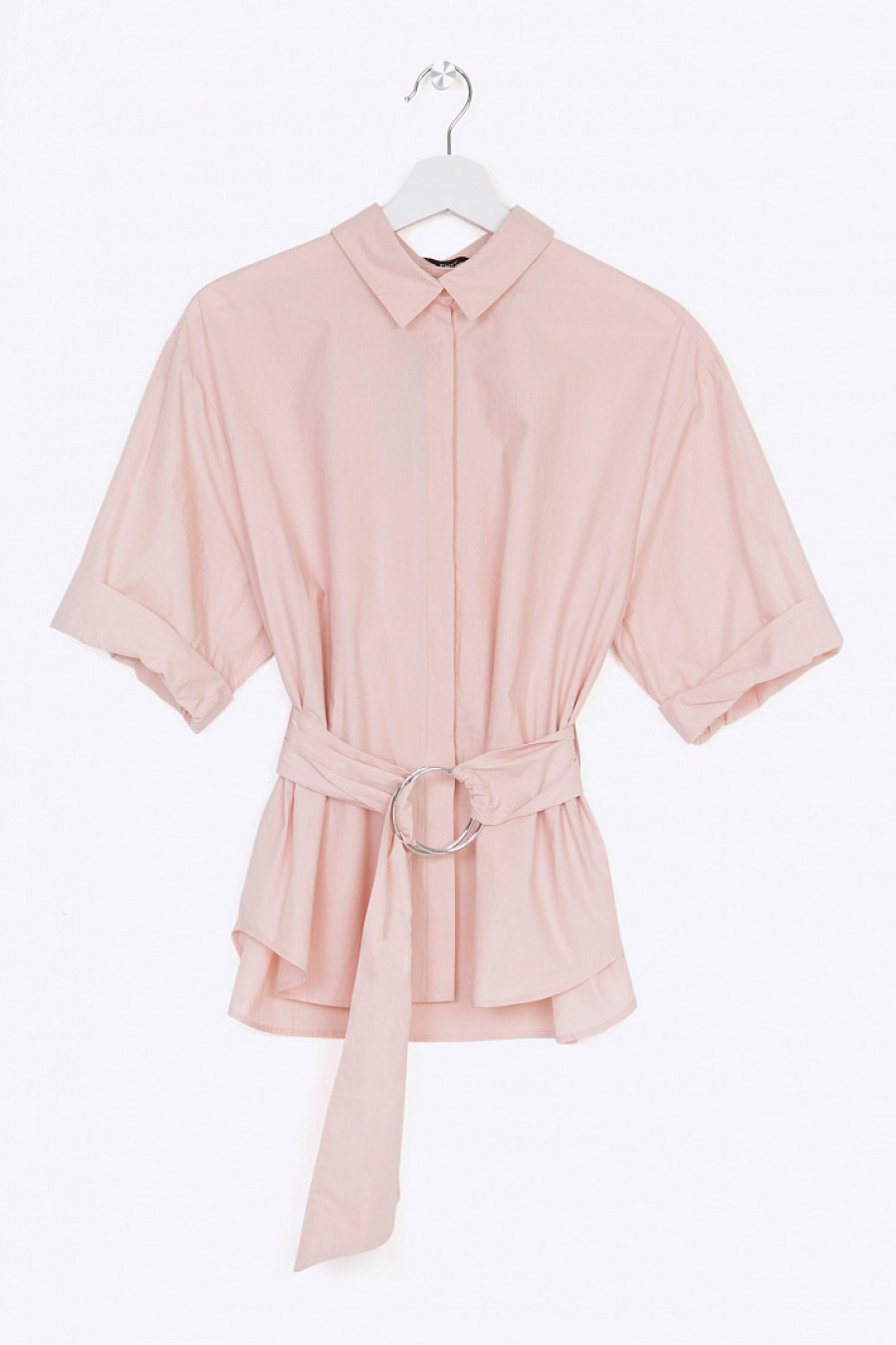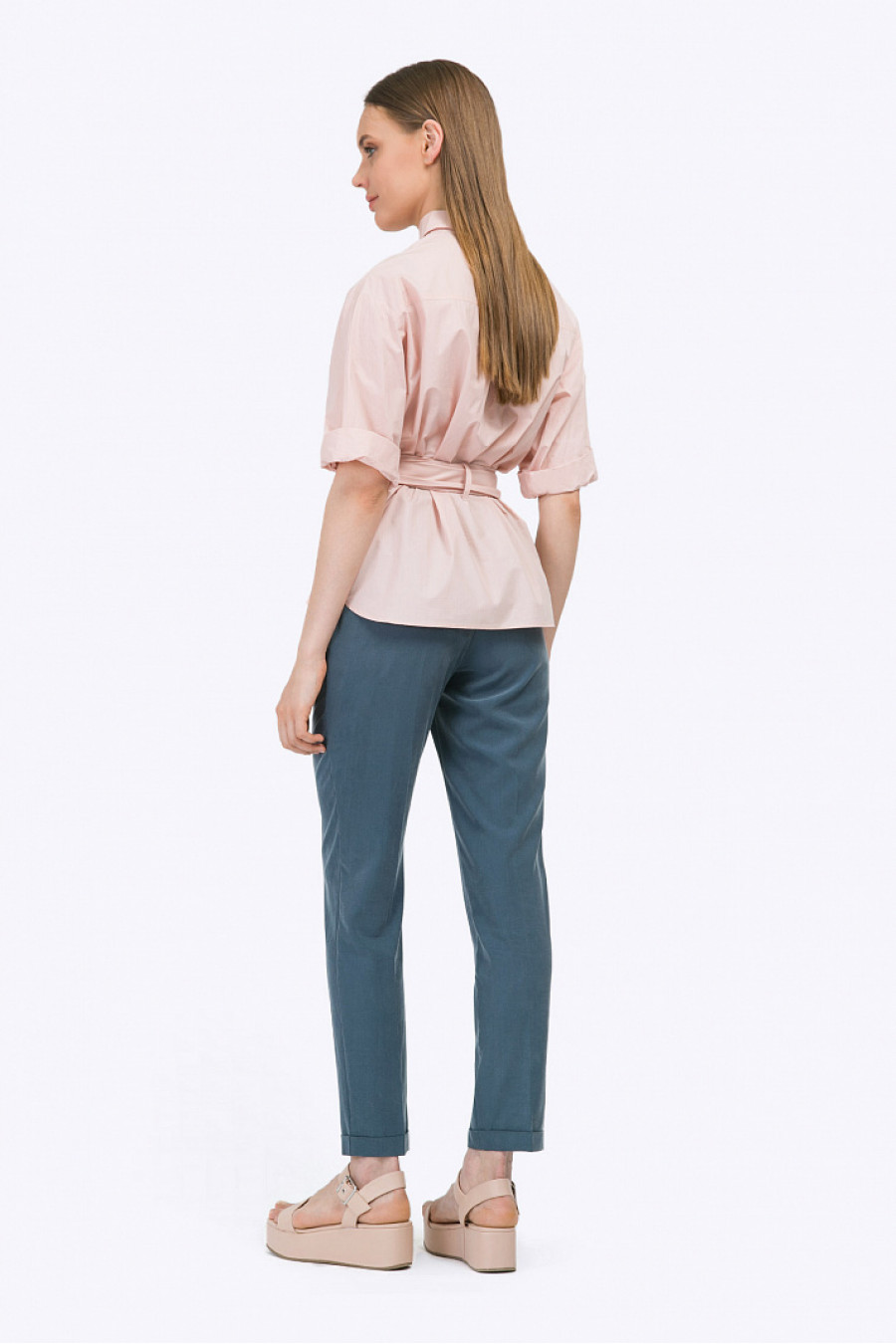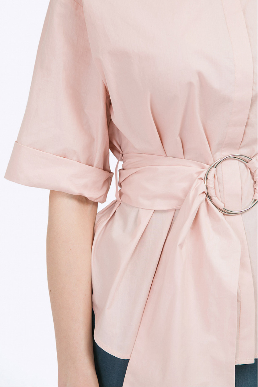 Блузка нежного персикового цвета из хлопка. Модель имеет свободный силуэт, фигурный подол, заниженную пройму, рукава до локтя с широкими отворотами, рубашечный ворот и закрытую застёжку спереди. Спинка модели украшена кокеткой и встречной складкой. Линия талии подчёркнута широким поясом, декорированным широкими металлическими кольцами. Образ на фото дополнен брюками D107-roksi . Рост фотомодели 173 см.