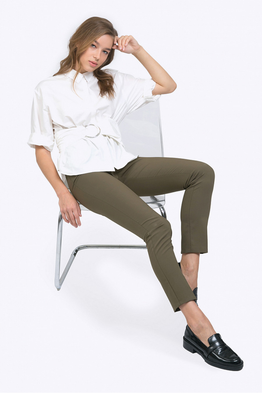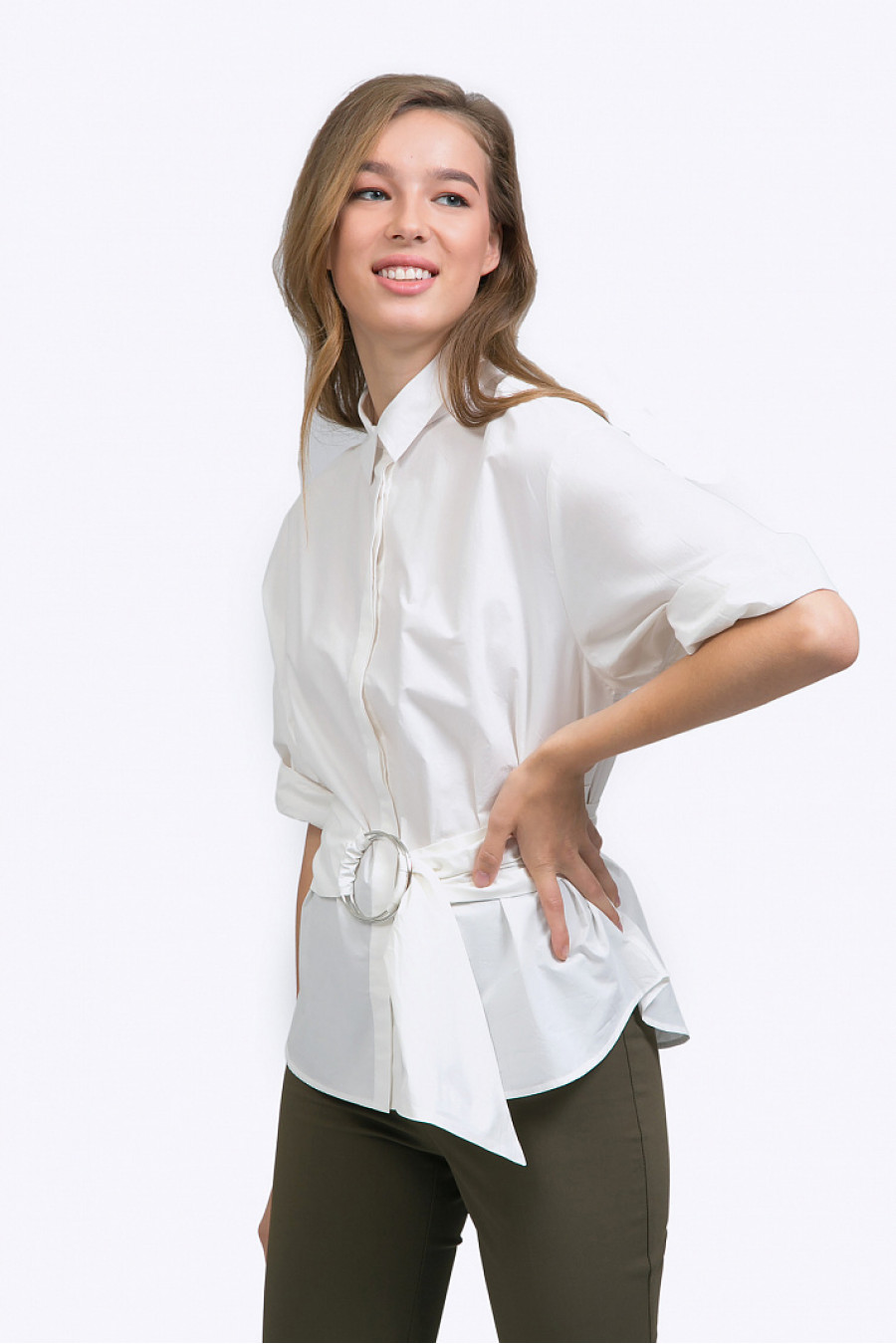 Белая блузка из хлопка с короткими рукавами. Модель имеетсвободное облегание, фигурный подол, рубашечный ворот и скрытую застёжку-планку. Наспинка имеется кокетка и встречная складка. Рукава с заниженной проймой дополненыотворотами. Линия талии подчёркнута широким поясом с крупным металлическим кольцом. Образ а фото дополнен брюками D052-rise .Рост фотомодели 177 см.