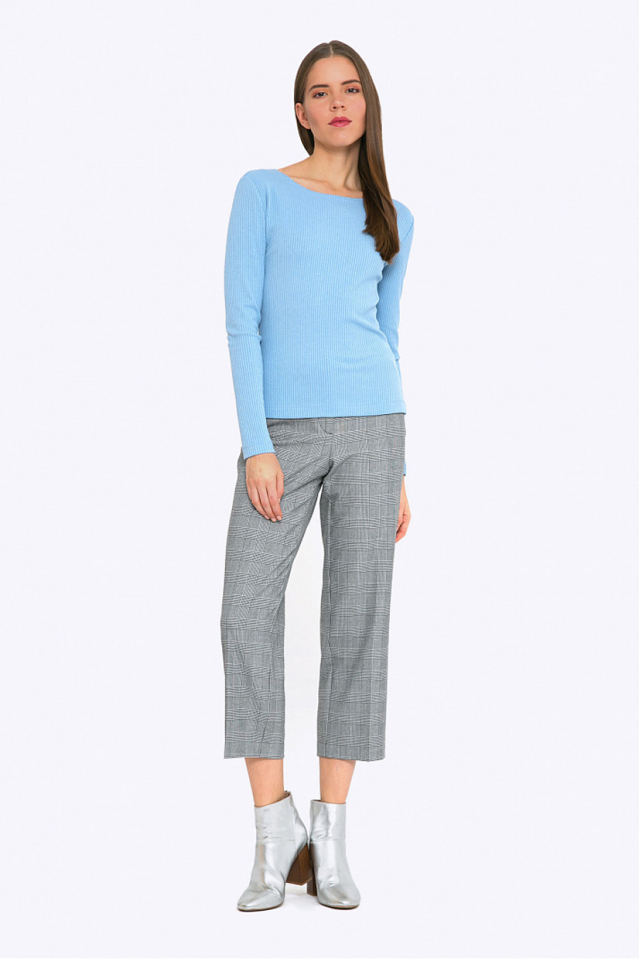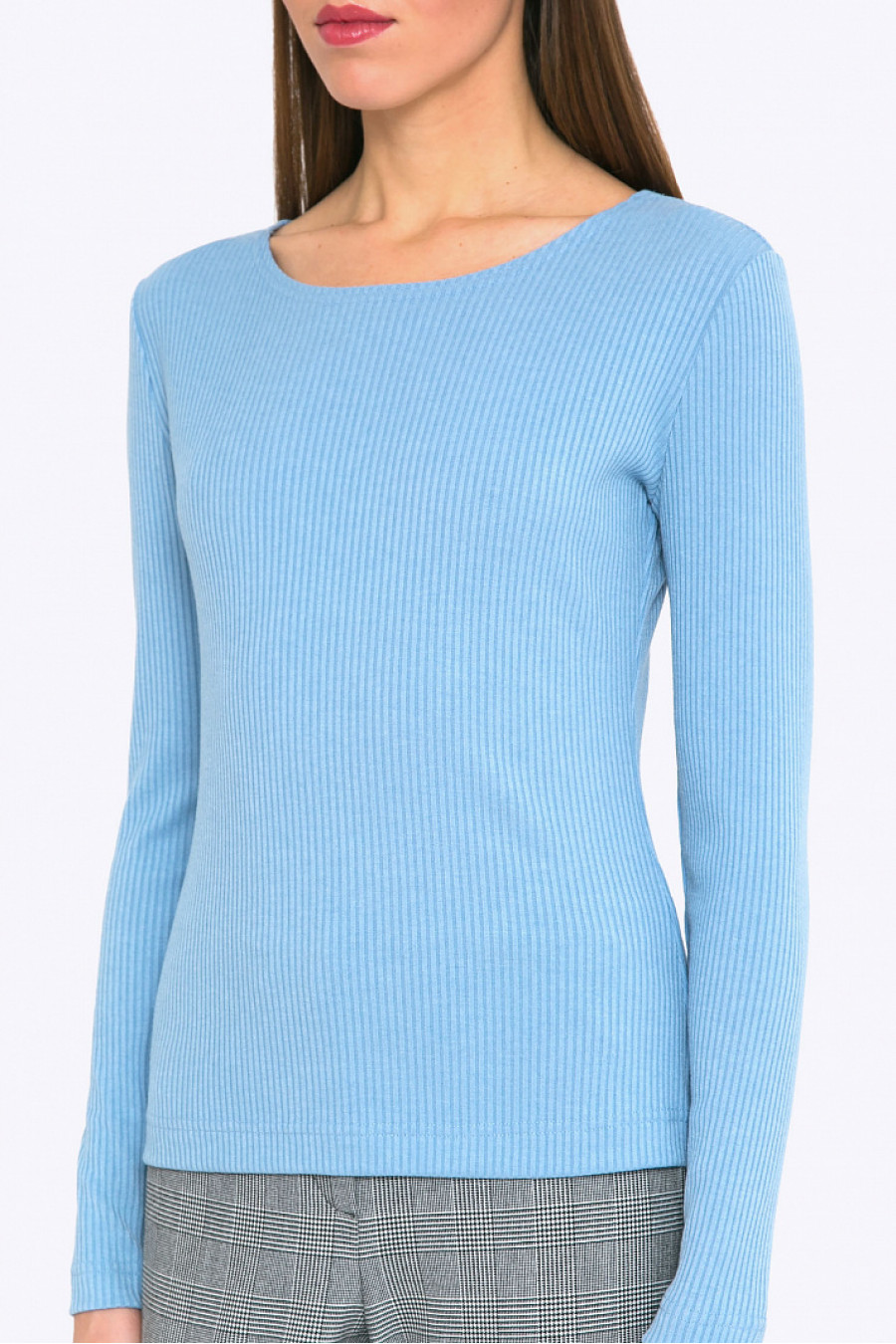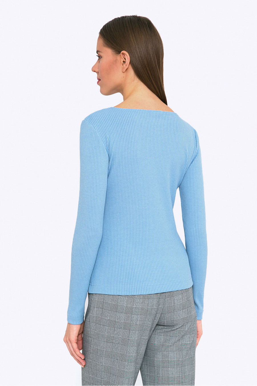 Обтягивающая блуза лаконичного фасона с открытым воротом - отличное решение для создания универсальных комплектов одежды. Она пригодится как к офисным брюкам или юбкам классического стиля, так и к спортивному костюму. Используя, например, нарядный белый жилет с меховыми вставками и юбку-макси из богатой ткани - можно получить неординарный вечерний образ. Нежный оттенок летнее небо сделает look гармоничным, цвет прекрасно будет смотреться на блондинках, золотоволосых. Мягкий трикотаж из смесовой ткани с содержанием вискозы приятен в носке и прост в уходе. Образ на фото дополнен Брюками D072-oxford. Рост фотомодели 178 см.