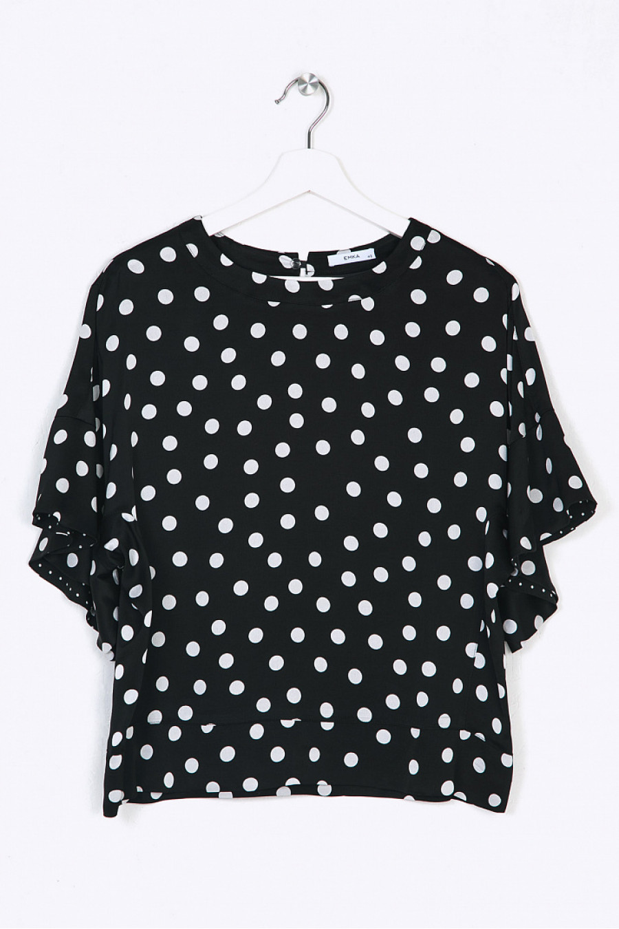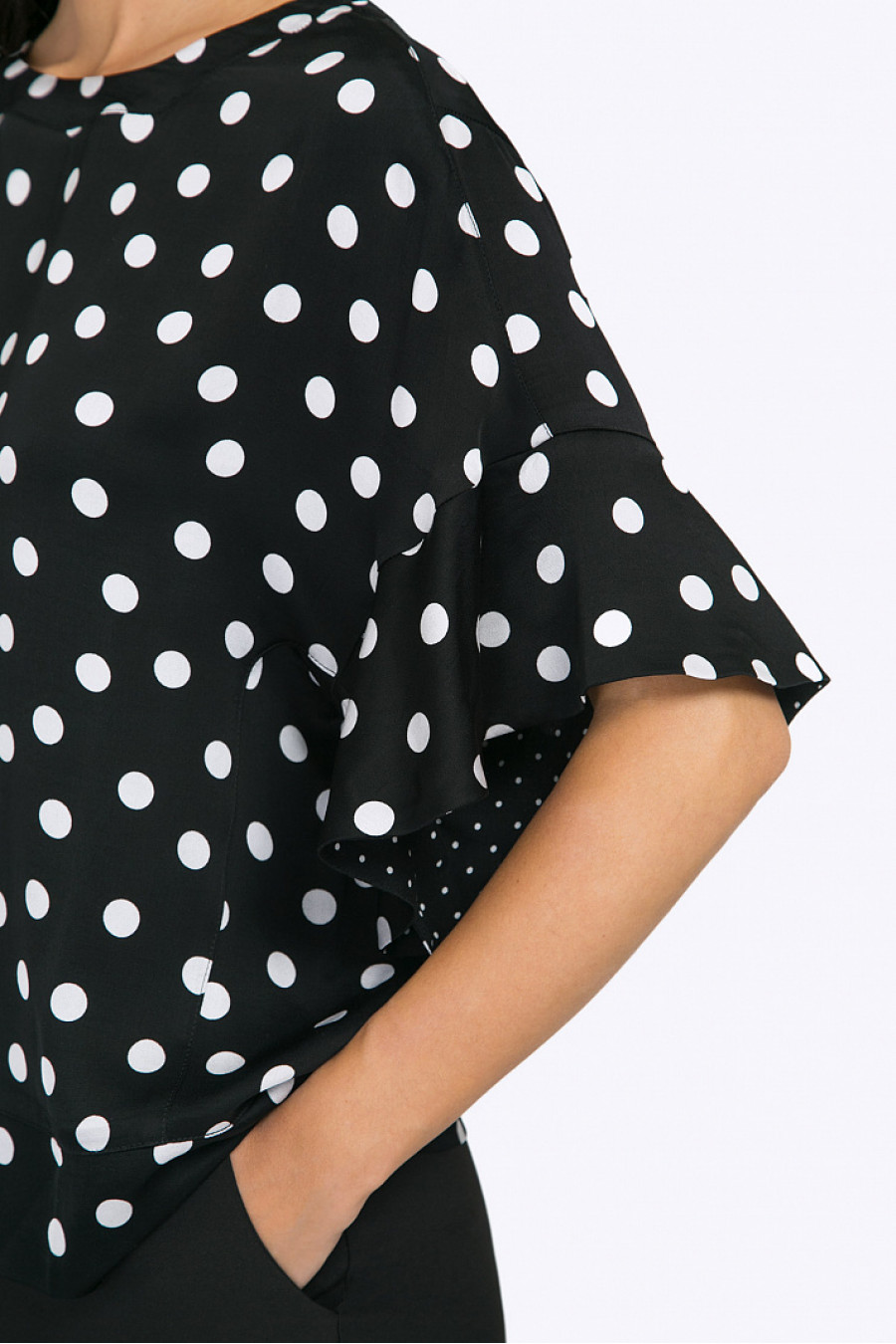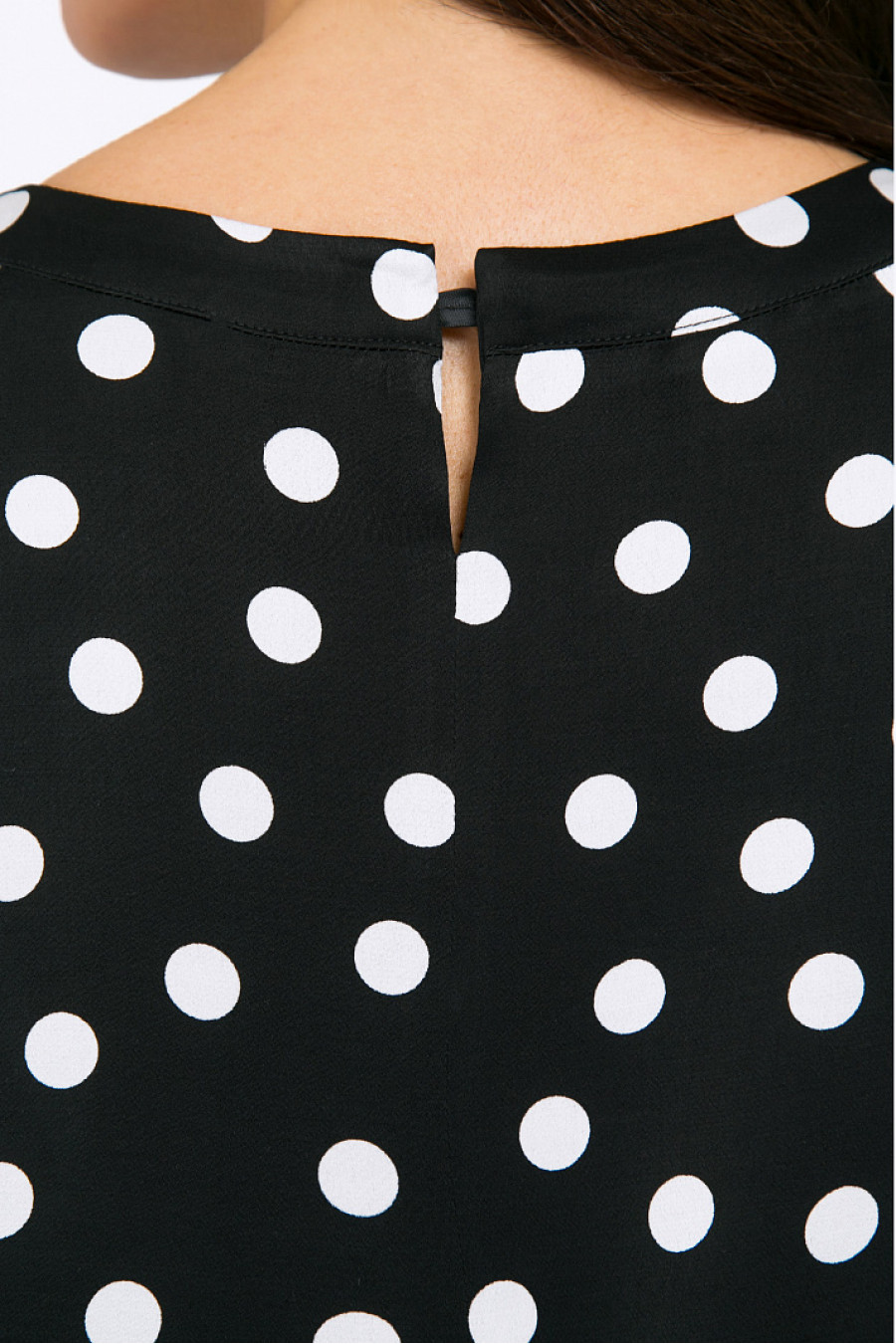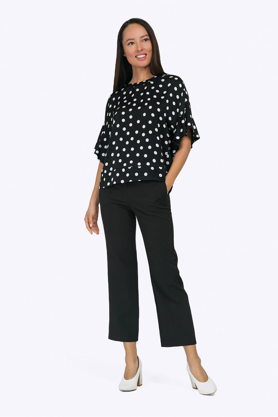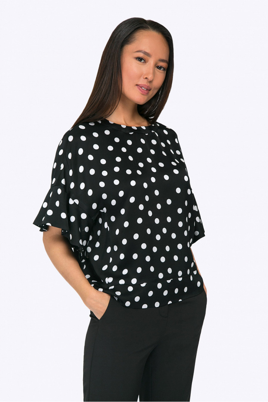 Блузон из лёгкой вискозы с классическим монохромным принтом «горошек» вчёрно-белой цветовой гамме. Модель имеет свободное облегание, круглый вырез горловины оформлен бейкой и сзади застёгивается на пуговичку. Короткие цельнокроеные рукава дополнены широкой оборкой. Образ на фото дополнен брюками D099-premiera . Рост фотомодели 175см.