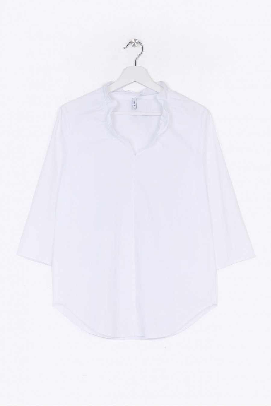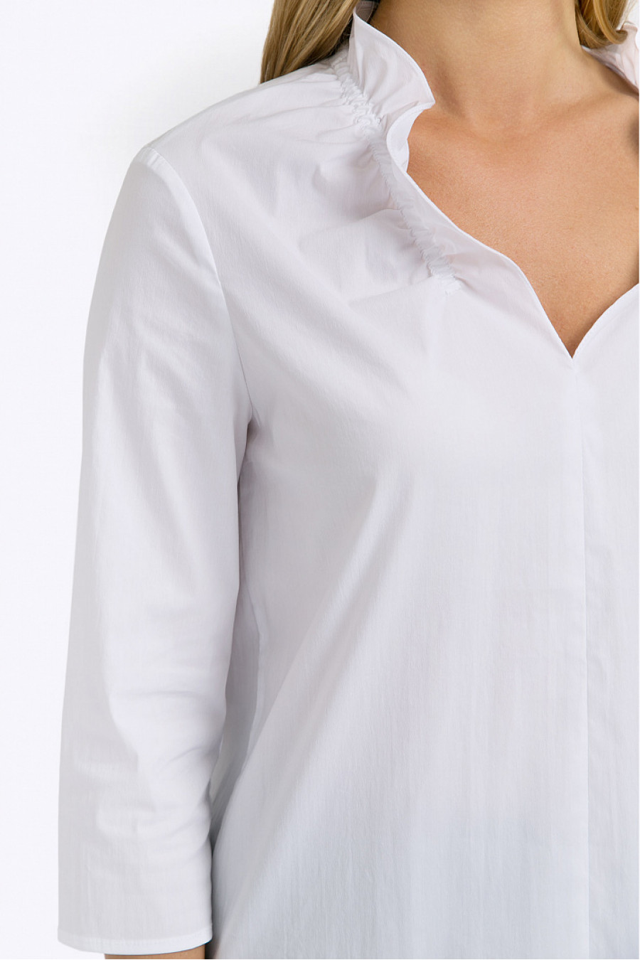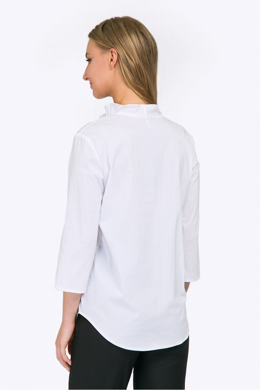 Белая блузка из стрейч-коттона. Модель свободного облегания, с фигурно выполненным подолом, рукавами ¾. Основным элементом декора служит оригинально выполненный V-образный вырез горловины,декорированный небольшой оборкой. Образ на фото дополнен брюками D102-djolin . Рост фотомодели 177 см.