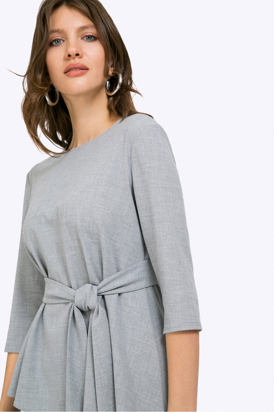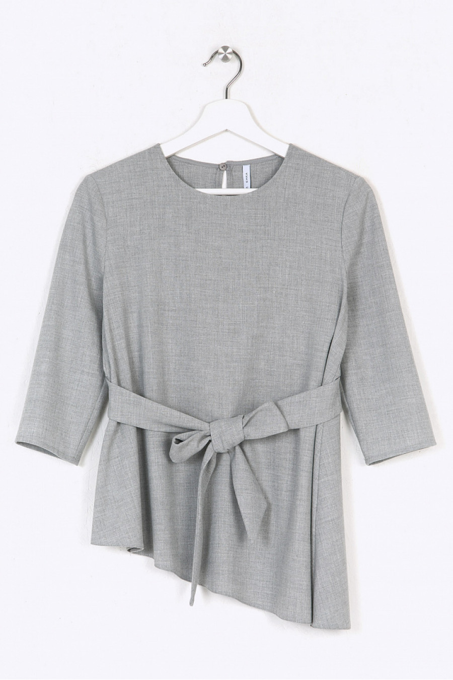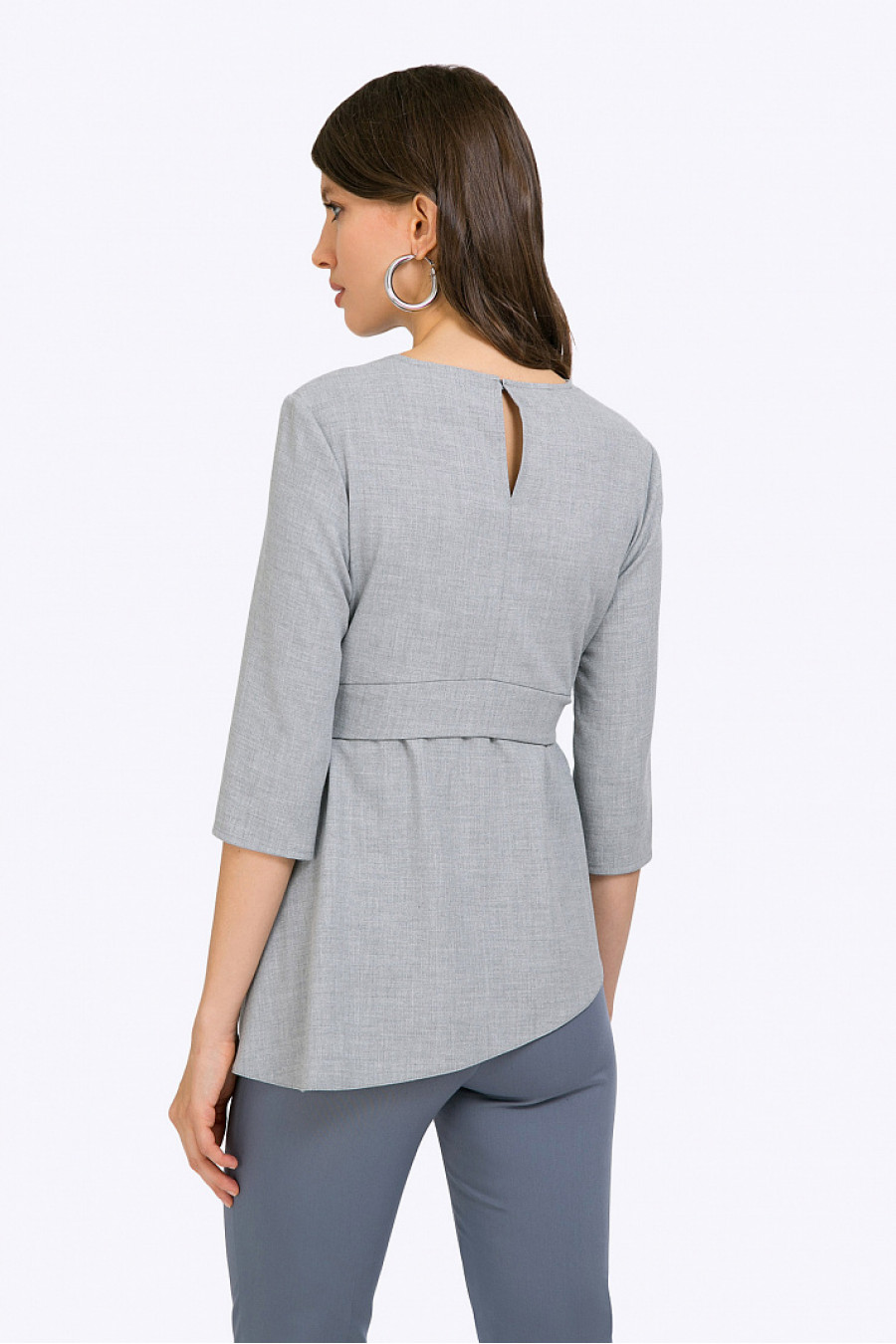 Деловая блузка благородного цвета. Модель со свободным облеганием по фигуре, рукавами ¾, ассиметричной линией подола. Имеет круглый вырез горловины и застёжку на пуговку в заднем среднем шве. Длинный пояс притачан на спинке на уровне завышенной линии талии и при завязывании образует красивые мягкие сладки. Рост фотомодели 177 см.