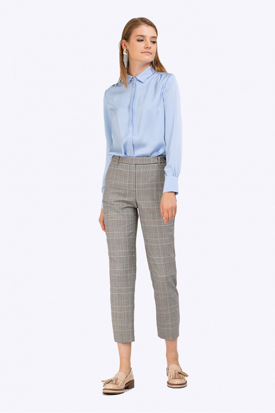 Блузка из струящейся поливискозы. Модель прямого кроя, свободно облегает фигуру. Блузка имеет отложной воротник, закрытую застежку-планку спереди, длинные рукава, дополненные широкими манжетами с обтянутыми тканью пуговичками. Рост фотомодели 177 см.