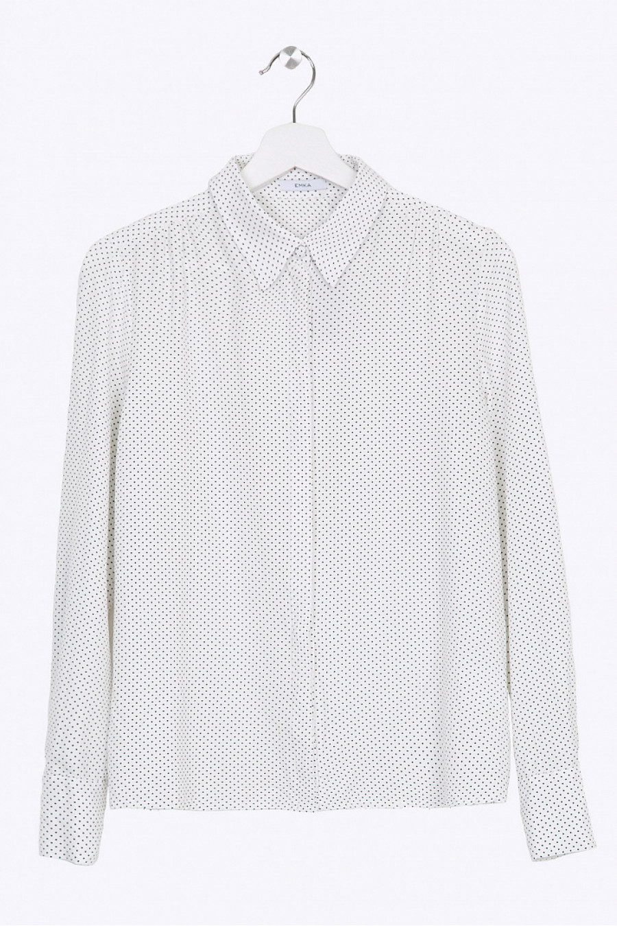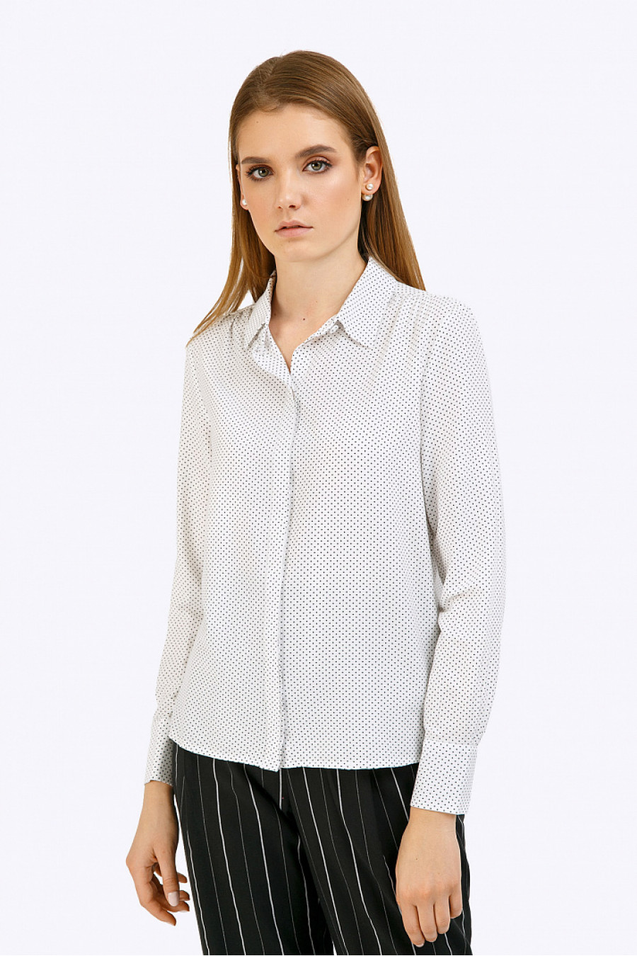 Блузка из струящейся поливискозы. Модель прямого кроя, свободно облегает фигуру. Блузка имеет отложной воротник, закрытую застежку-планку спереди, длинные рукава, дополненные широкими манжетами с обтянутыми тканью пуговичками. Рост фотомодели 177 см.